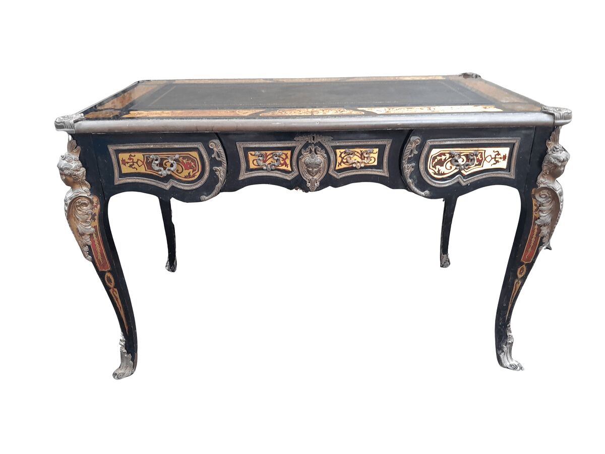 A French Style Louis XV Boulle Bureau Plat Writing Desk with Ormolu Mounts and Leather Top with Gilt Edging and Tooling