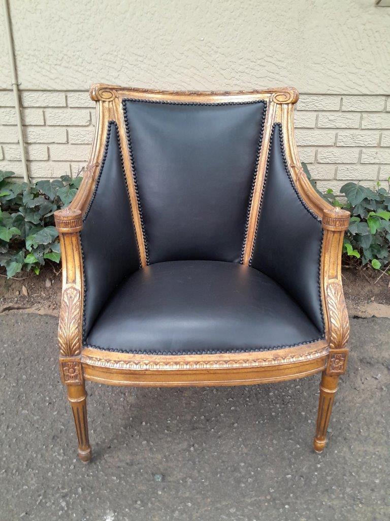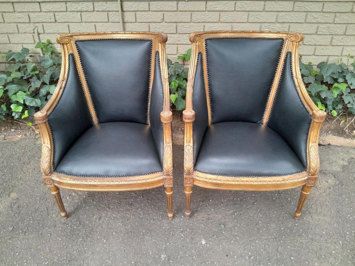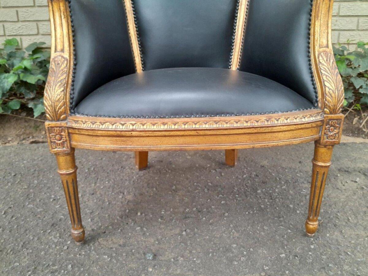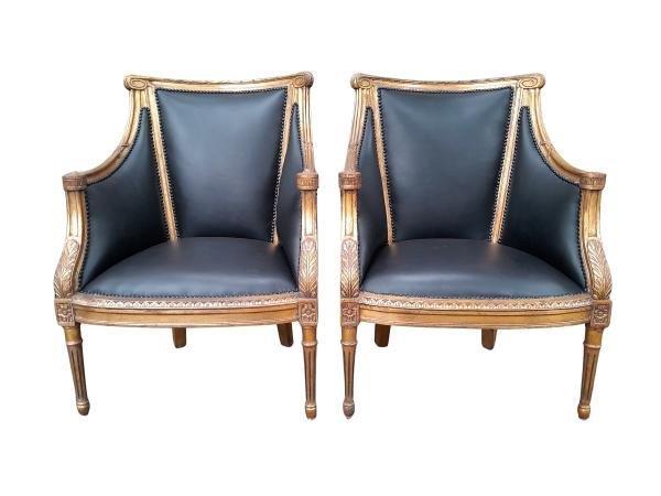 A French Style Pair Of Carved And Gilded Bergere Chairs Upholstered In Leather