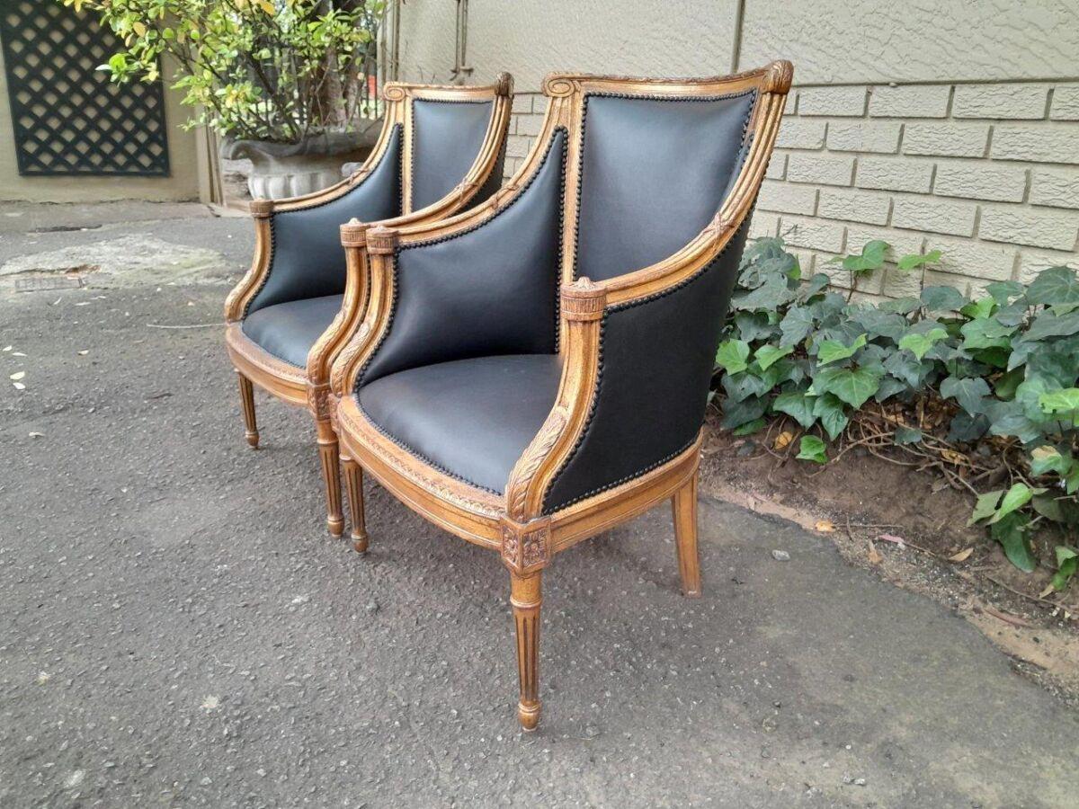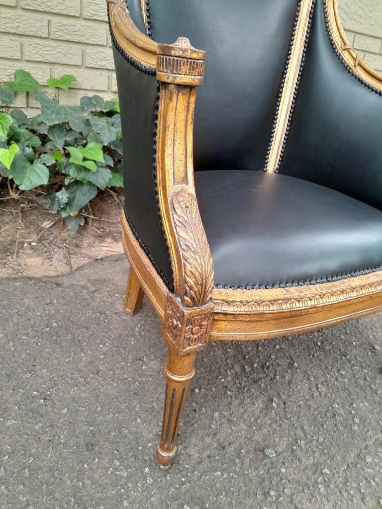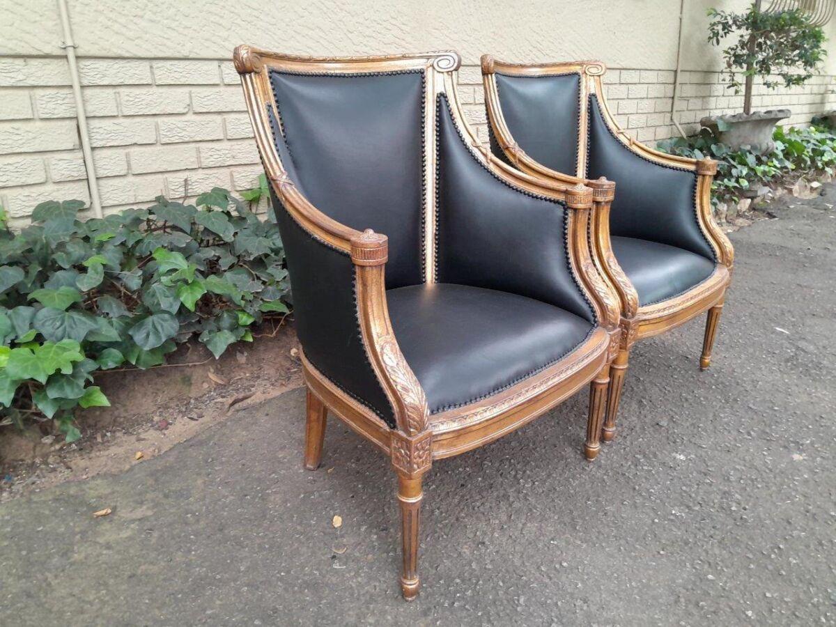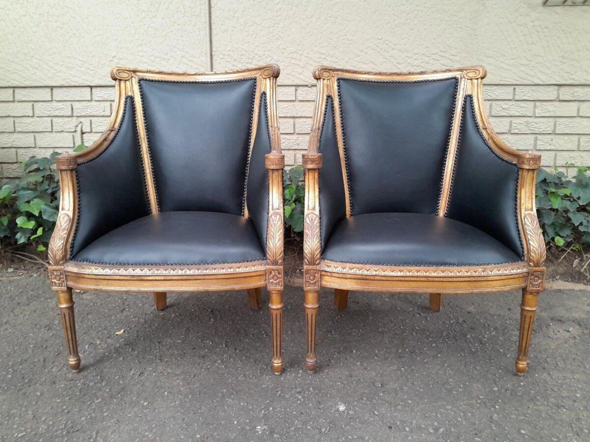A French Style Pair Of Carved And Gilded Bergere Chairs Upholstered In Leather
