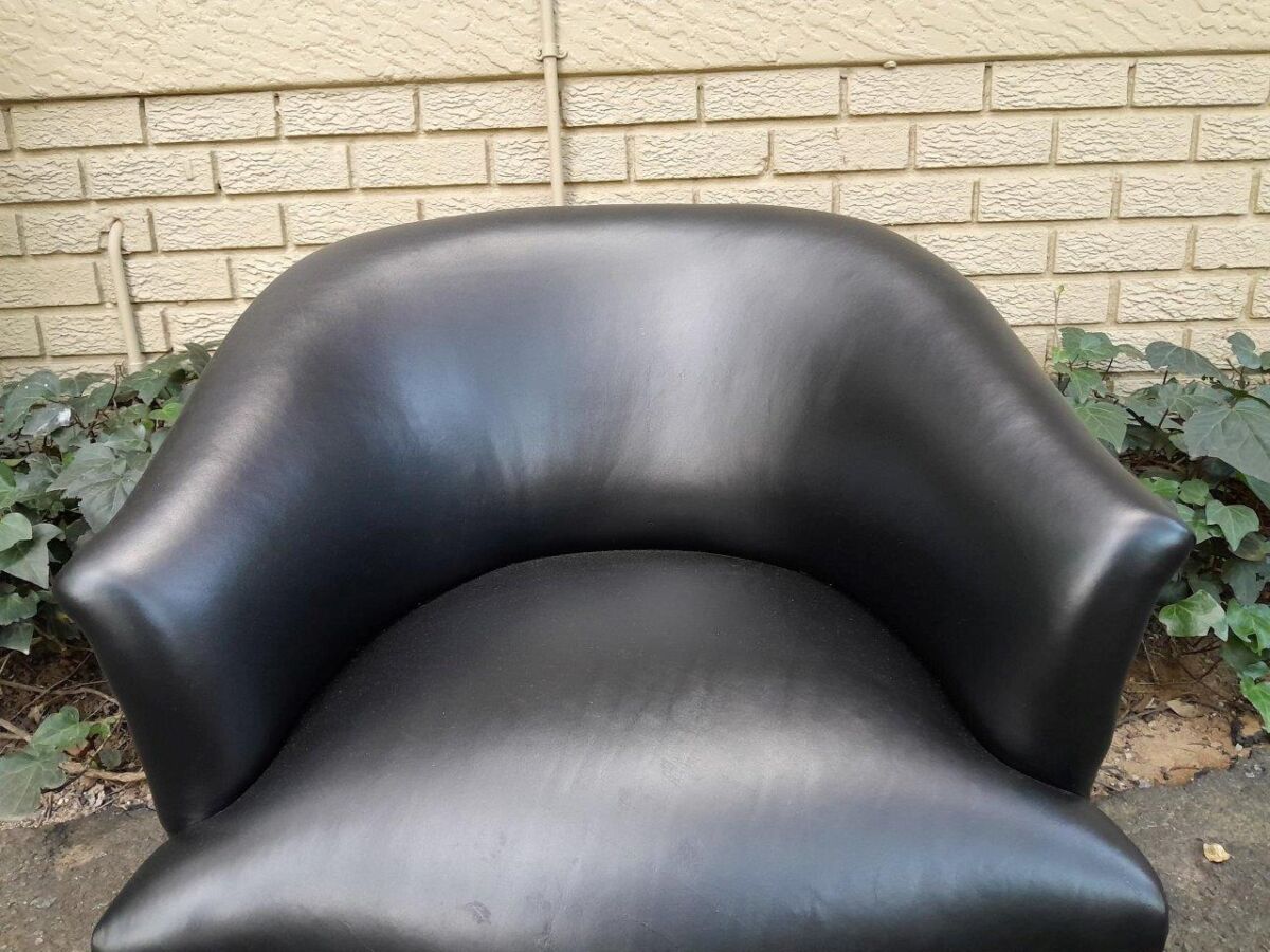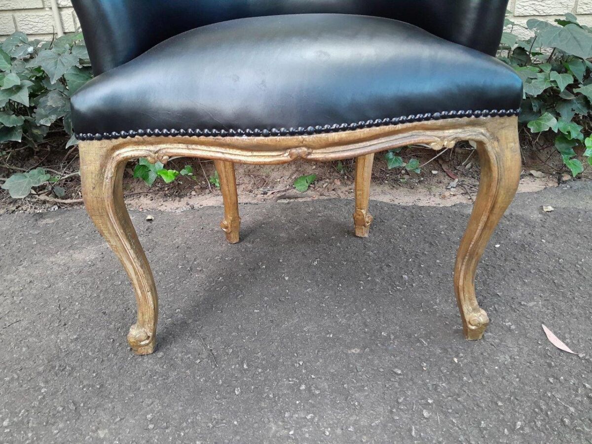 A French Style Pair of Carved Wooden and Hand-Gilded Tub Chairs Upholstered in Black Leather