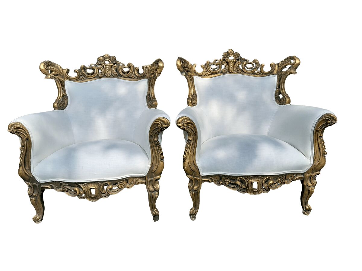 A French Style Pair of Ornately Carved Gilt Wood Armchairs