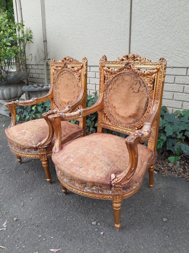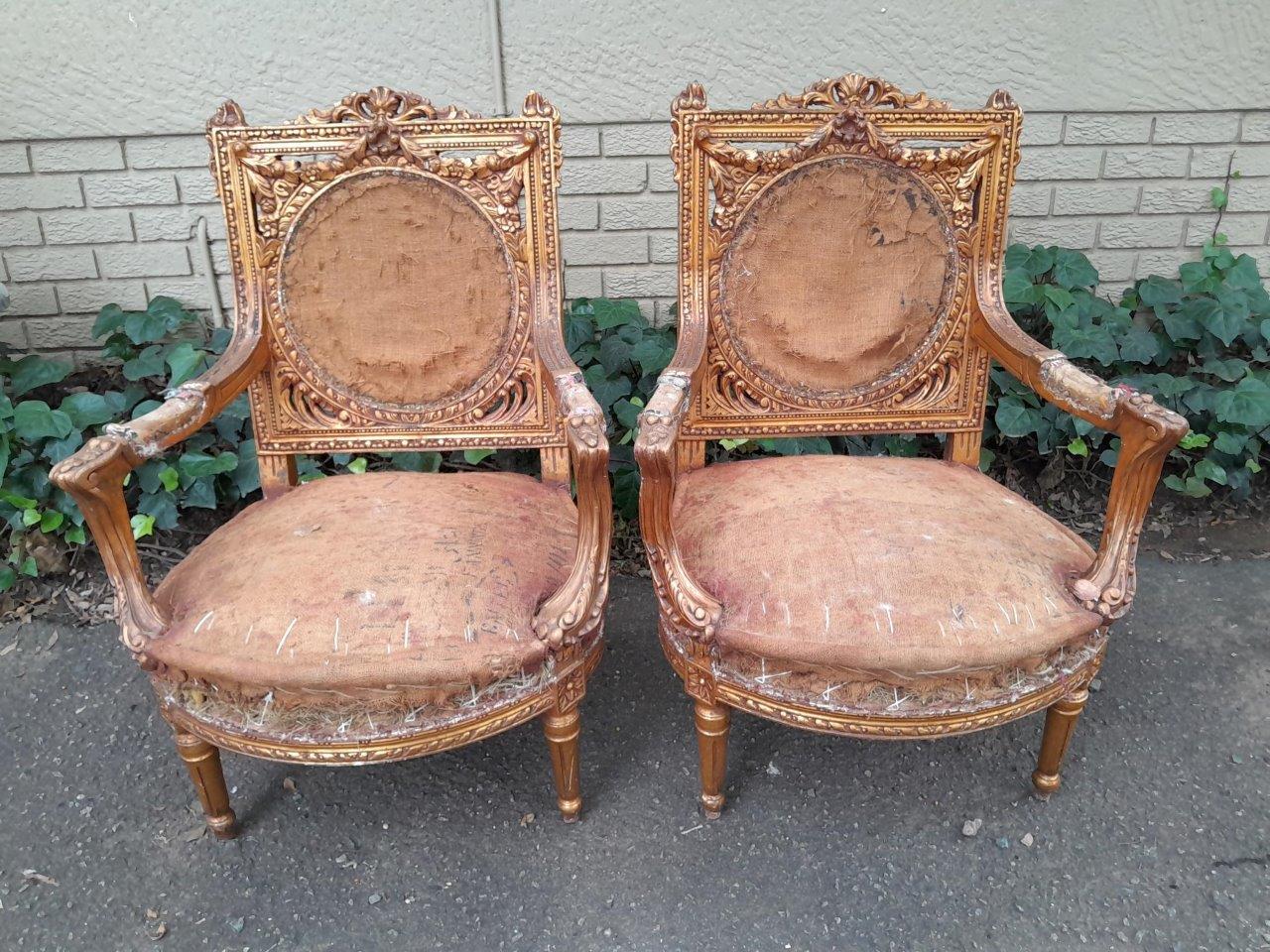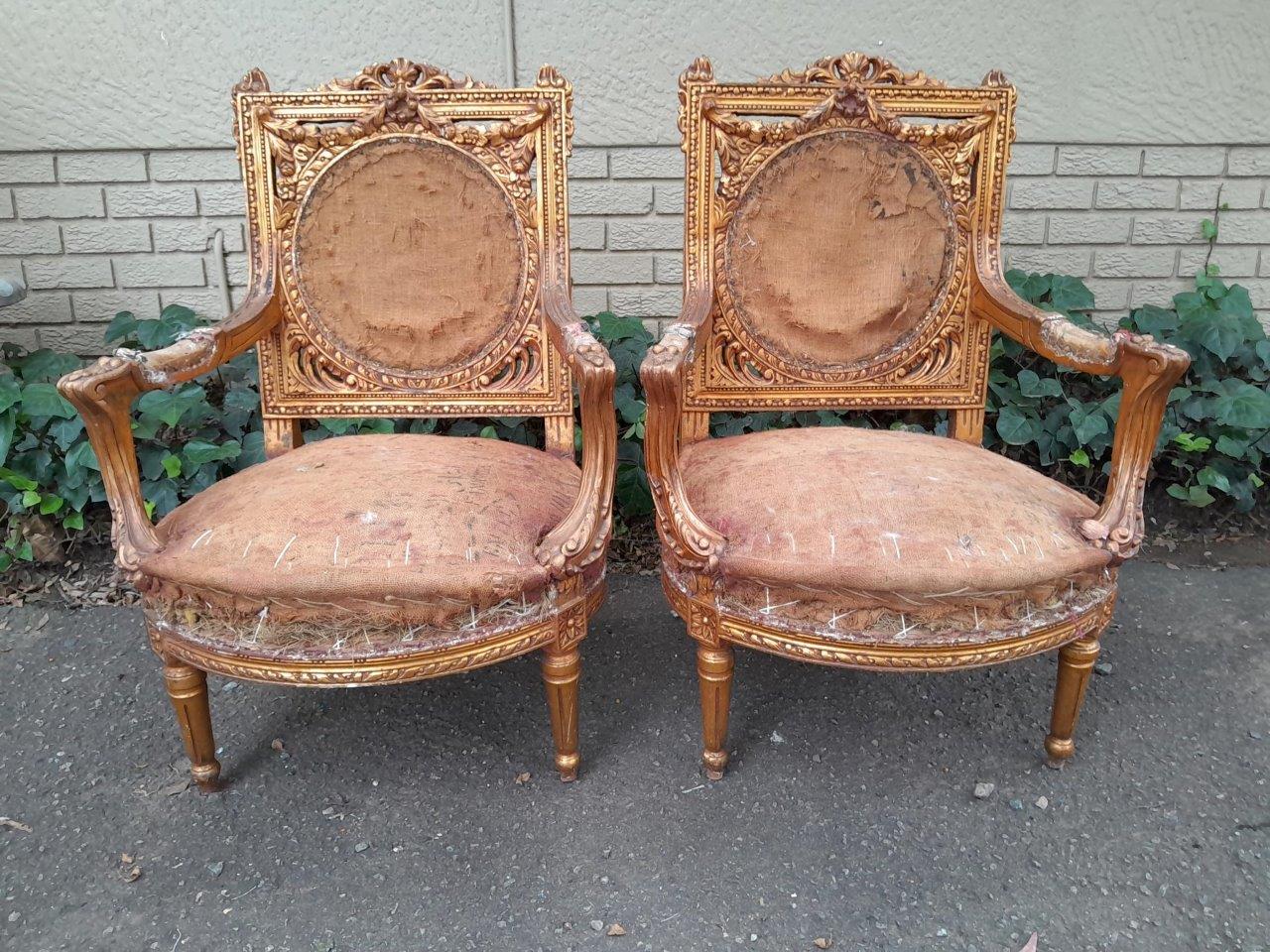 A French Style Pair Of Ornately Hand Carved And Gilded Arm Chairs (Still To Be Upholstered)