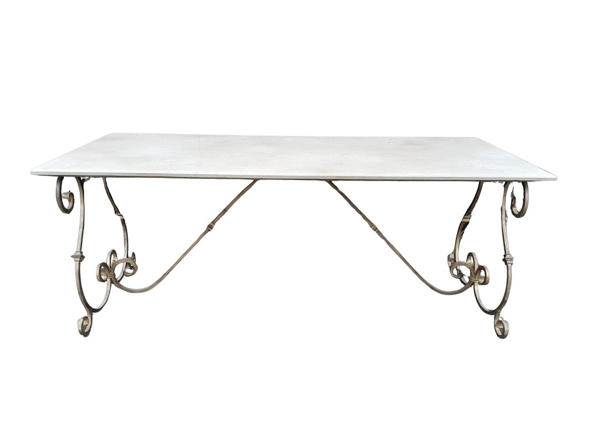 A French Style Wrought Iron Console / Dining Table in an Antique Gold Finish with Cream Marble Top Custom-made for The Crown Collection (8 Seater)
