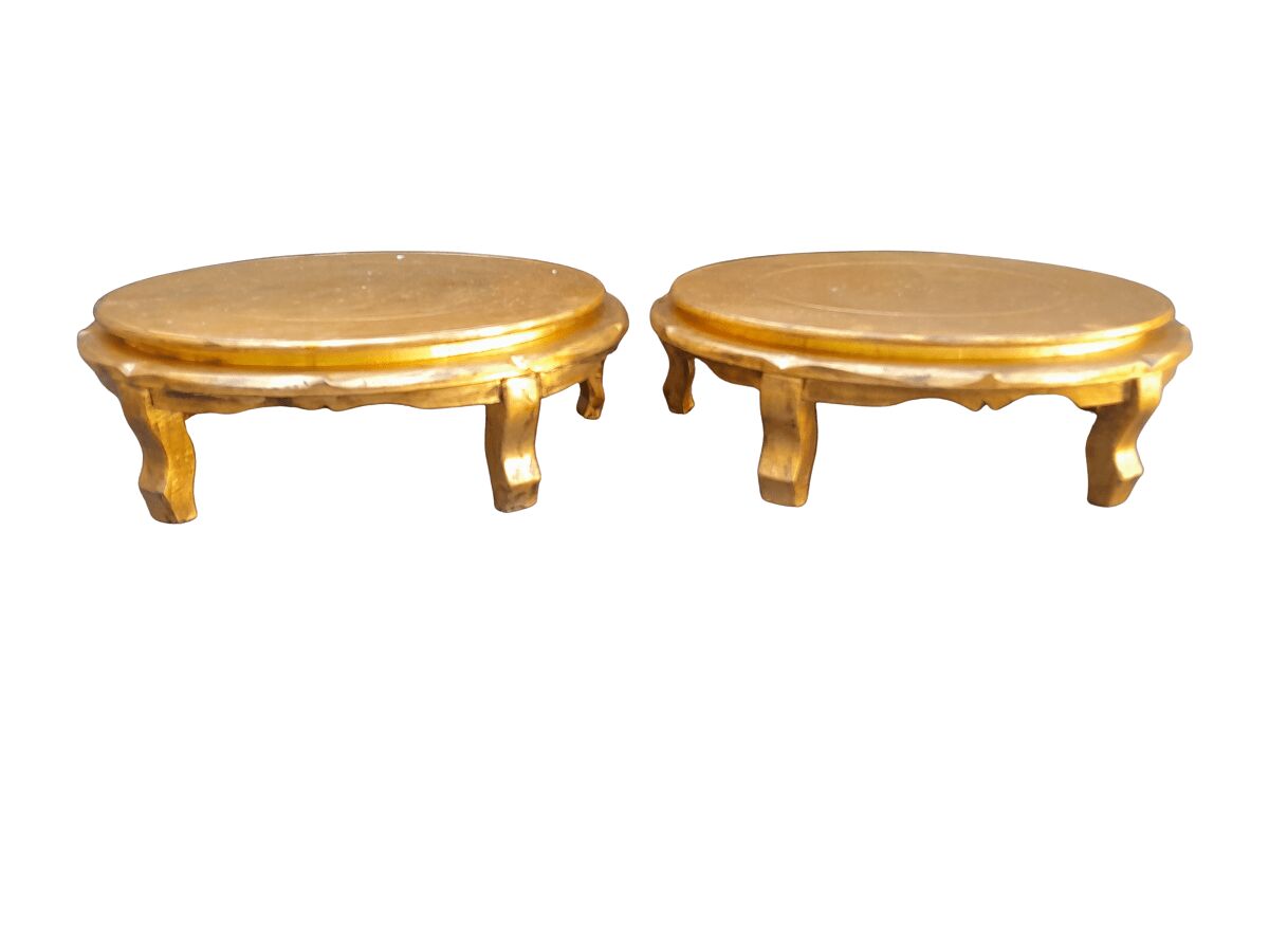 A Hand Gilded Pair Of Carved Wooden Foot Stools / Tuffets Upholstered In Deep Buttoned Leather