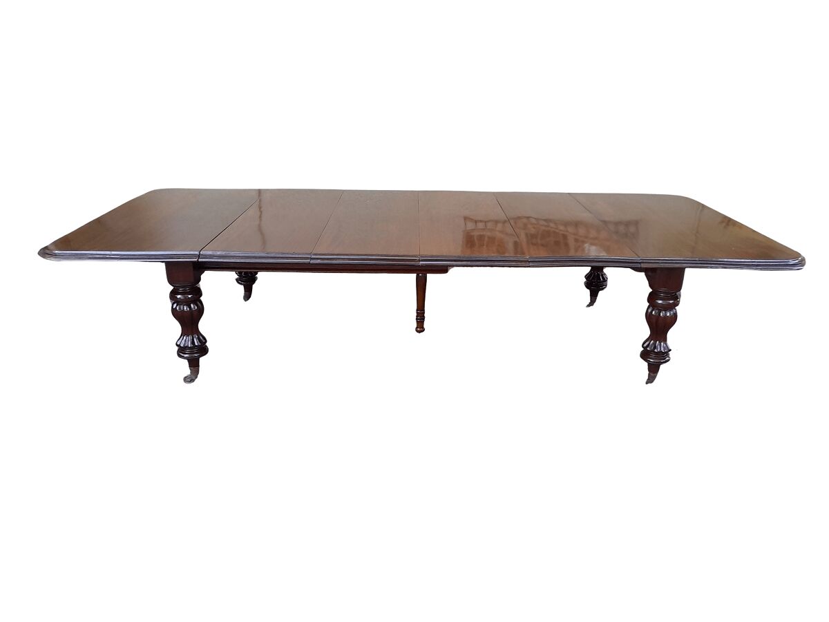 A Massive and Rare Victorian Mahogany Dining/Boardroom Extension table with Four Extensions and Fifth Supporting Leg in the Middle on Original Brass Castors (10-12 Seater)