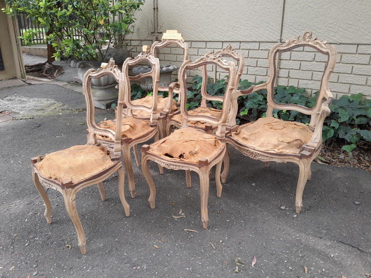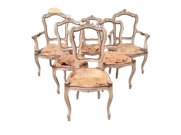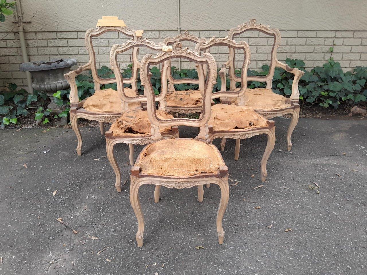A Mid 20th Century French Set Of Six Ornately Carved Walnut Dining Chairs In A Contemporary Bleached Finish And Upholstered In Leather
