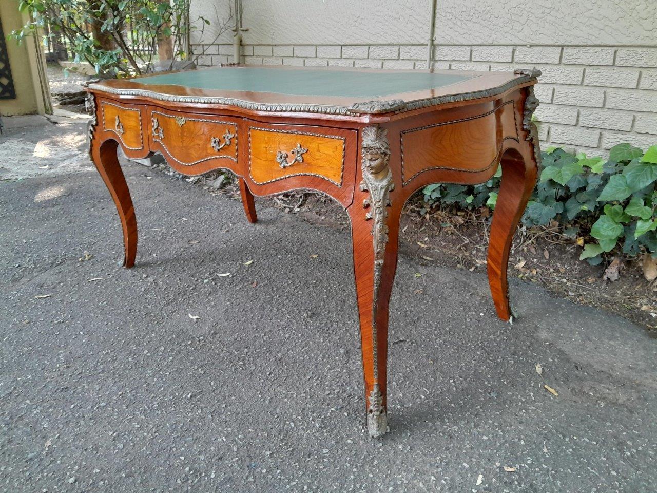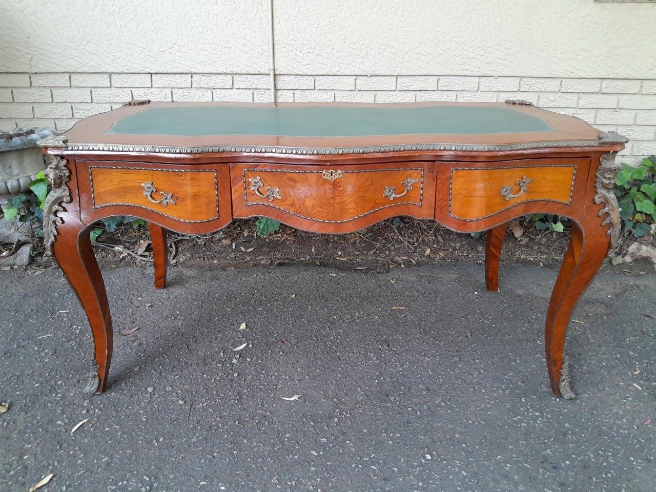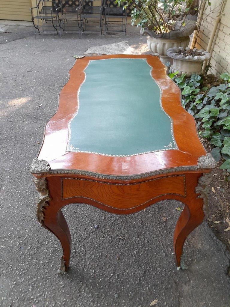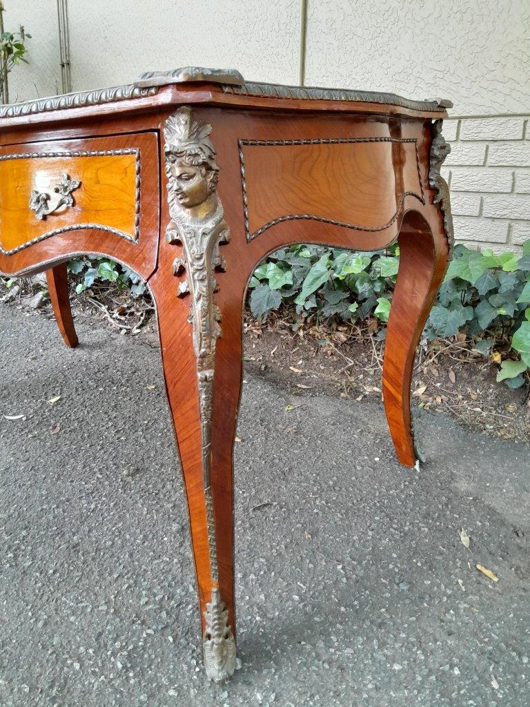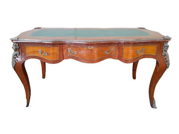 A Mid 20th Century Louis XV Style Walnut And Burr W Bureau Plat Writing Table / Desk, With Brass Mounts And Gilt Tooled Leather Top