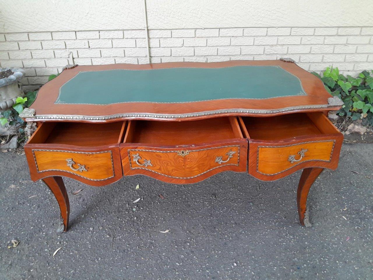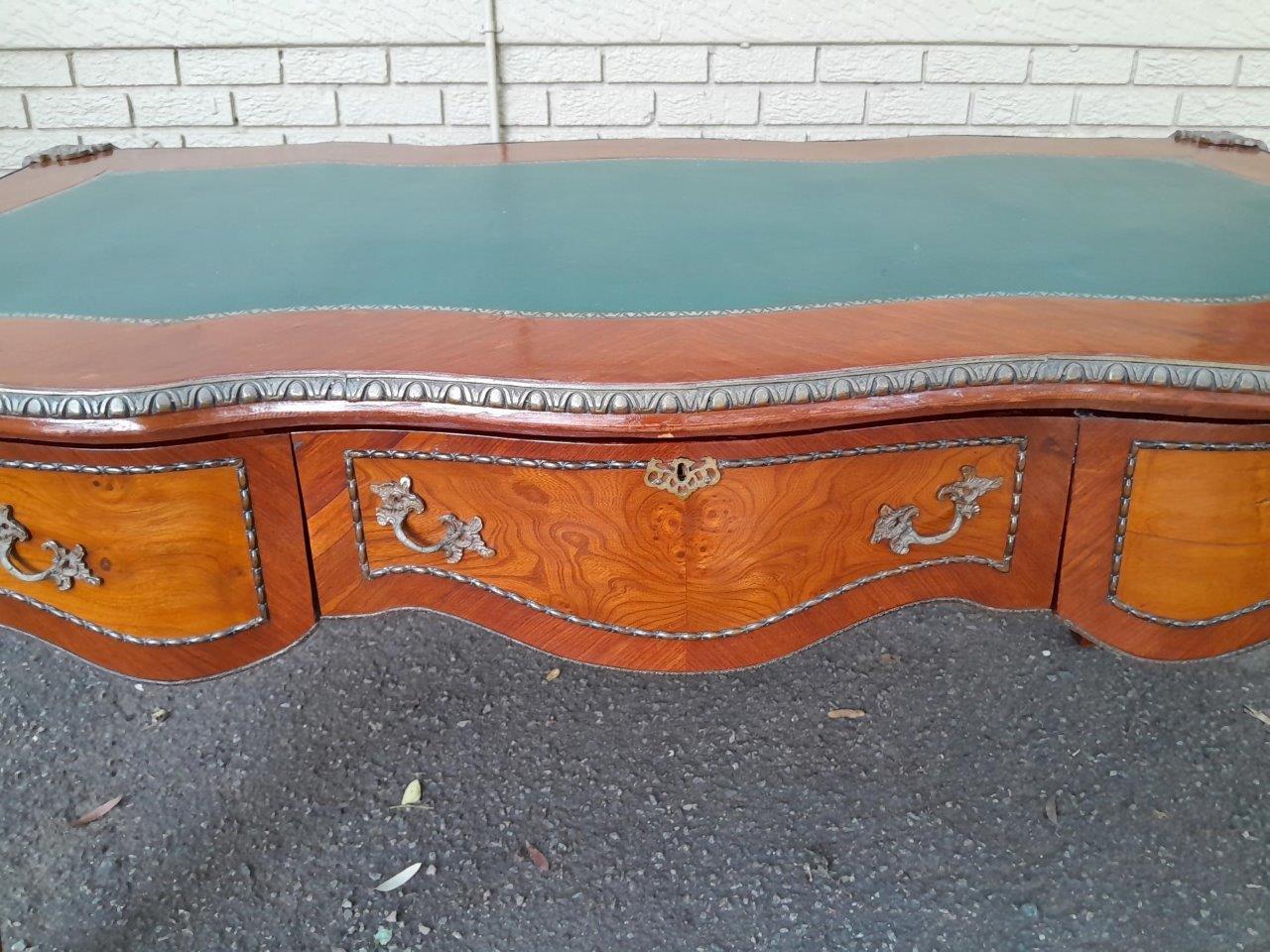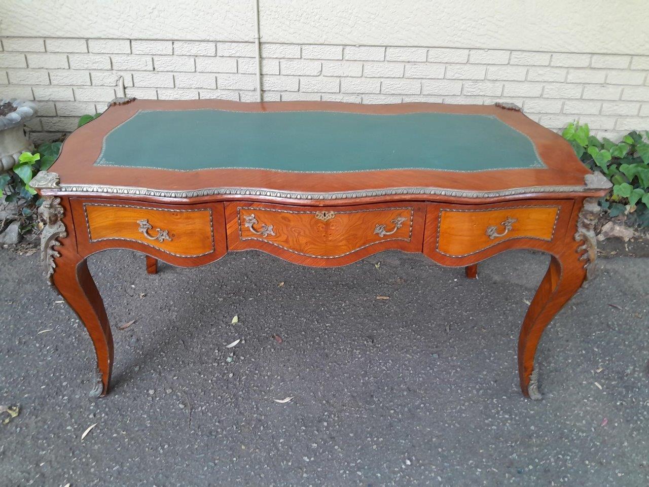 A Mid 20th Century Louis XV Style Walnut And Burr W Bureau Plat Writing Table / Desk, With Brass Mounts And Gilt Tooled Leather Top