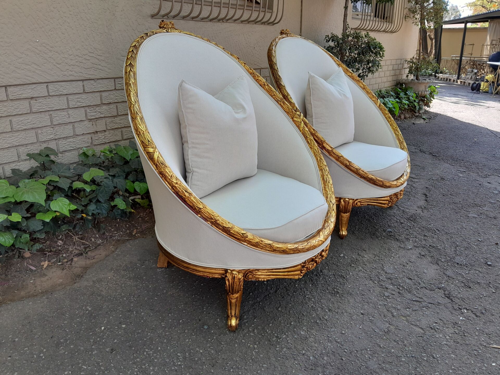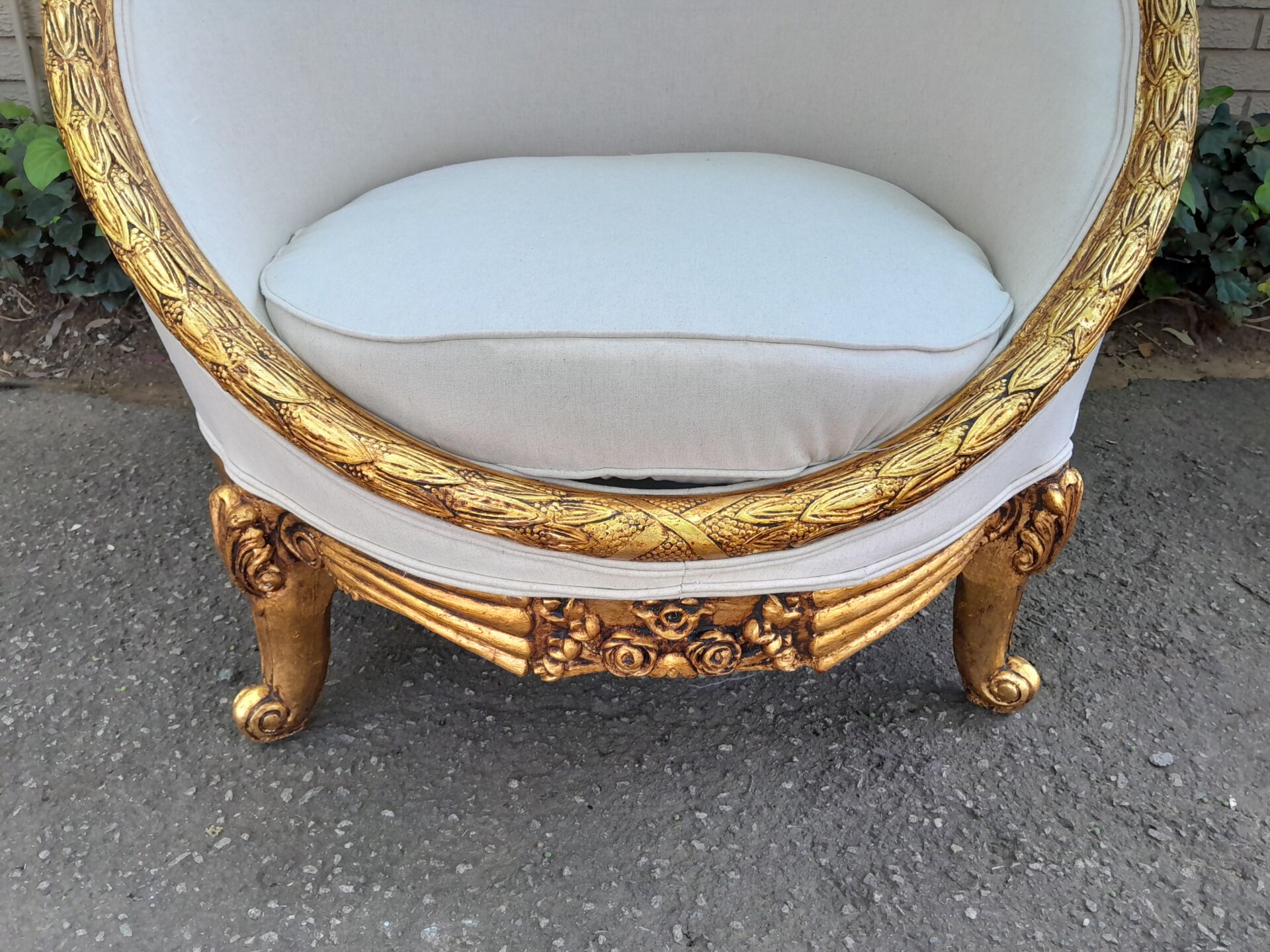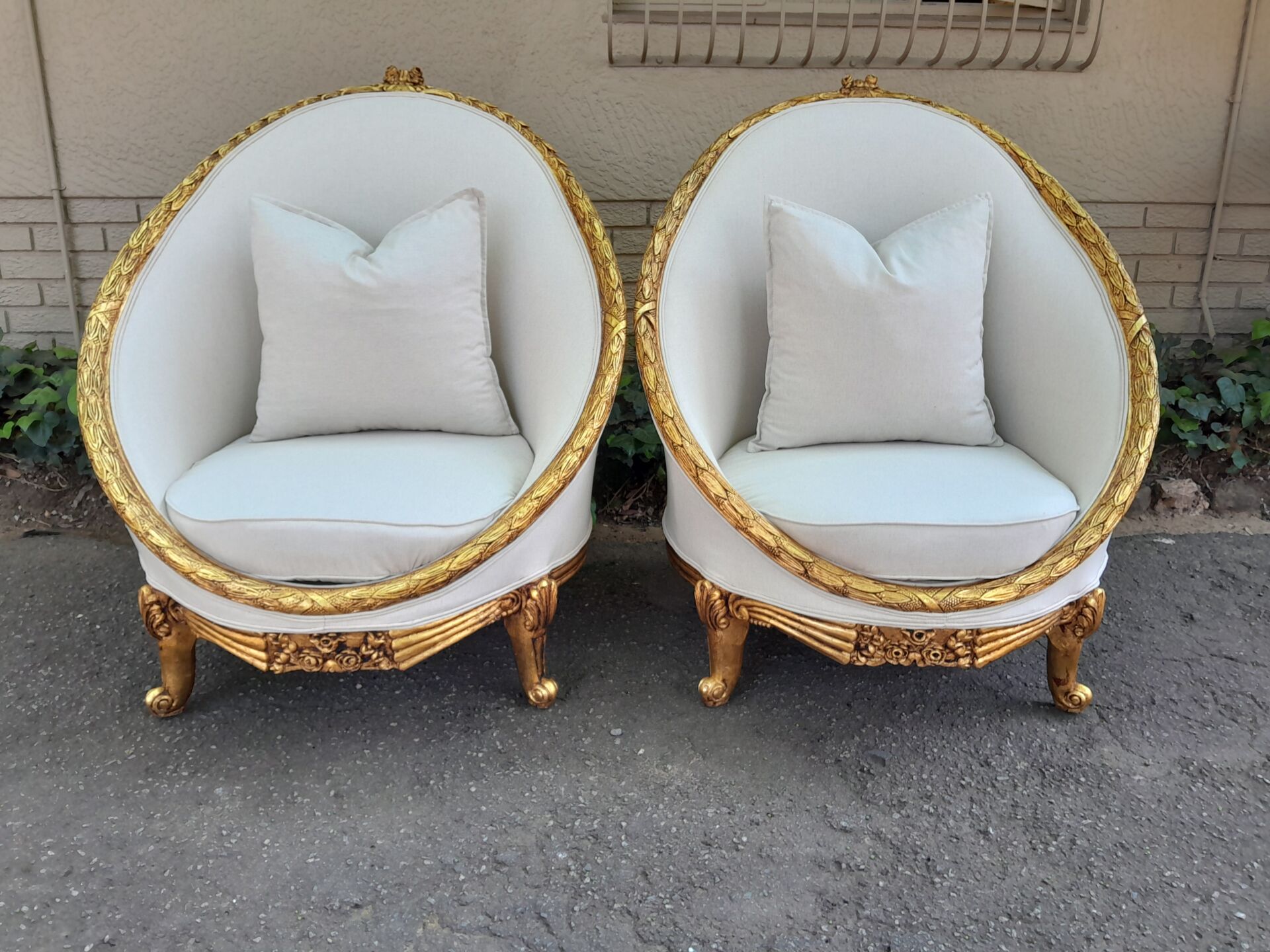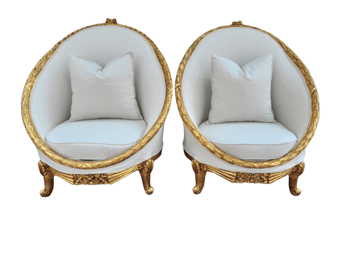 A Pair of French Empire Style Carved and Gilded Arm / Tub / Bergere Chairs