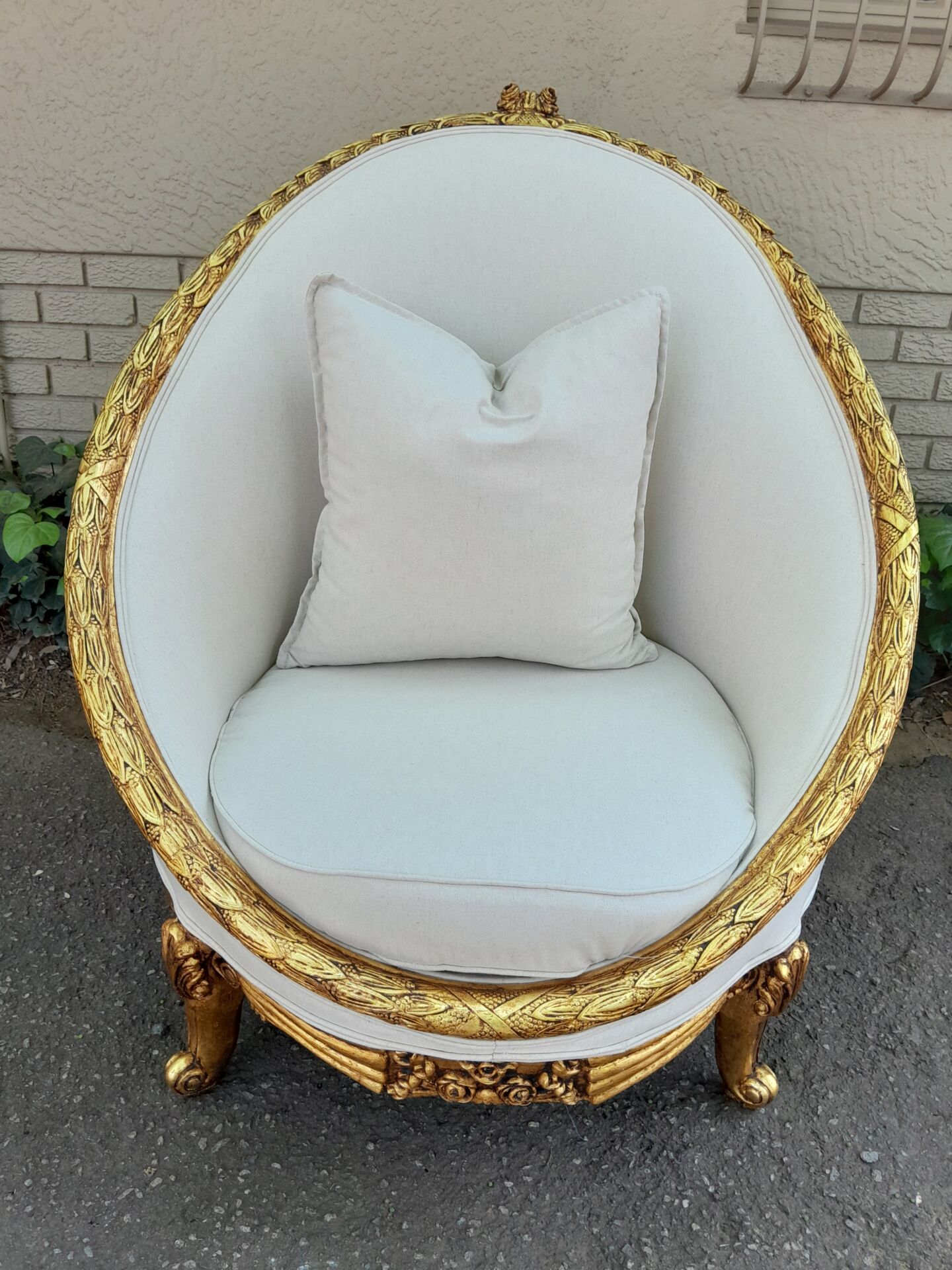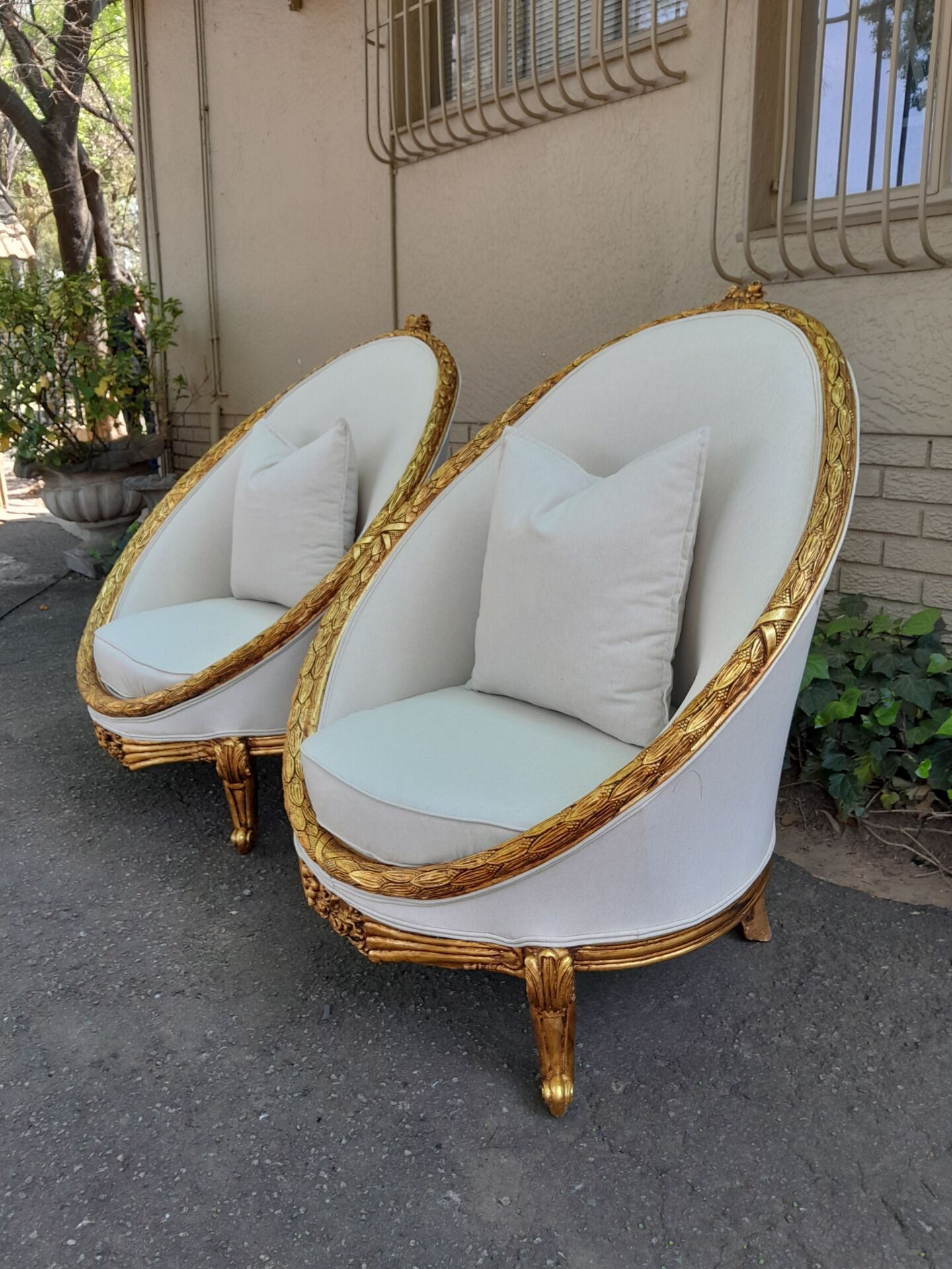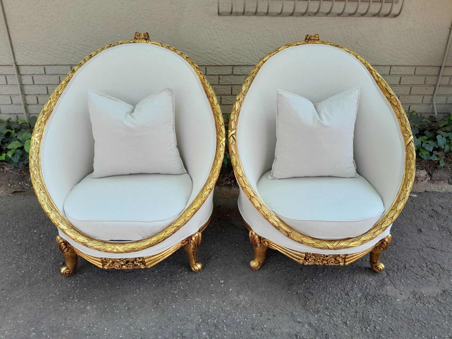 A Pair of French Empire Style Carved and Gilded Arm / Tub / Bergere Chairs
