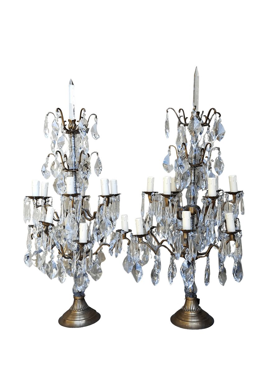 A Pair of French Girandole Gallery Candelabras / Brass and Crystal Table Lamps (Large)
