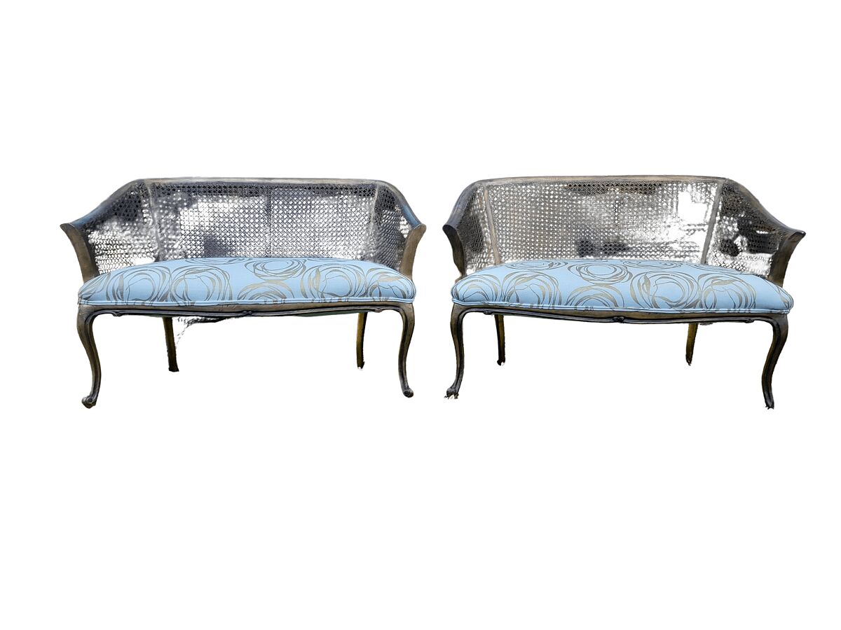 A Pair of French Style Carved and Gilded Wooden and Rattan Settees Upholstered in a Custom-Made Linen for The Crown Collection