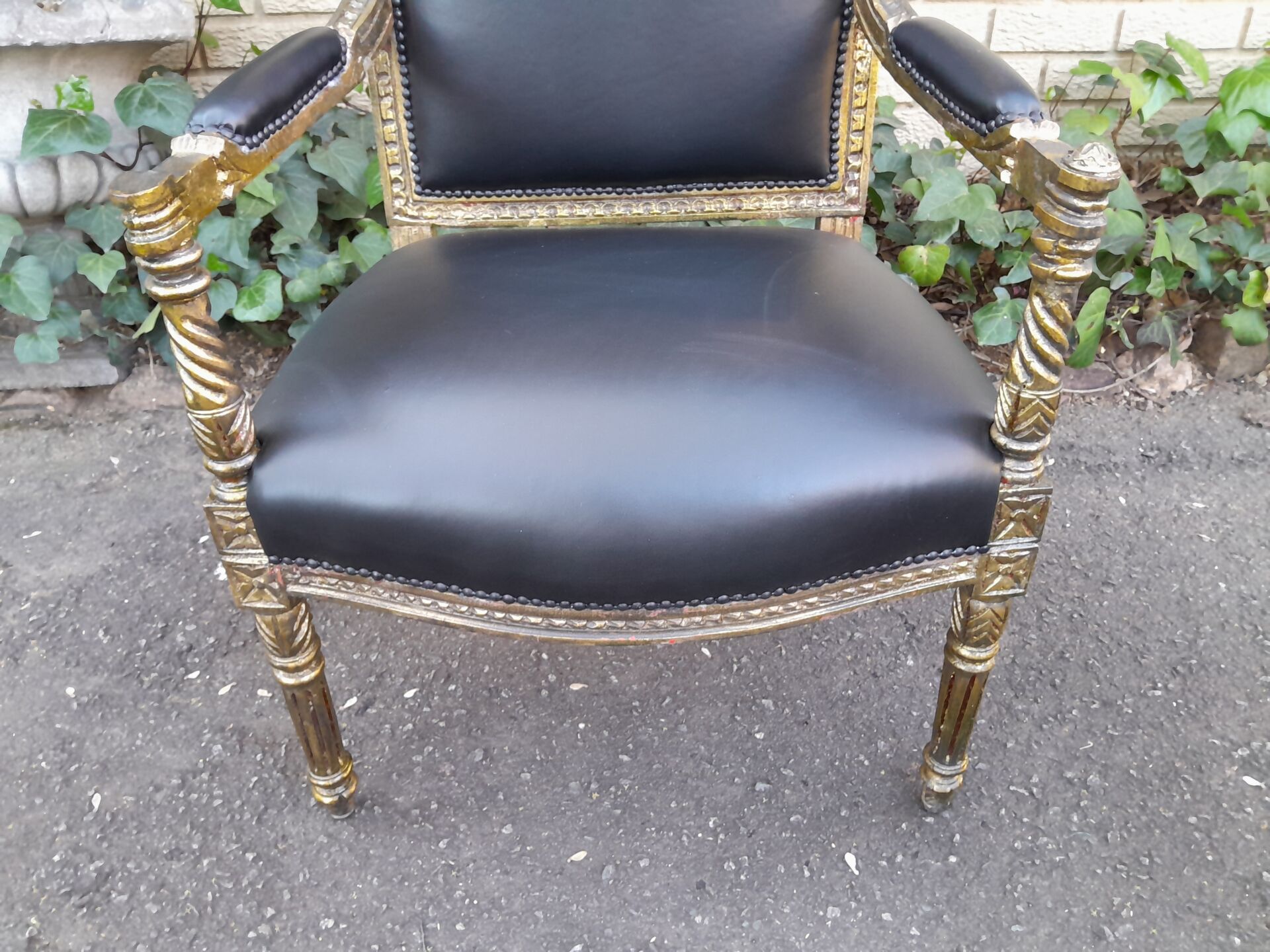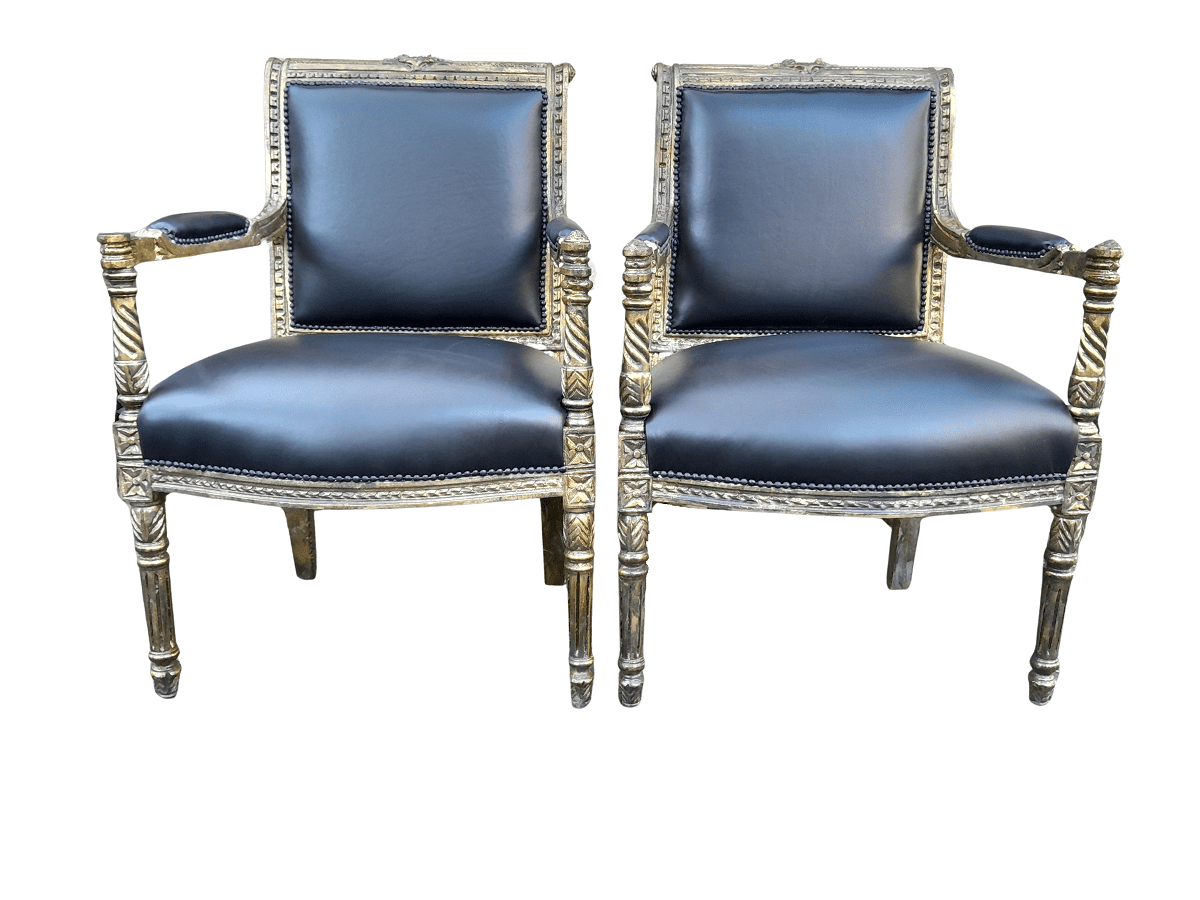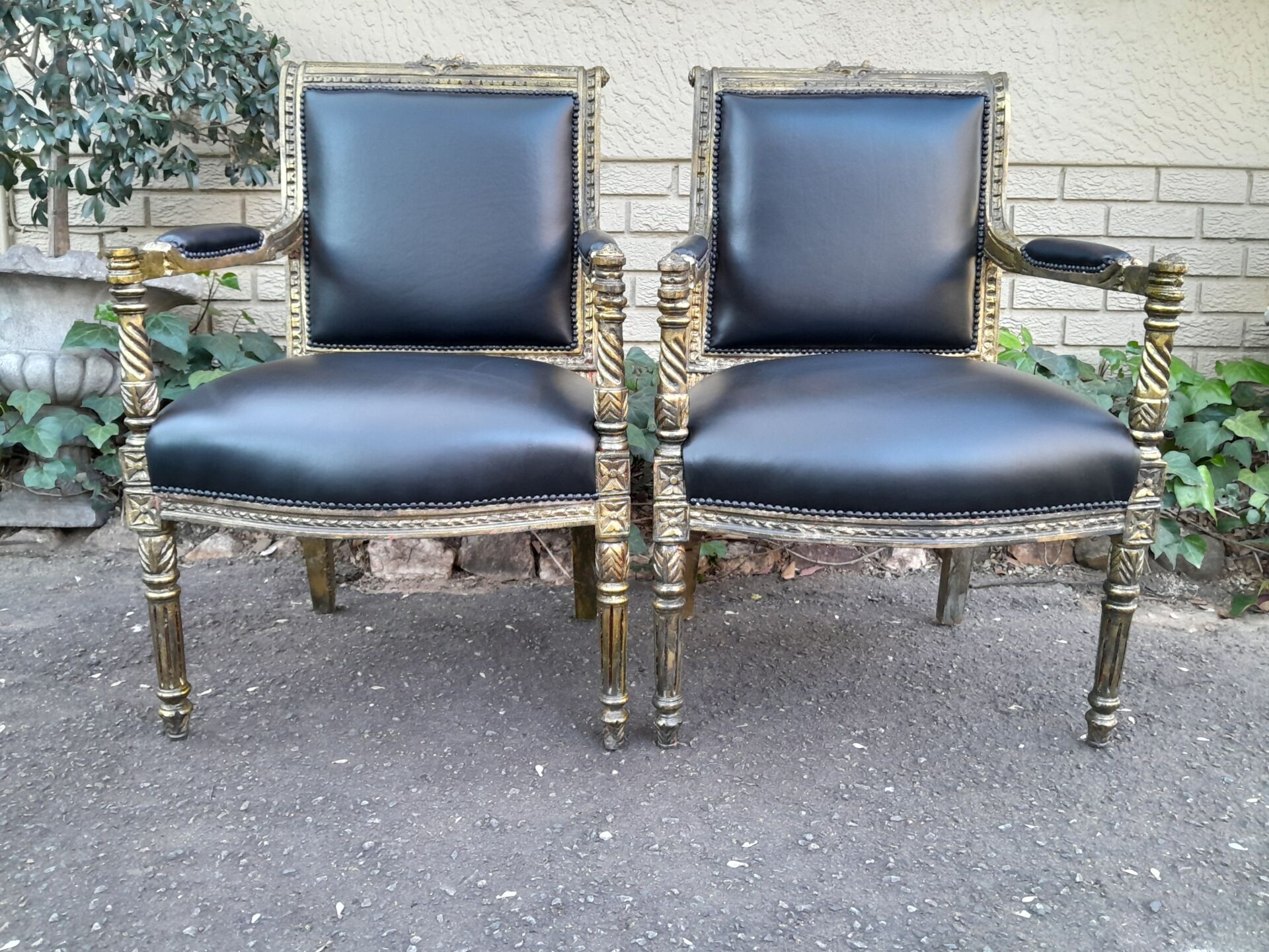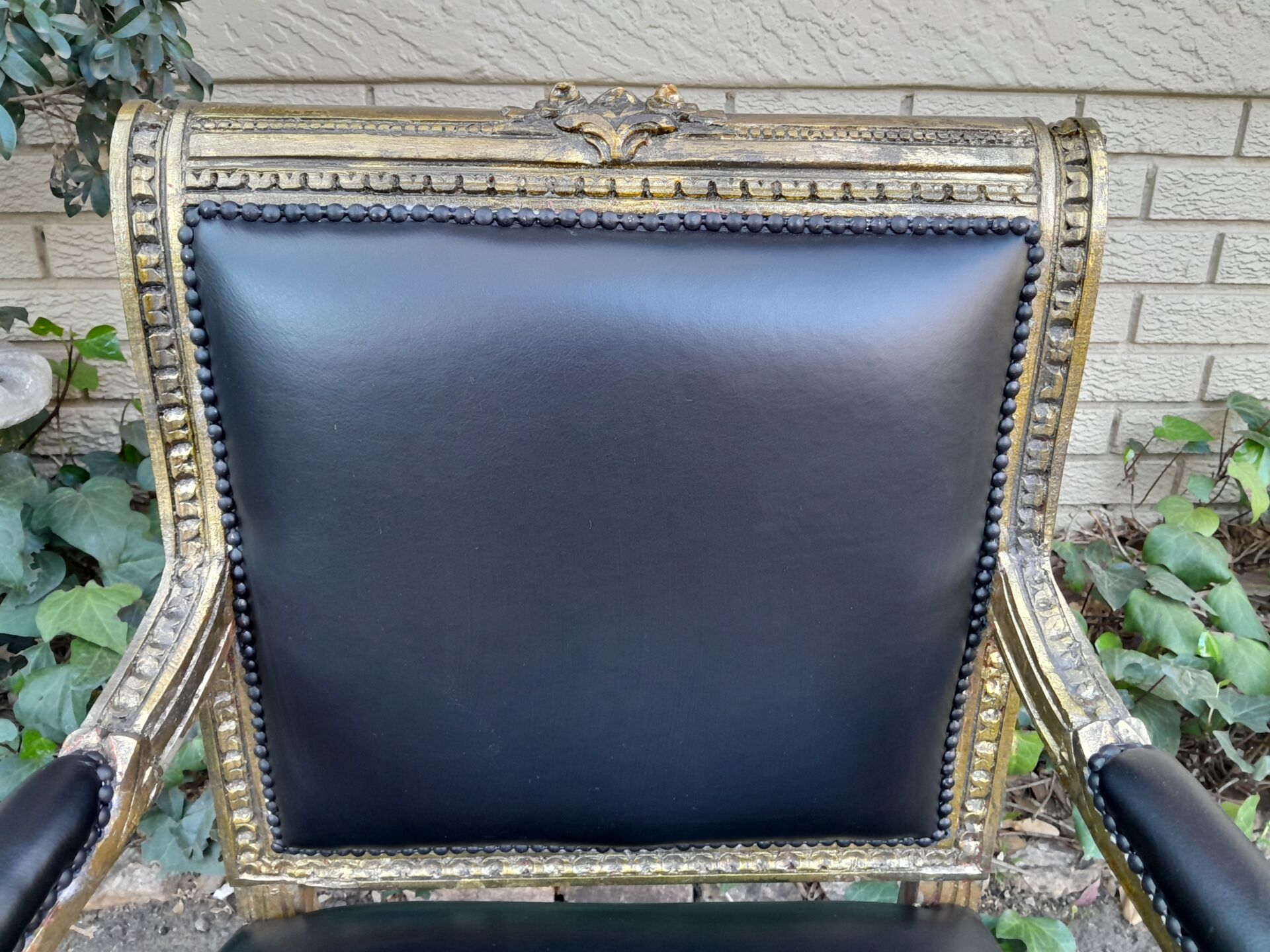 A Pair Of French Style Carved Wooden Gilded Armchairs in Black leather
