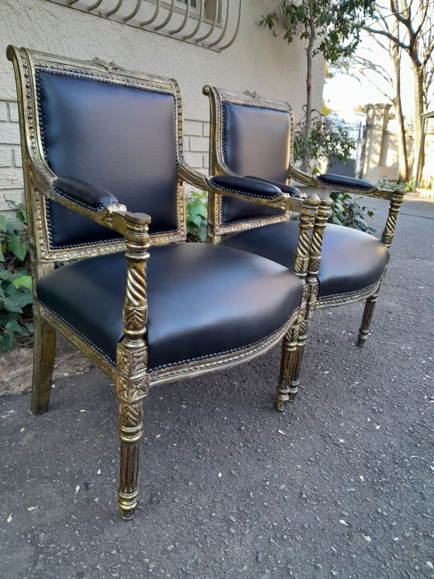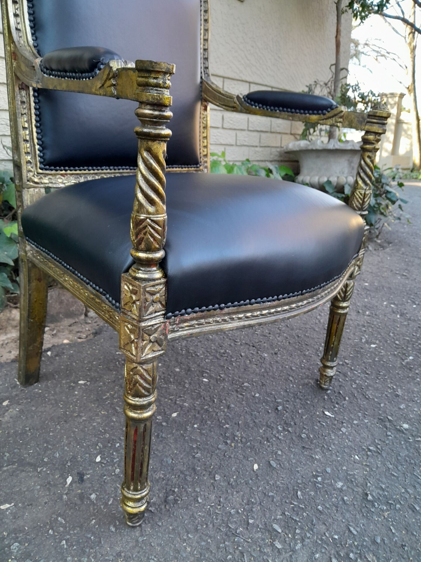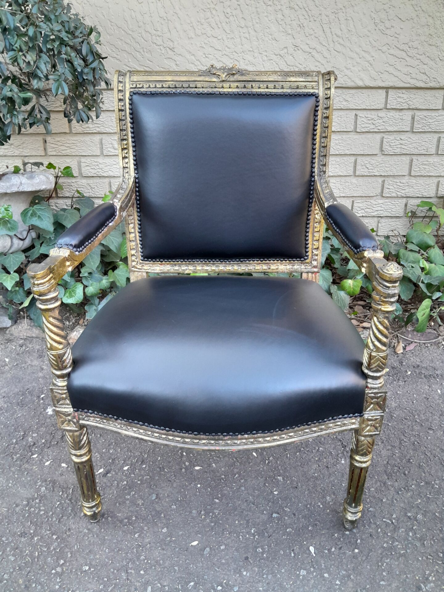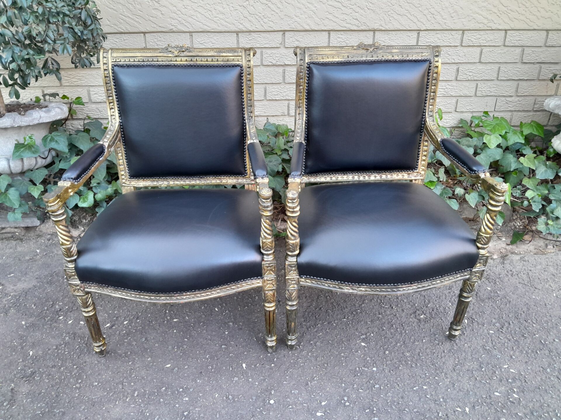 A Pair Of French Style Carved Wooden Gilded Armchairs in Black leather