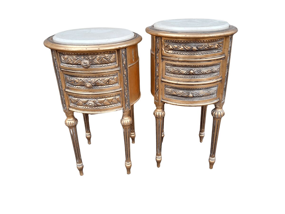 A Pair Of French Style Hand-Gilded Round Pedestals / Side Tables With Drawers And Cream Marble Tops