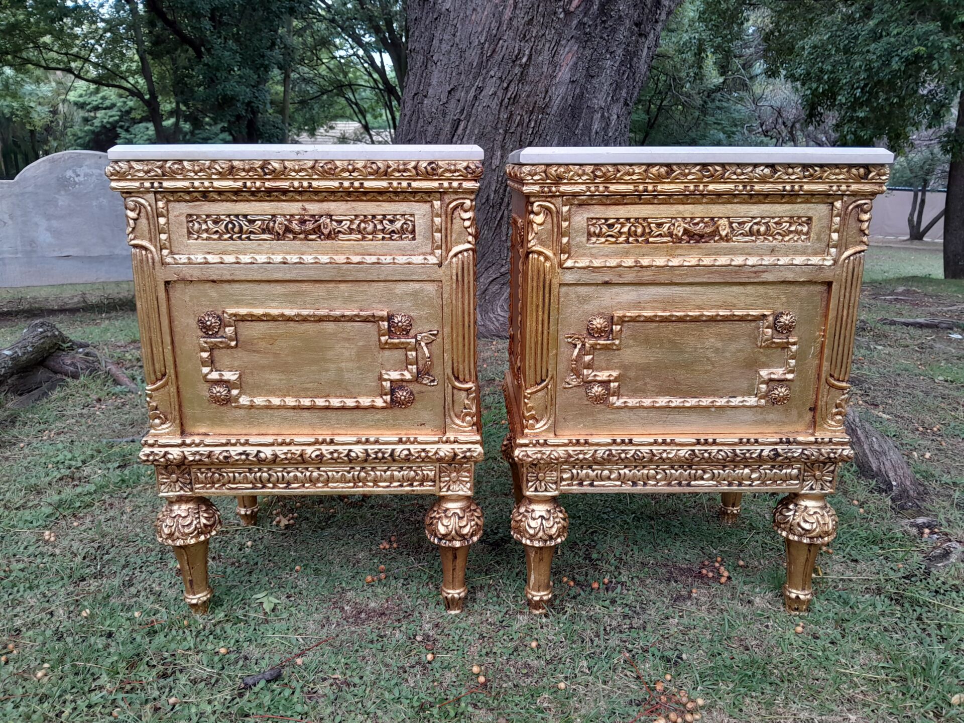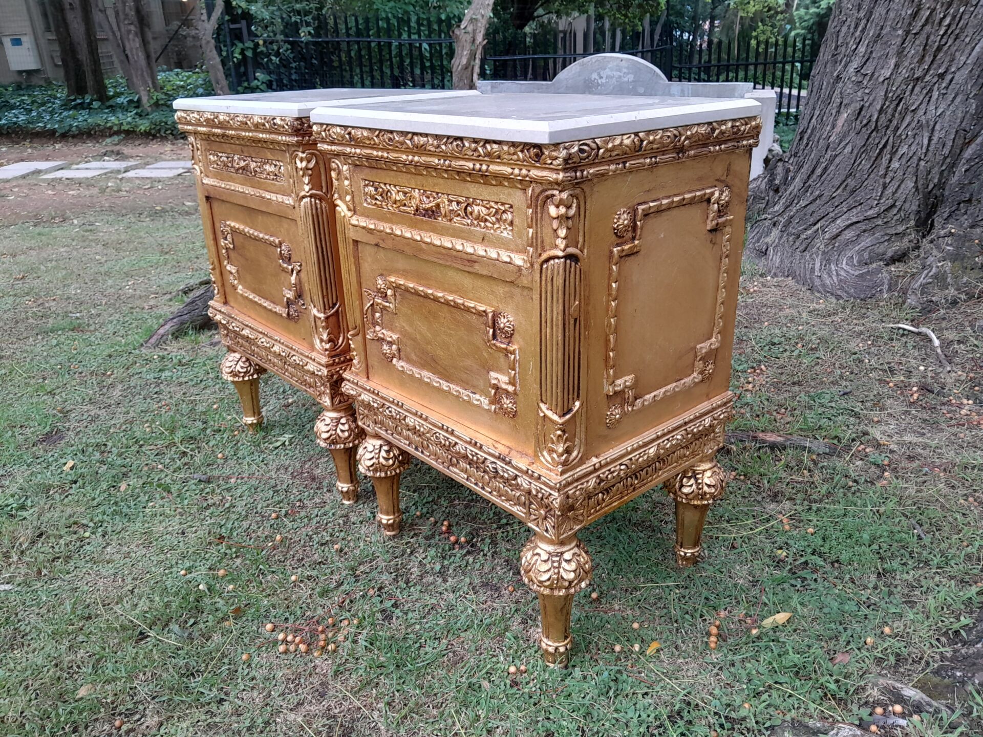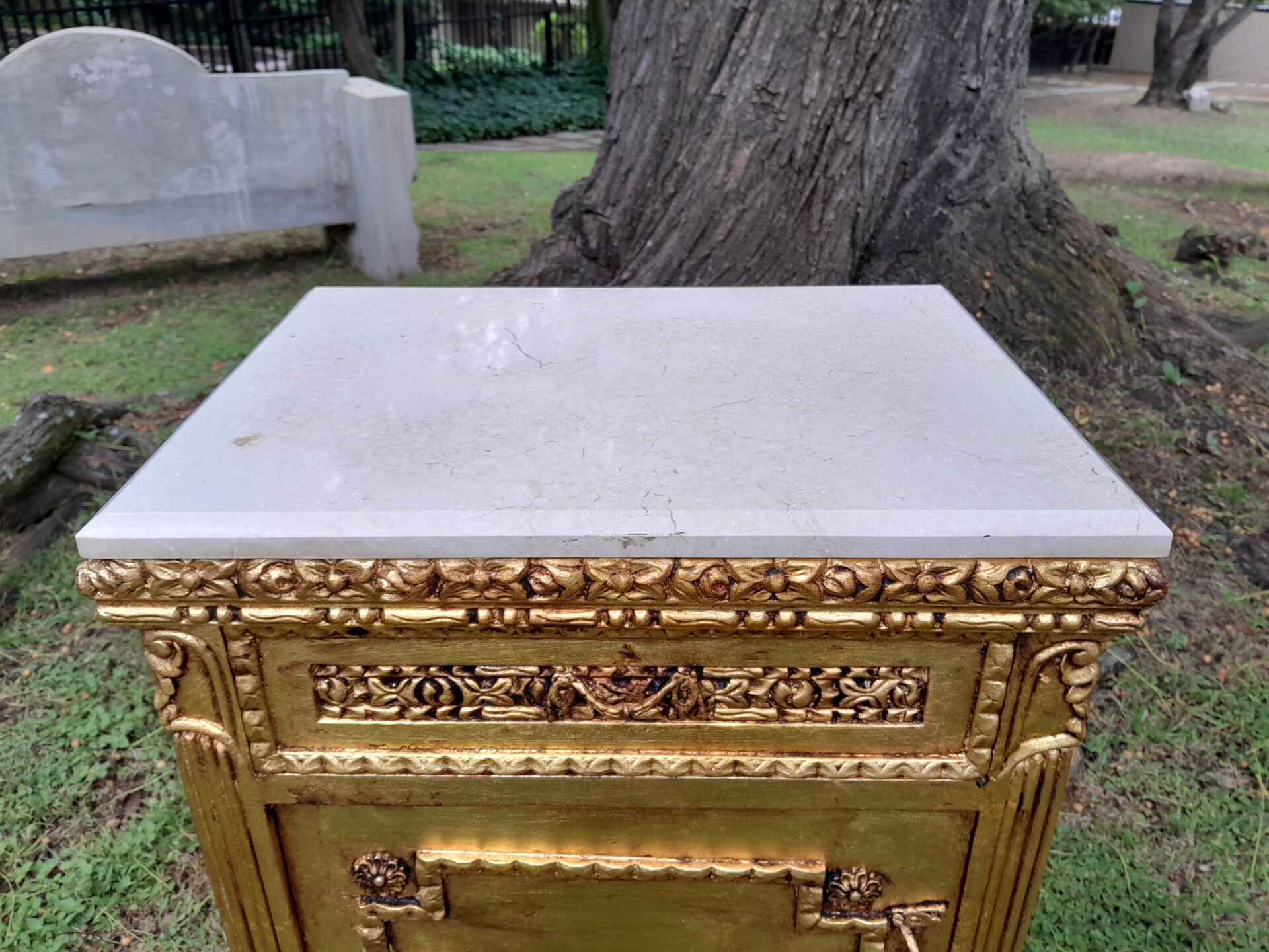 A Pair of French Style Ornately Carved Giltwood Pedestals/Side Tables with Cream Marble Tops