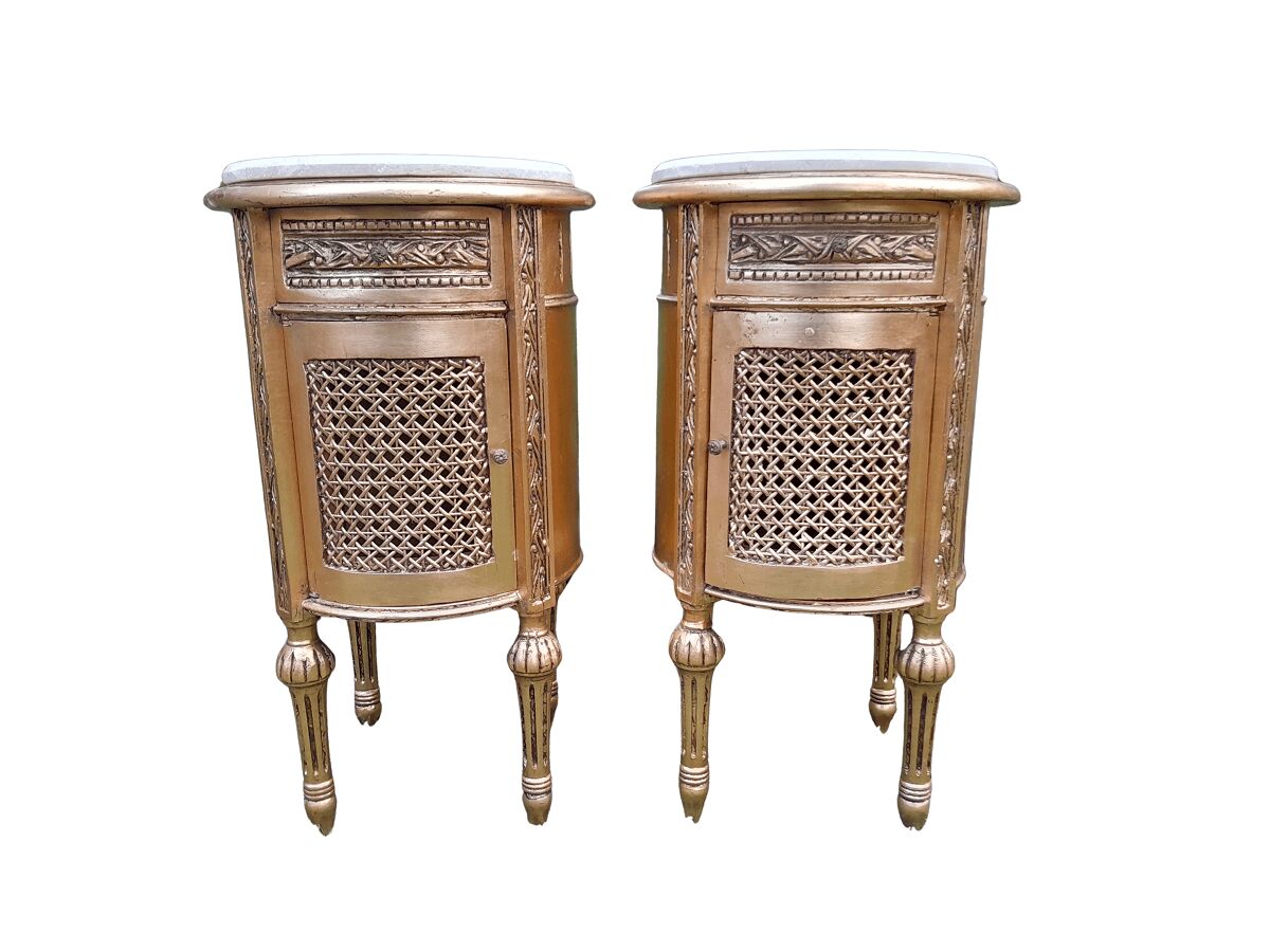 A Pair of French Style Ornately Carved Giltwood Pedestals / Side Tables with Marble Tops