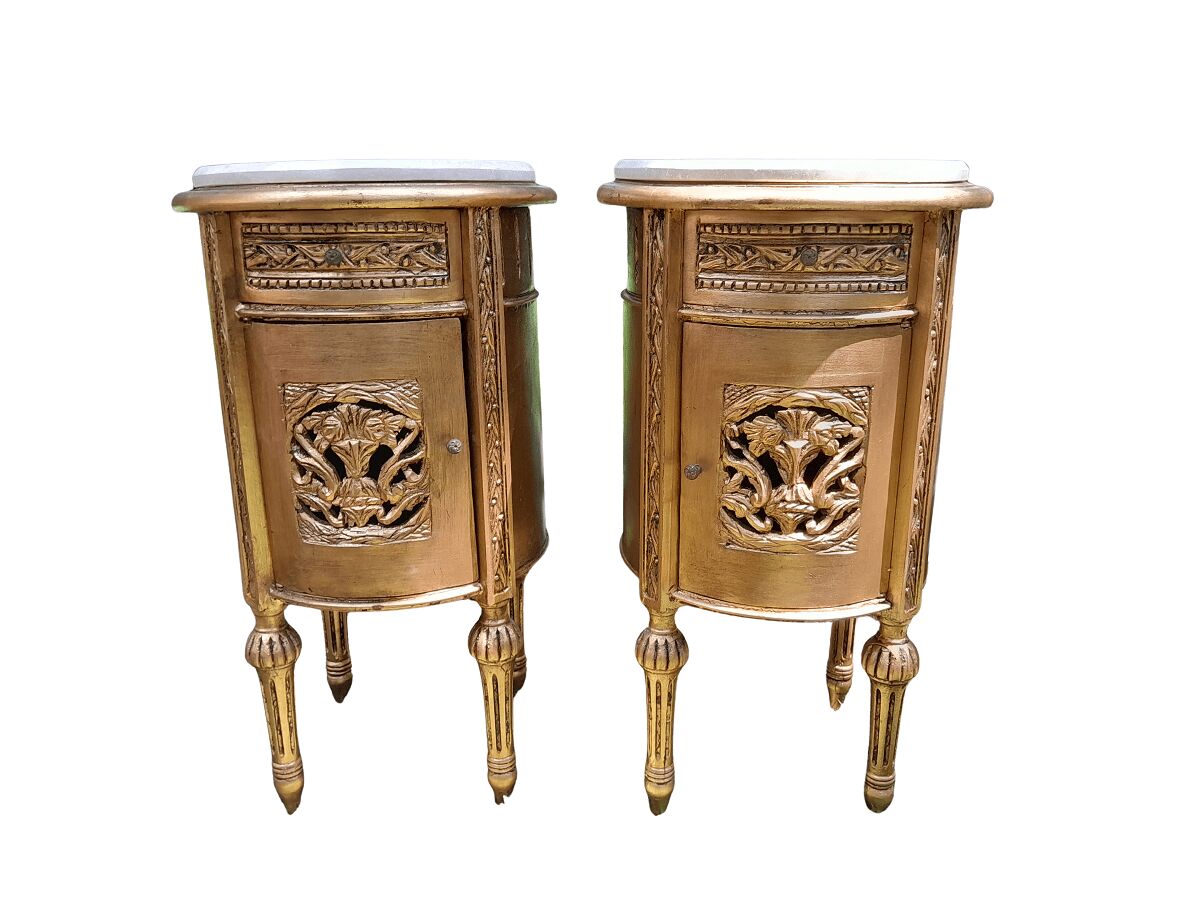 A Pair of French Style Ornately Carved Giltwood Pedestals / Side Tables with Marble Tops