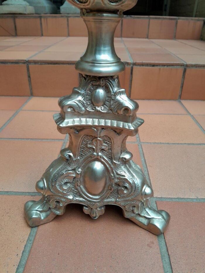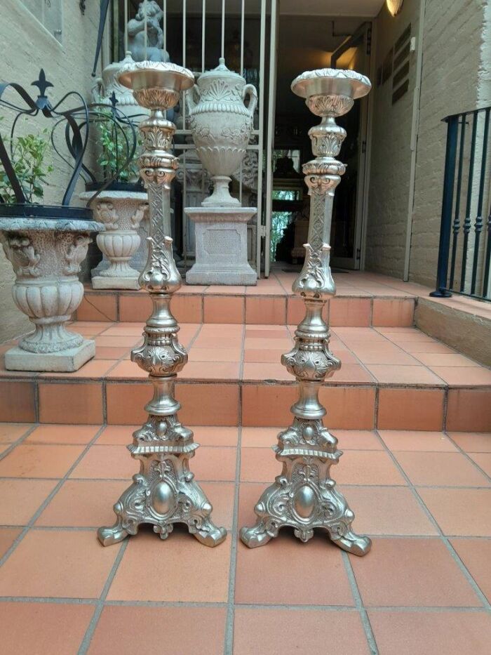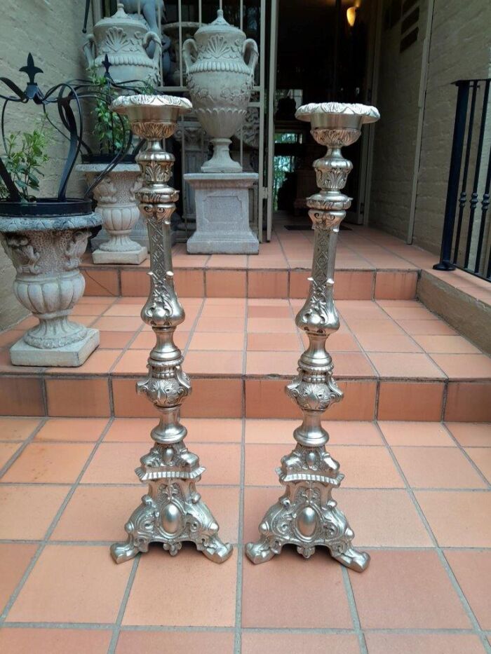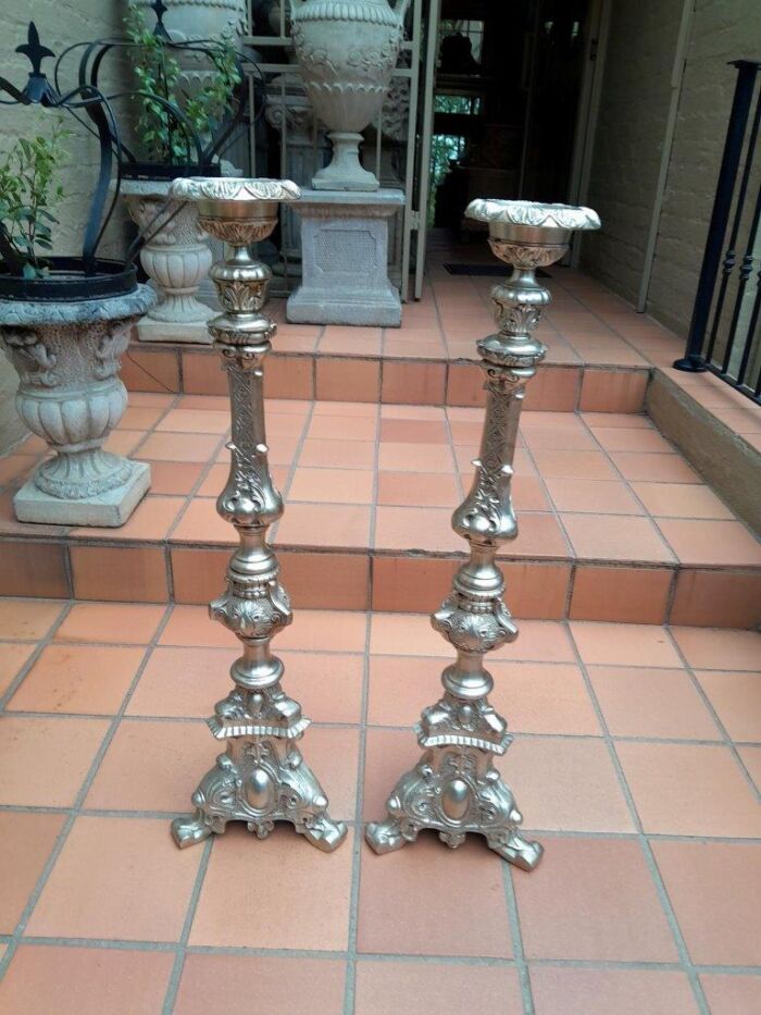 A Pair Of Tall Heavy Metal Silvered Candlesticks / Holders Nd