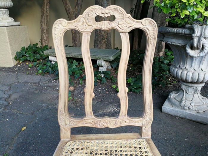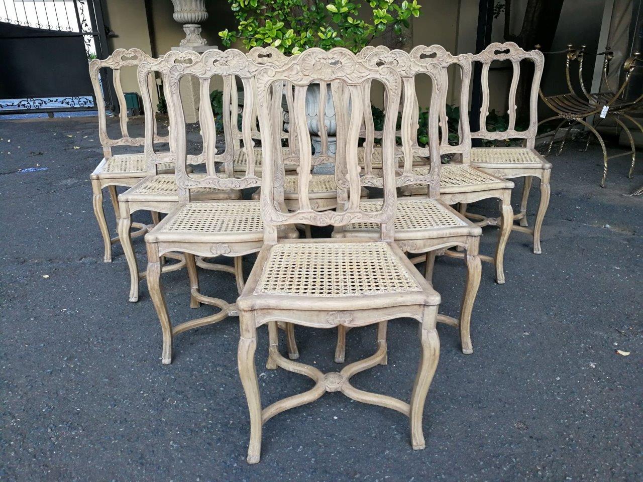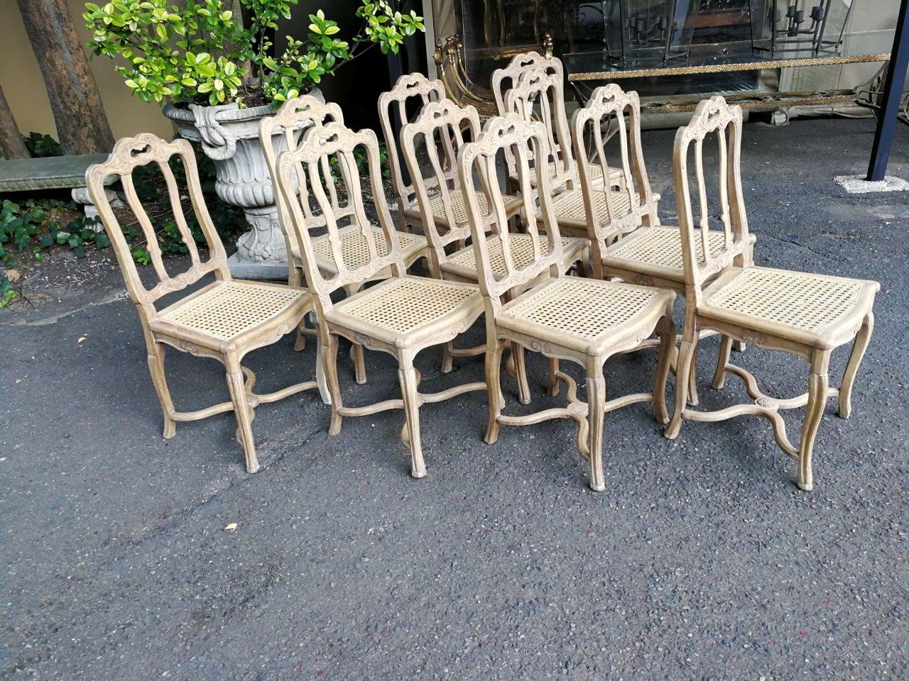 A Set Of Ten Antique French Provincial Carved Bleached / Natural Oak Dining Chairs With Rattan Seats. Circa 1860-1900’s