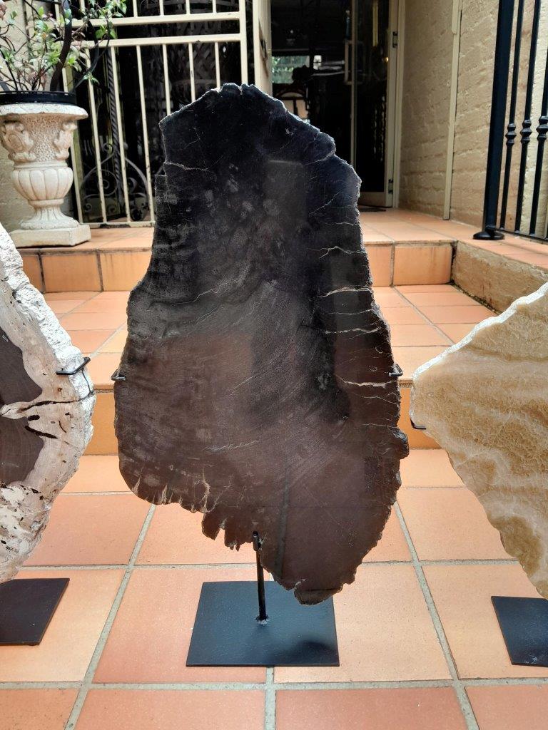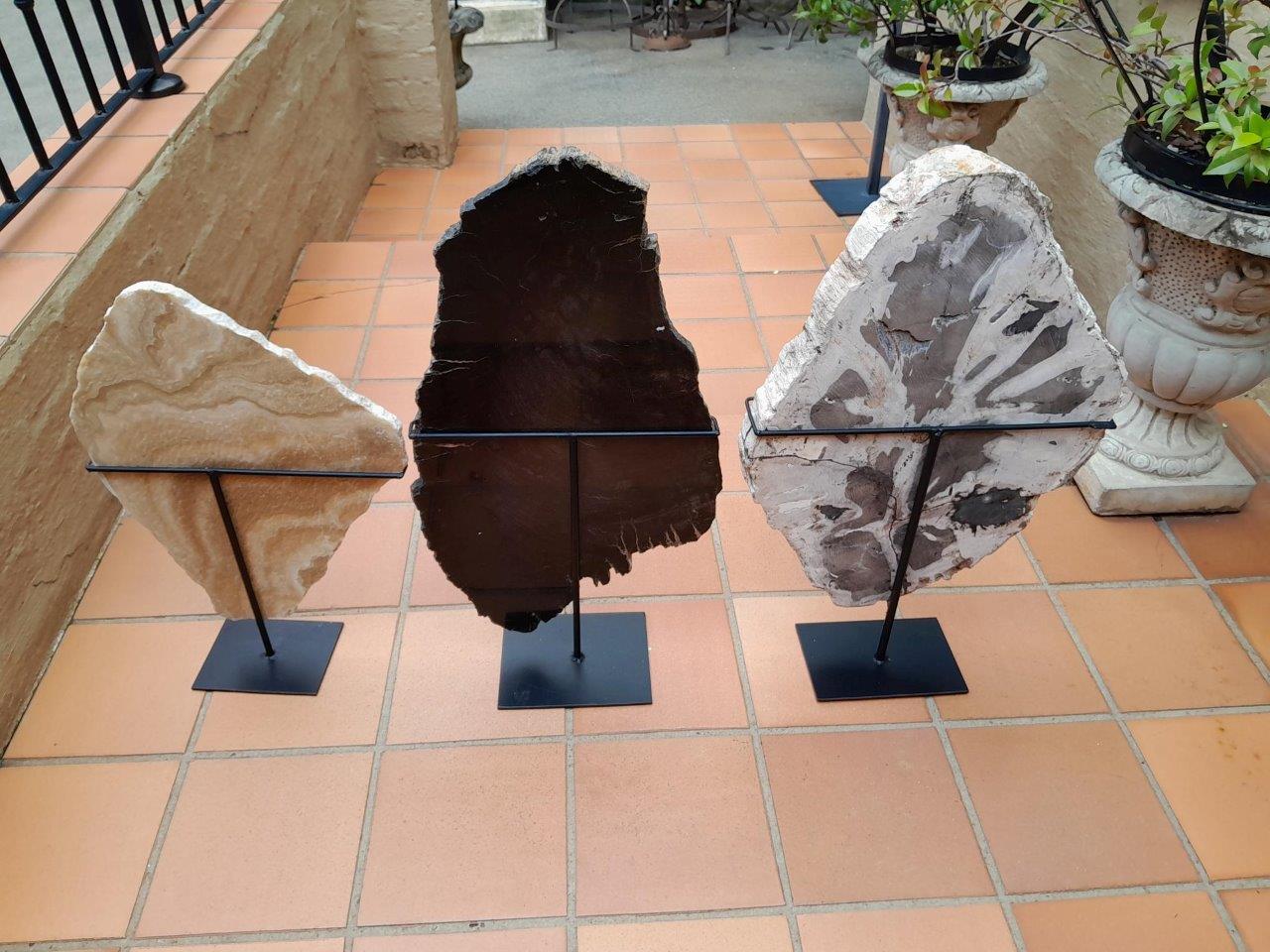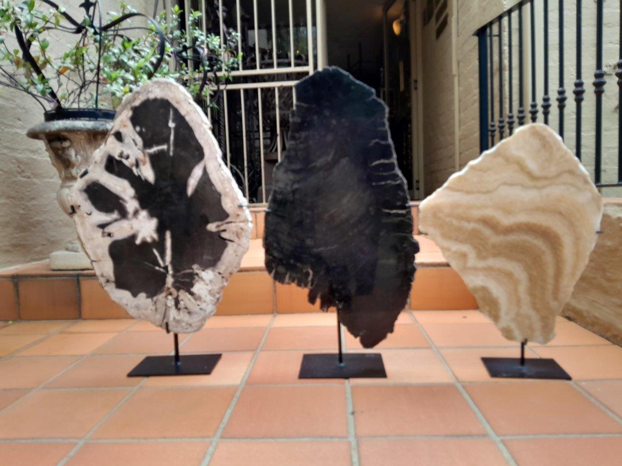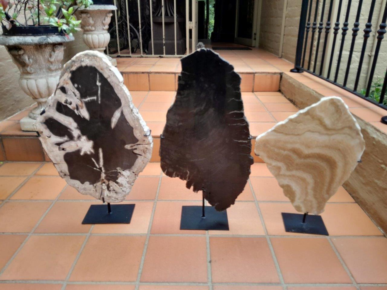 A Set Of Three Decorative Elements Petrified Wood And Onyx On Black Display Stands ND