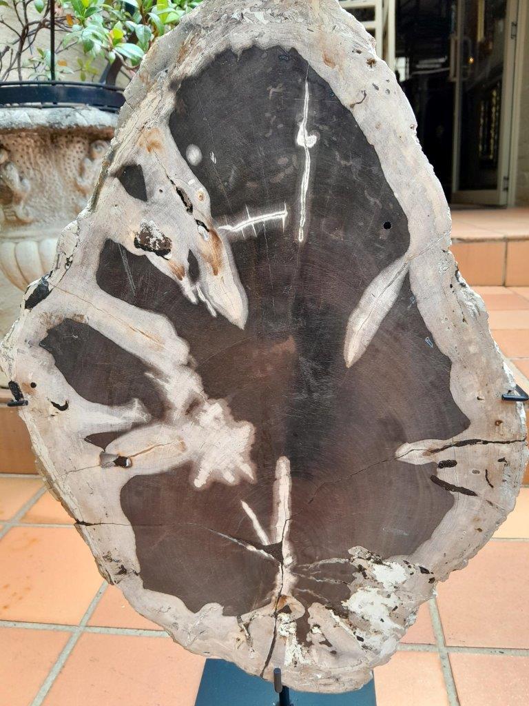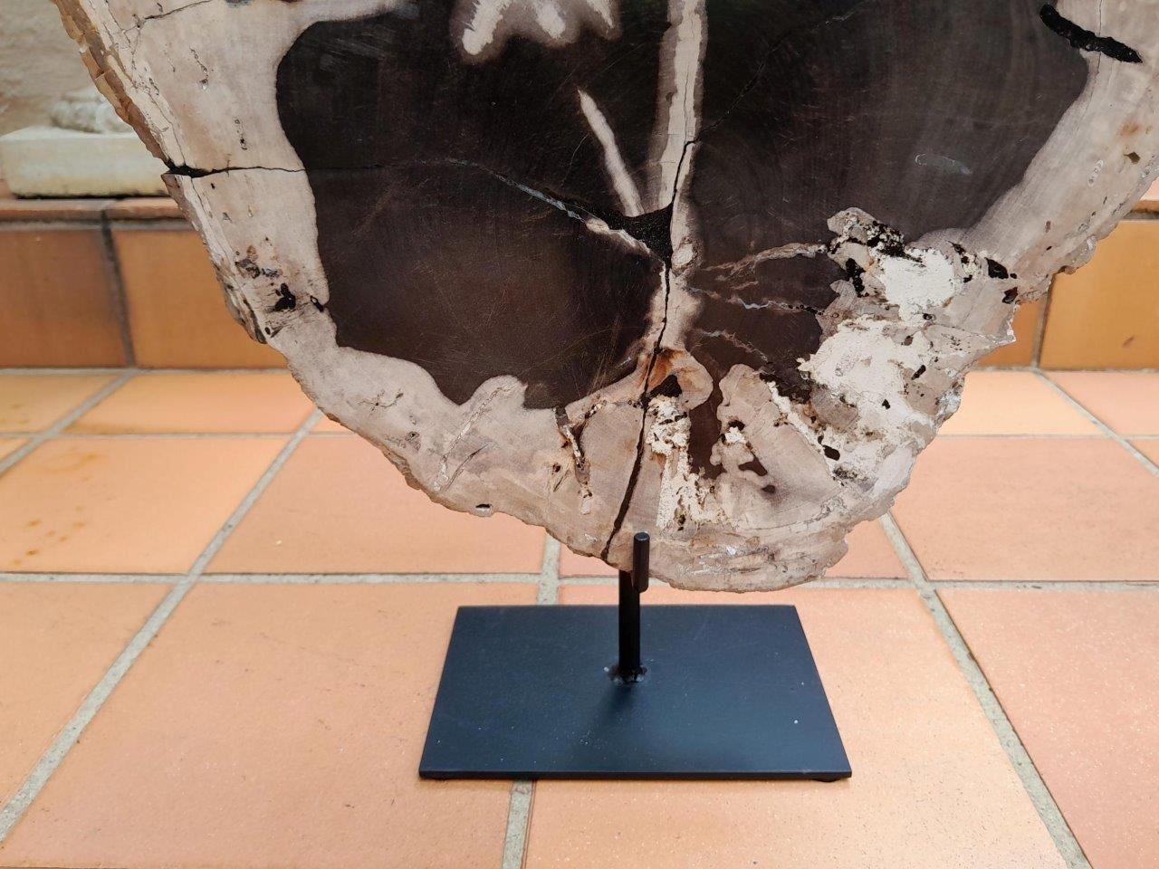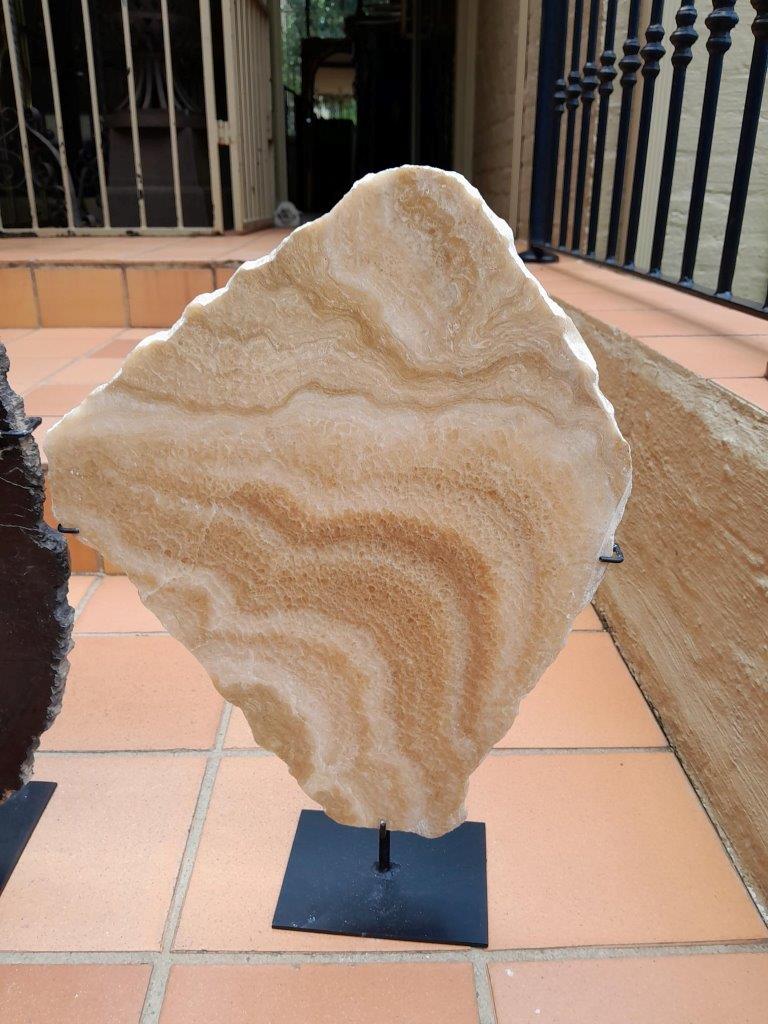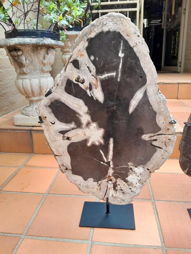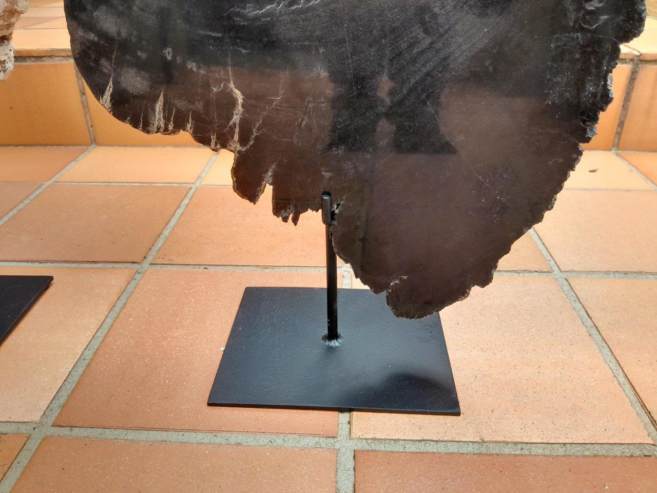 A Set Of Three Decorative Elements Petrified Wood And Onyx On Black Display Stands ND