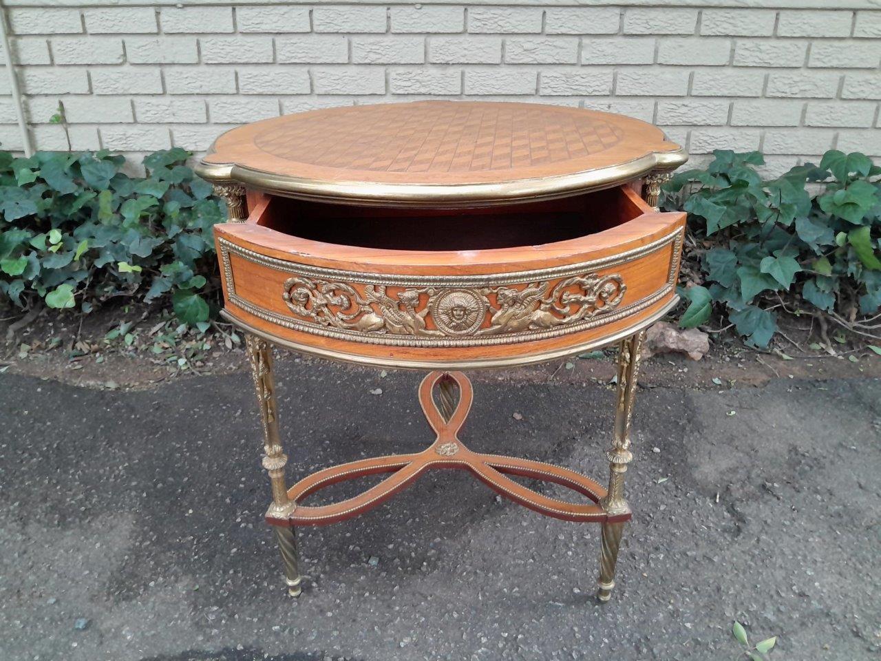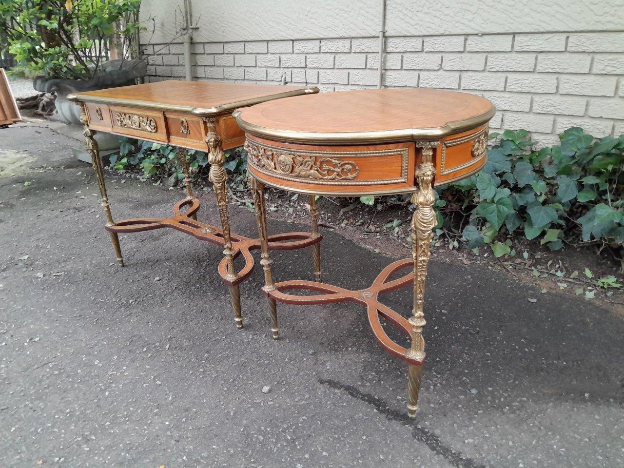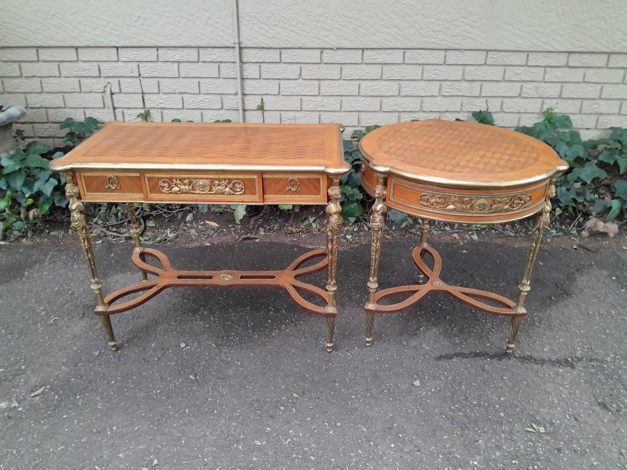 A Set Of Two French Louis XVI Style Ormolu And Walnut Tables/Desk With Brass Edges And Drawers In Two Shapes Rectangular And Round, With Drawer