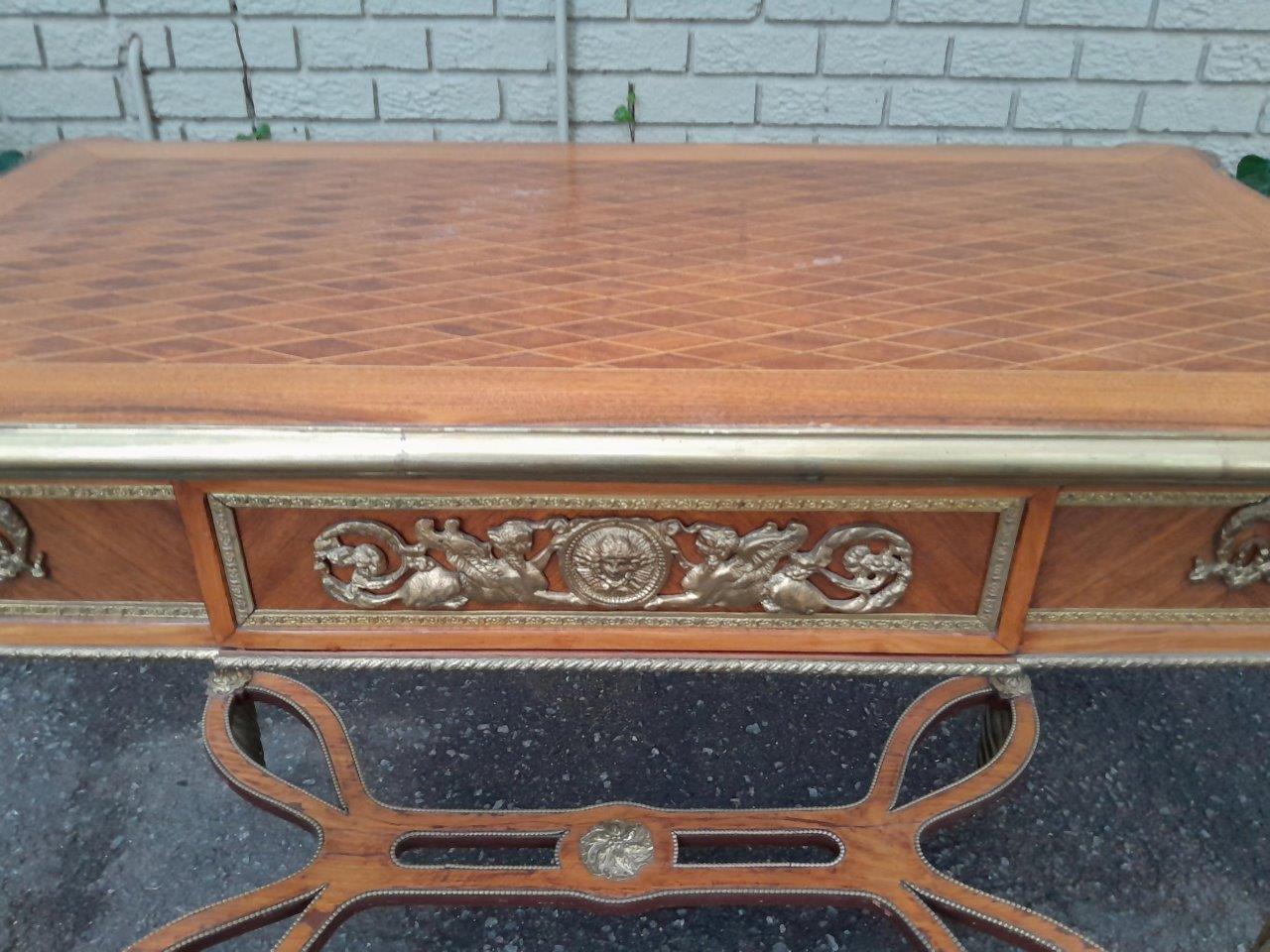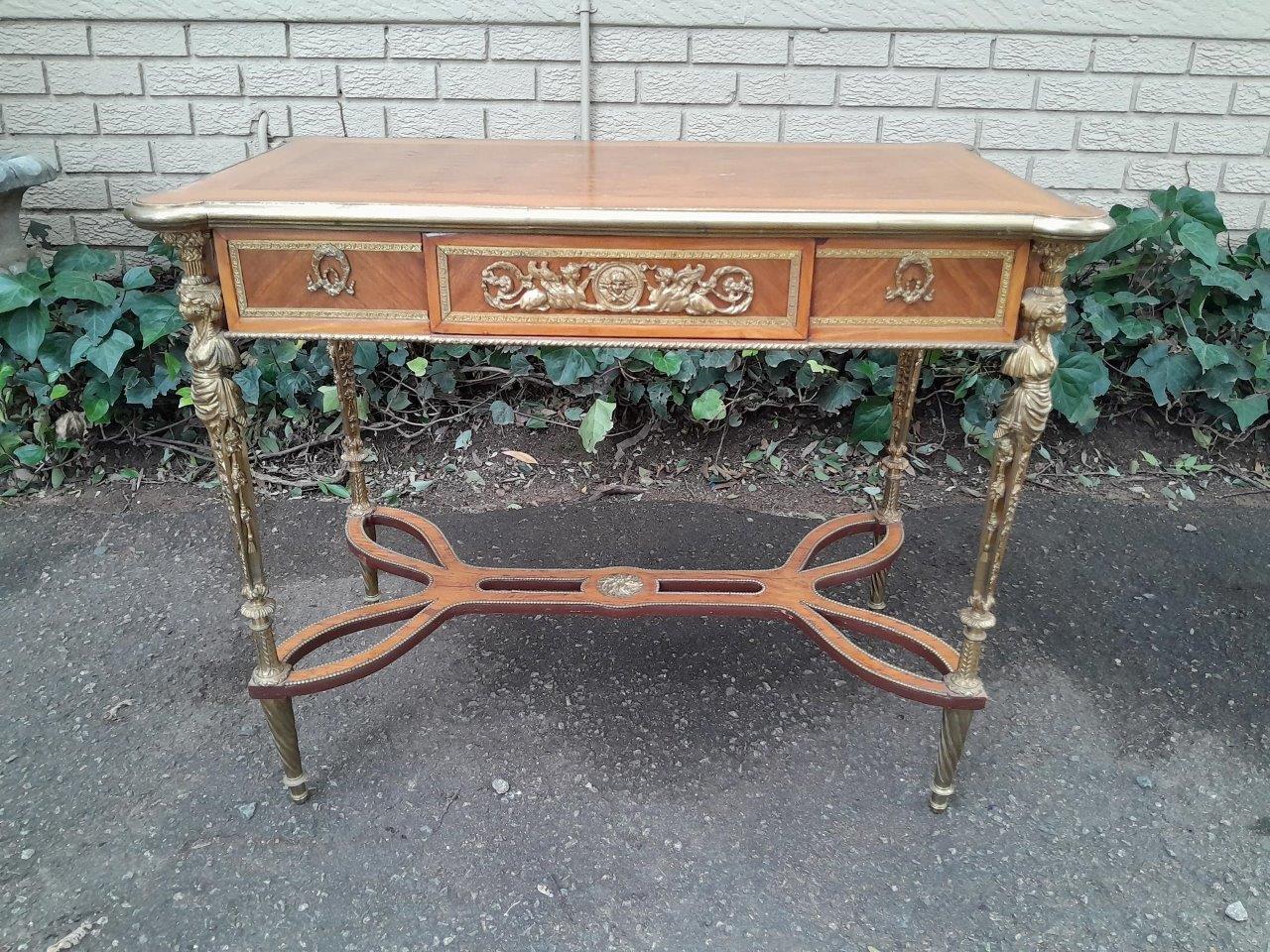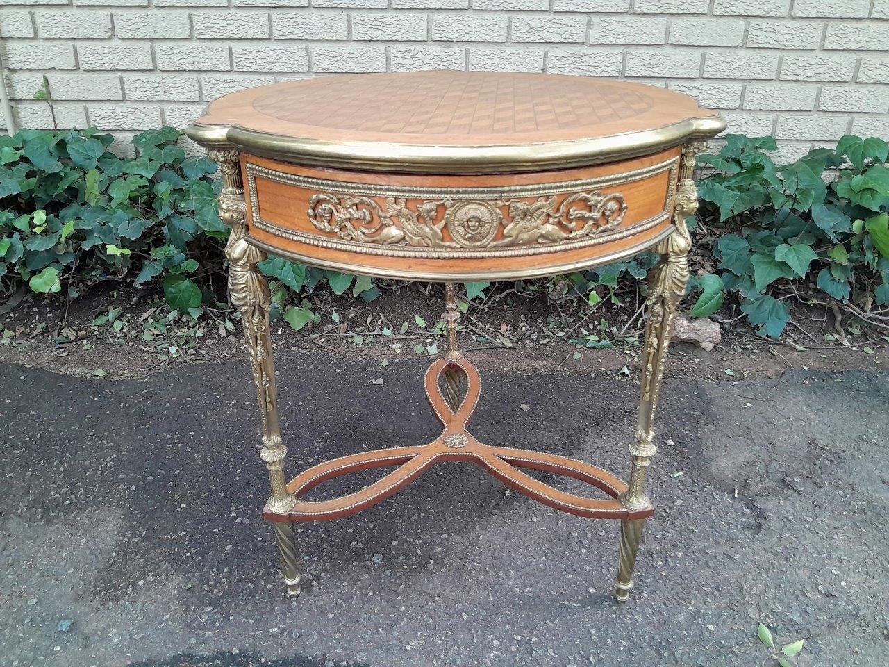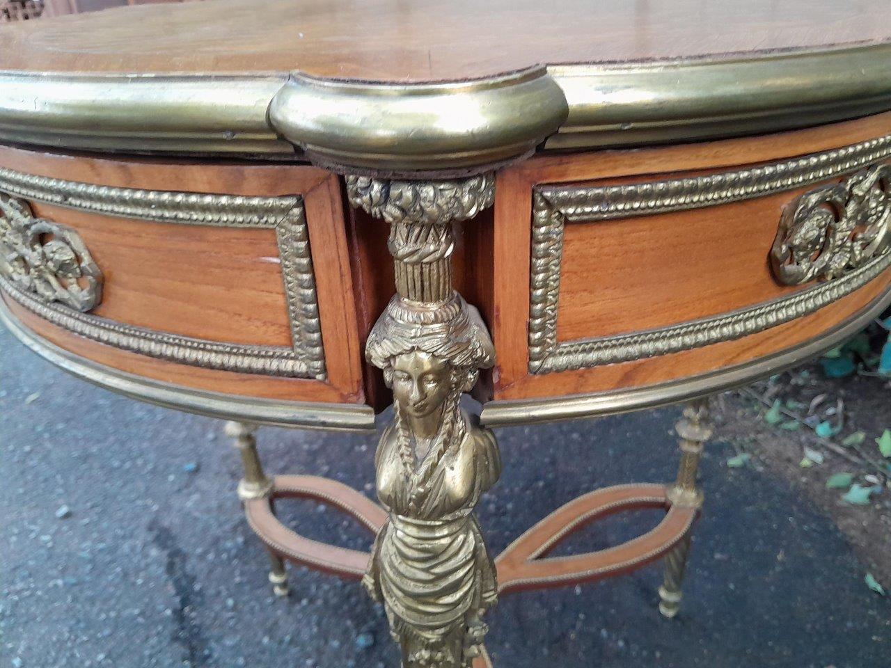 A Set Of Two French Louis XVI Style Ormolu And Walnut Tables/Desk With Brass Edges And Drawers In Two Shapes Rectangular And Round, With Drawer