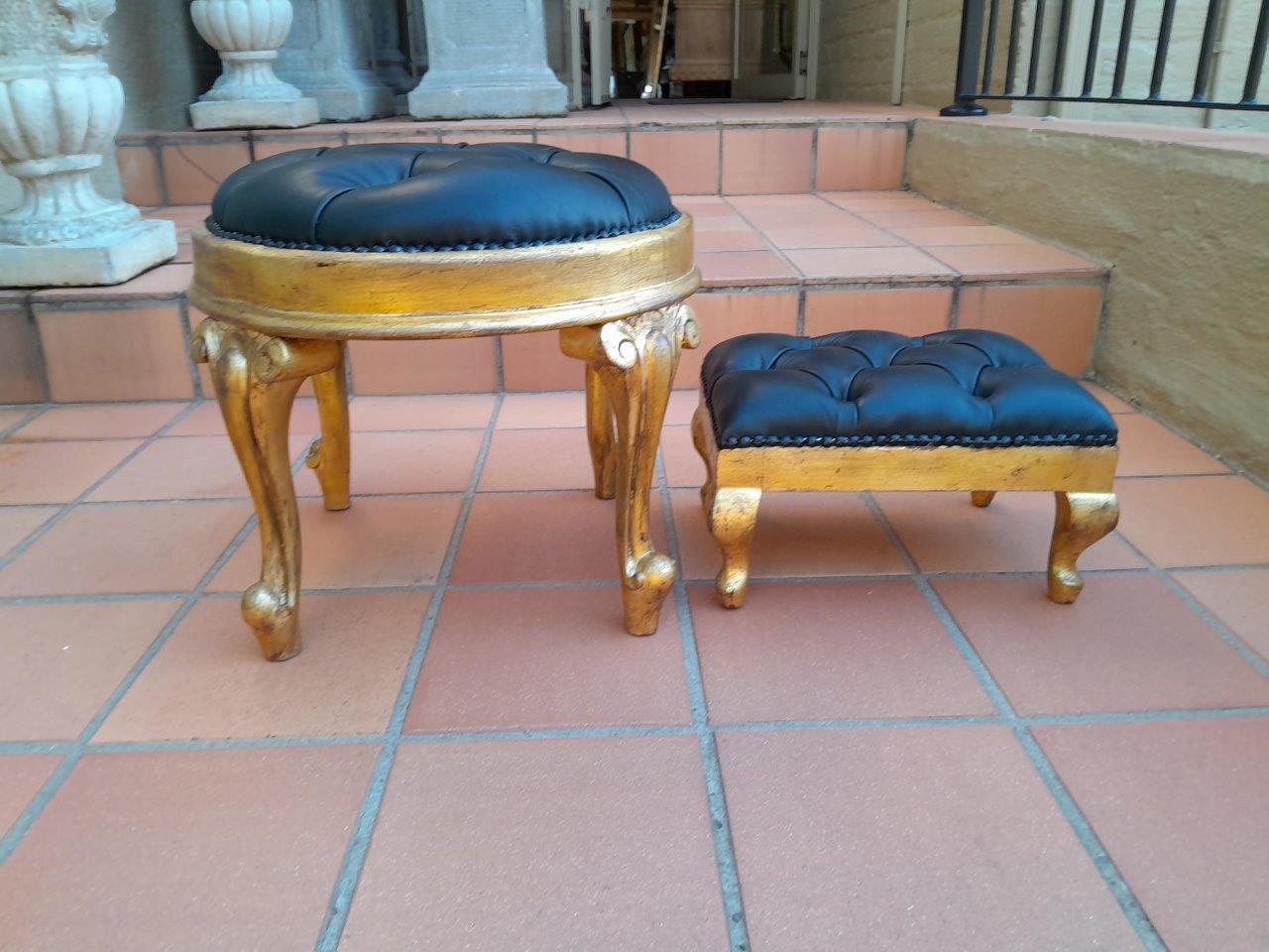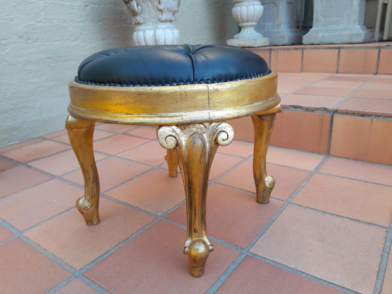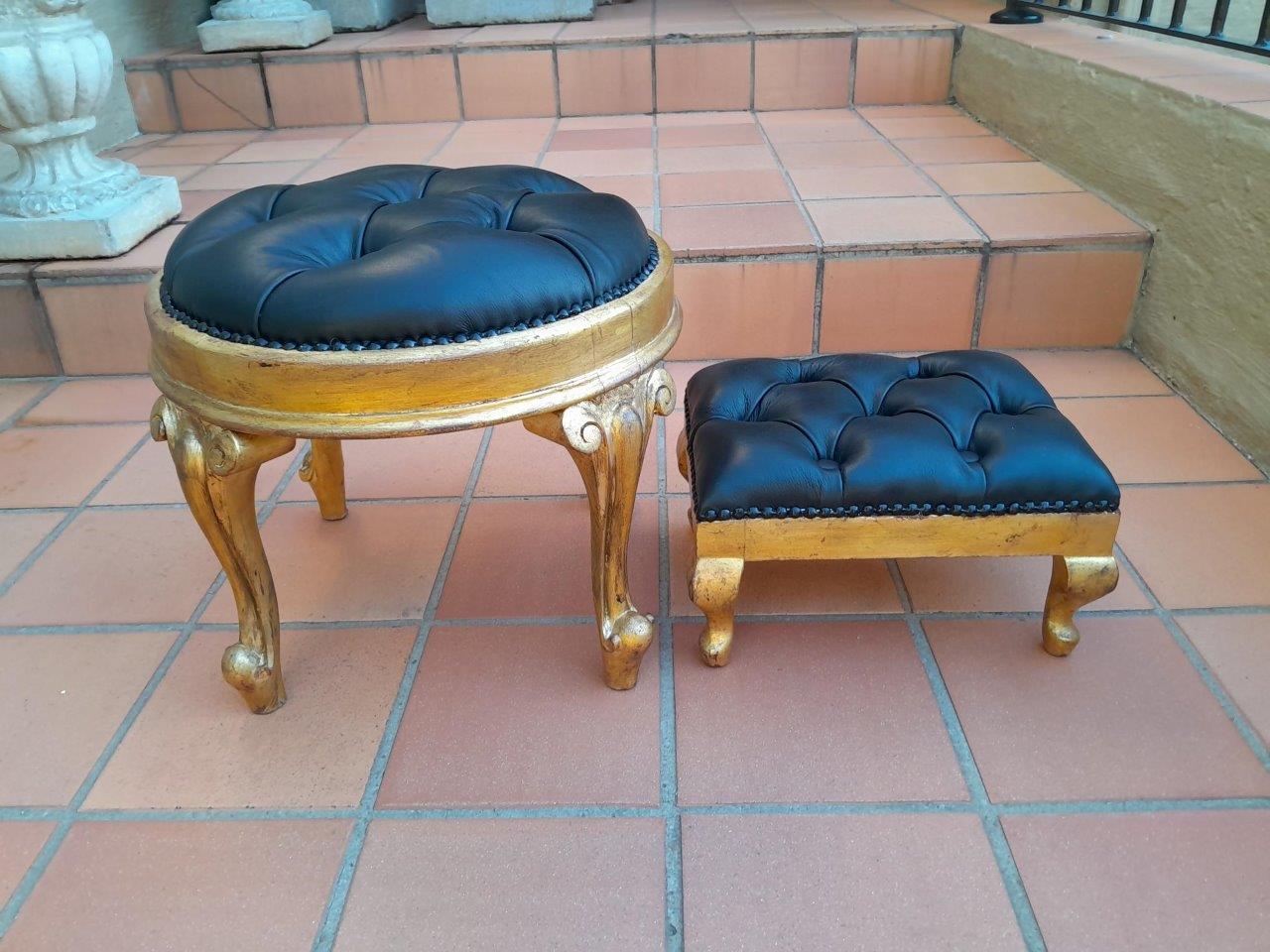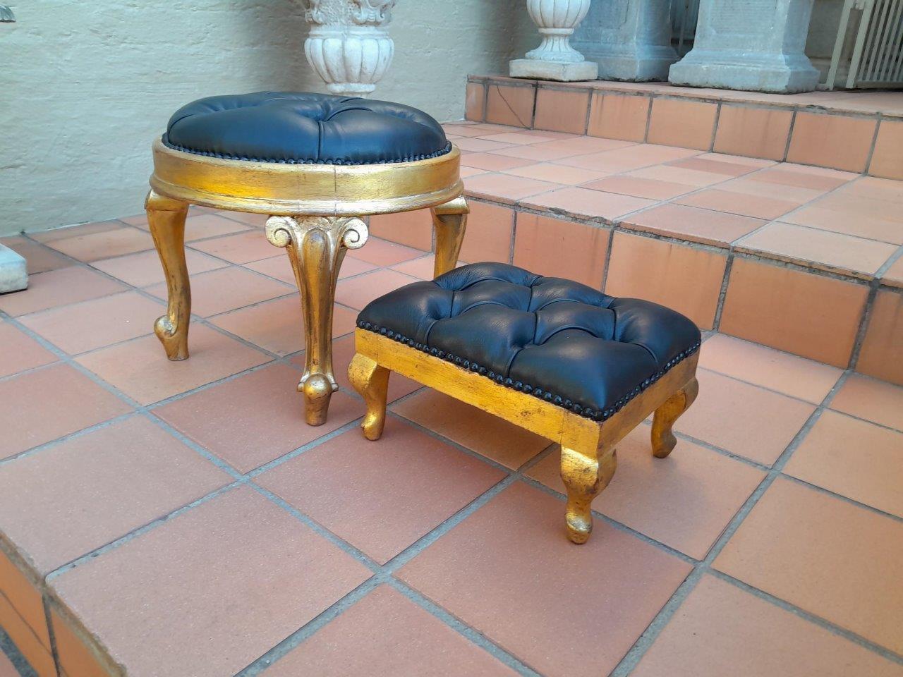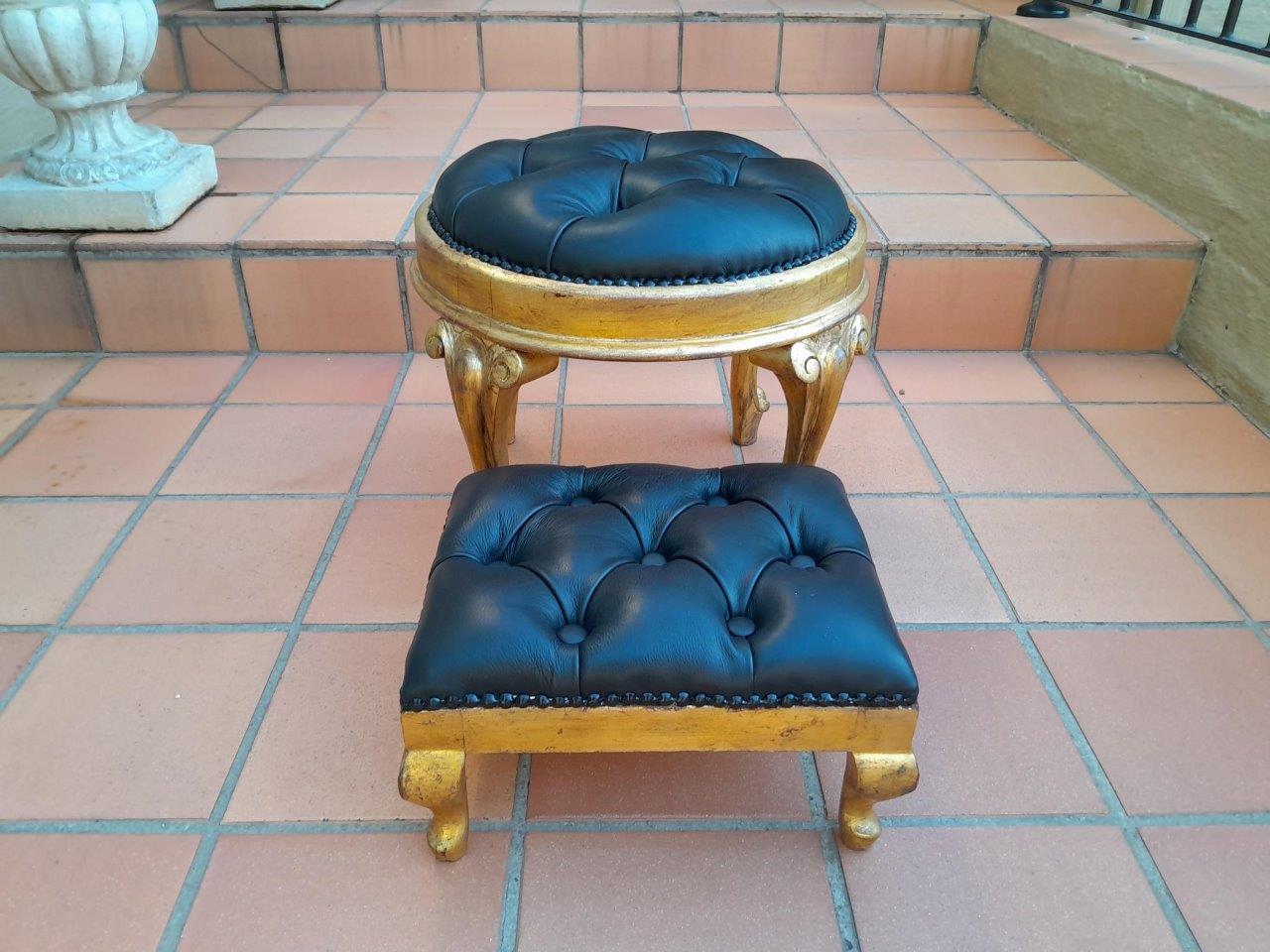 A Victorian Circa 1920 Set of Two Mahogany Foot Stools in a Hand Gilded Finish and Upholstered in Deep Buttoned Leather