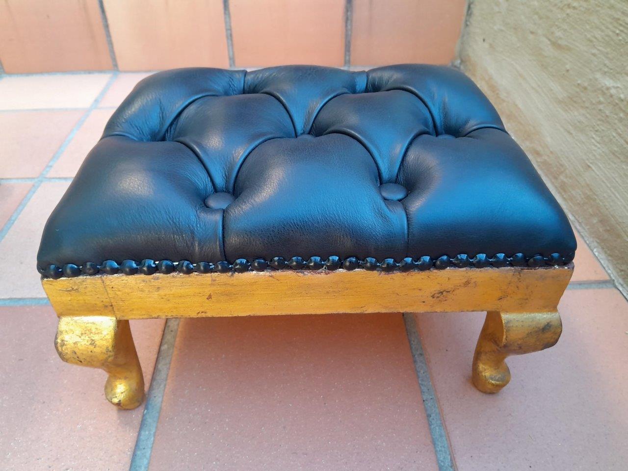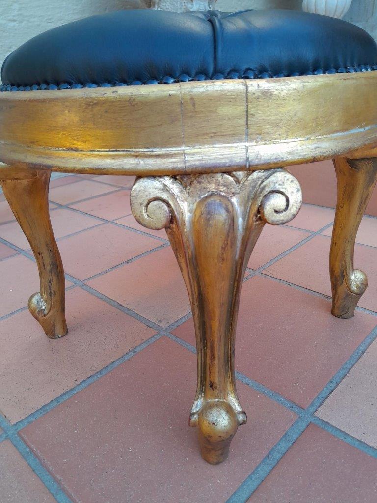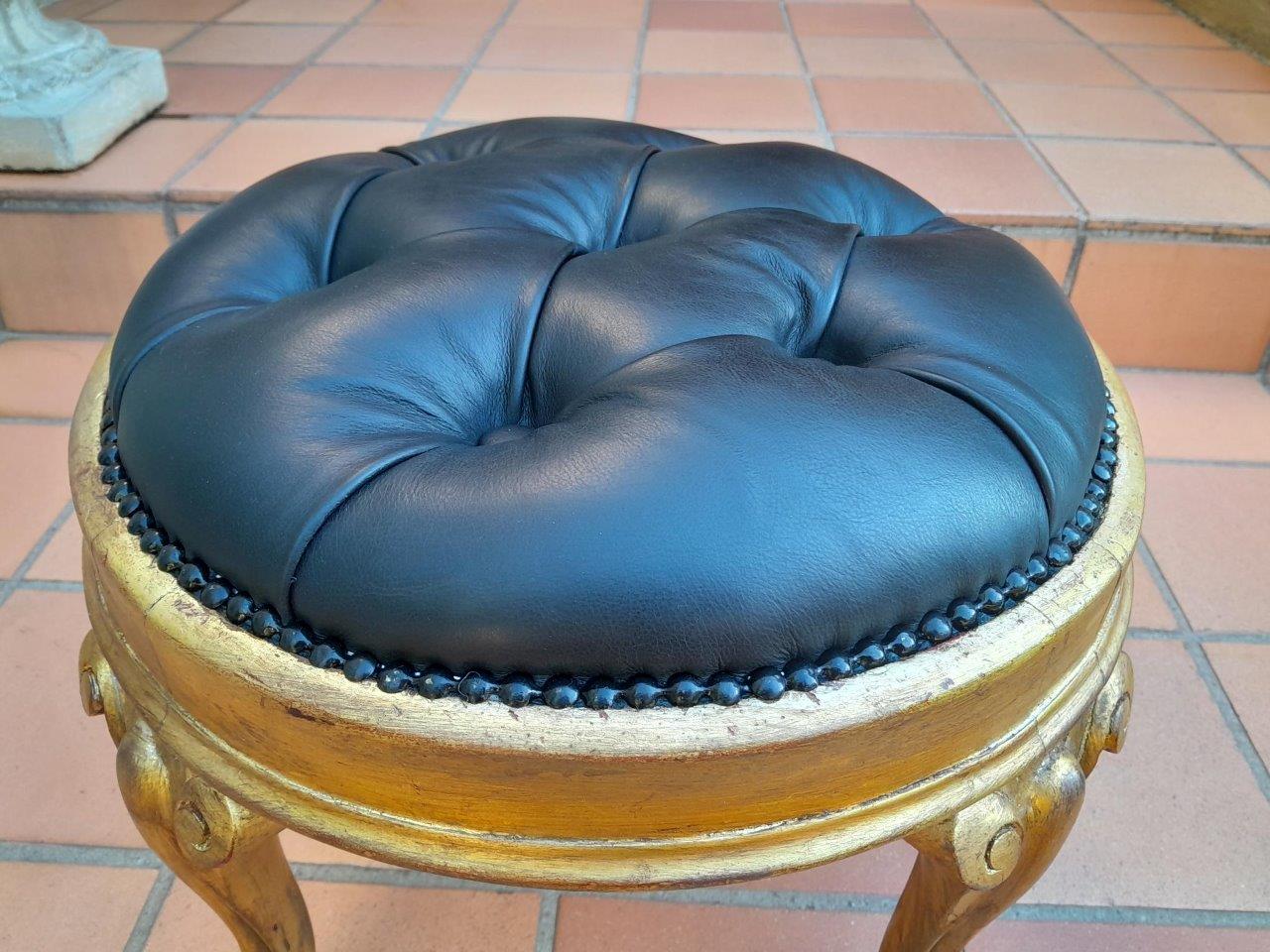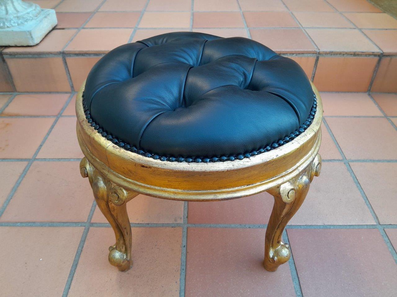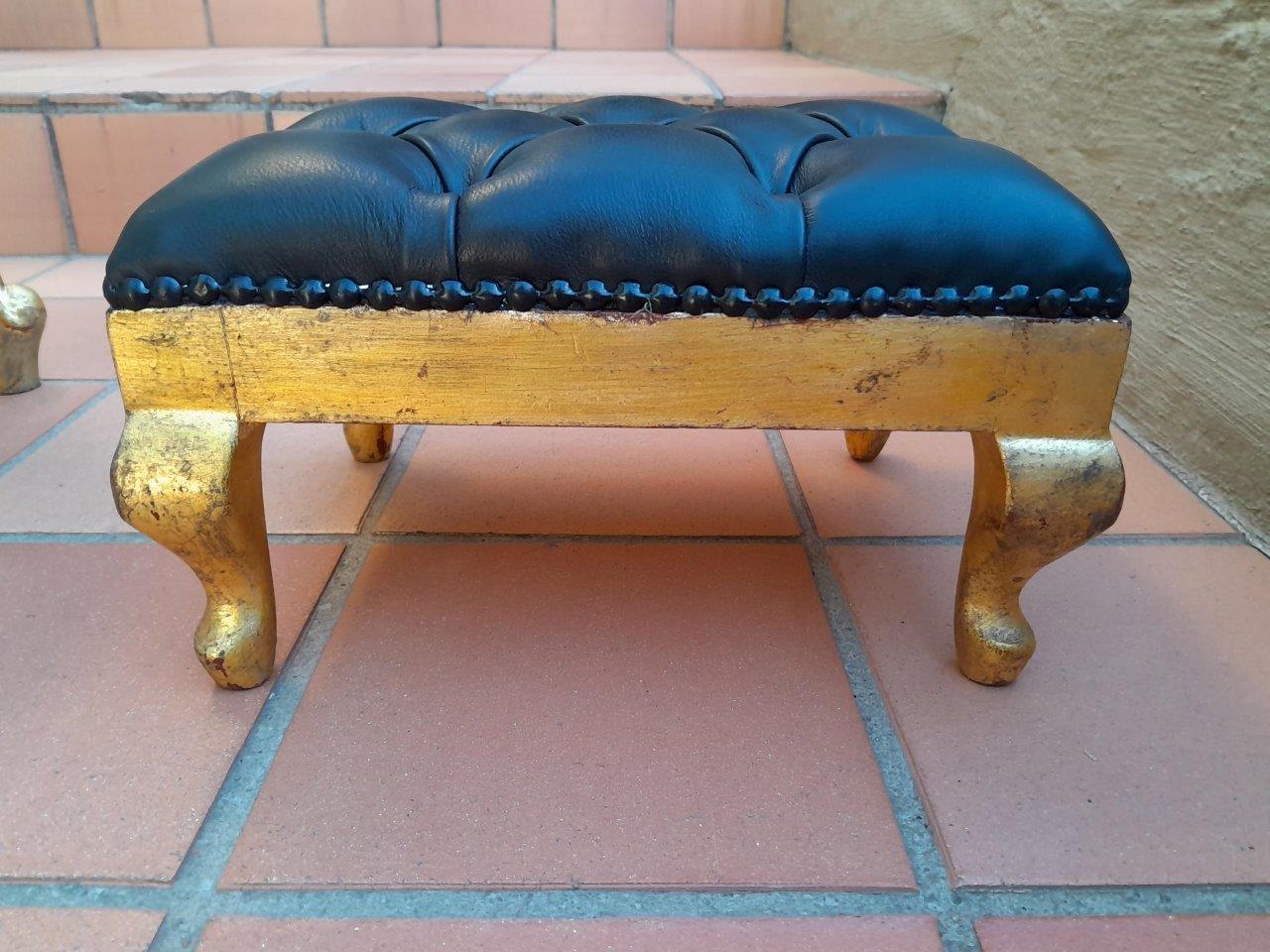 A Victorian Circa 1920 Set of Two Mahogany Foot Stools in a Hand Gilded Finish and Upholstered in Deep Buttoned Leather