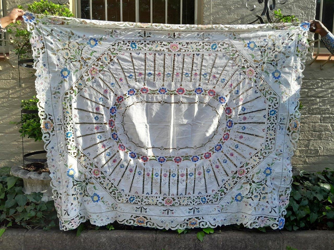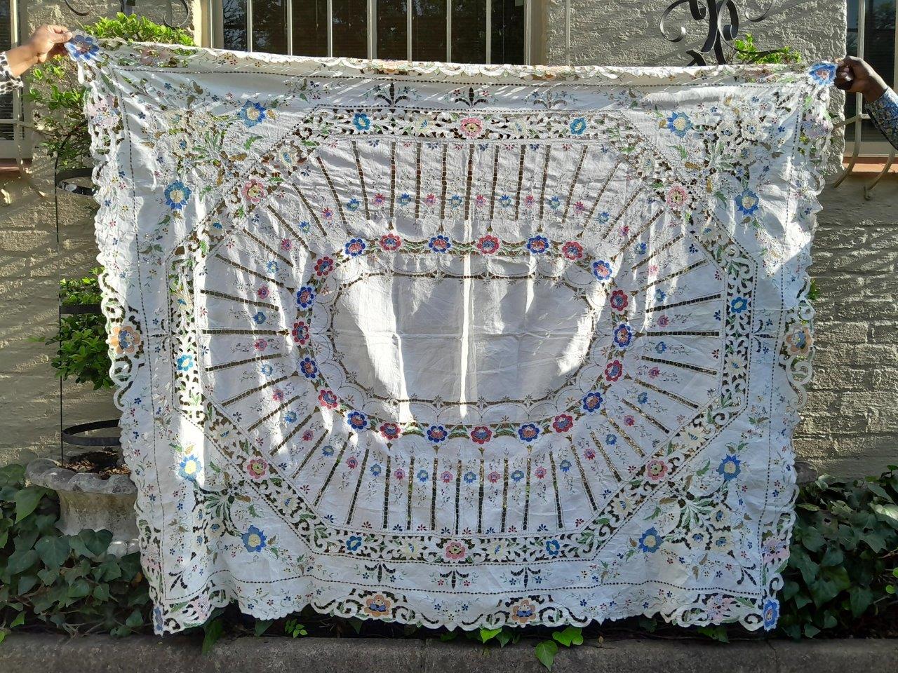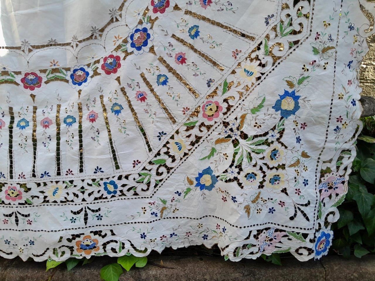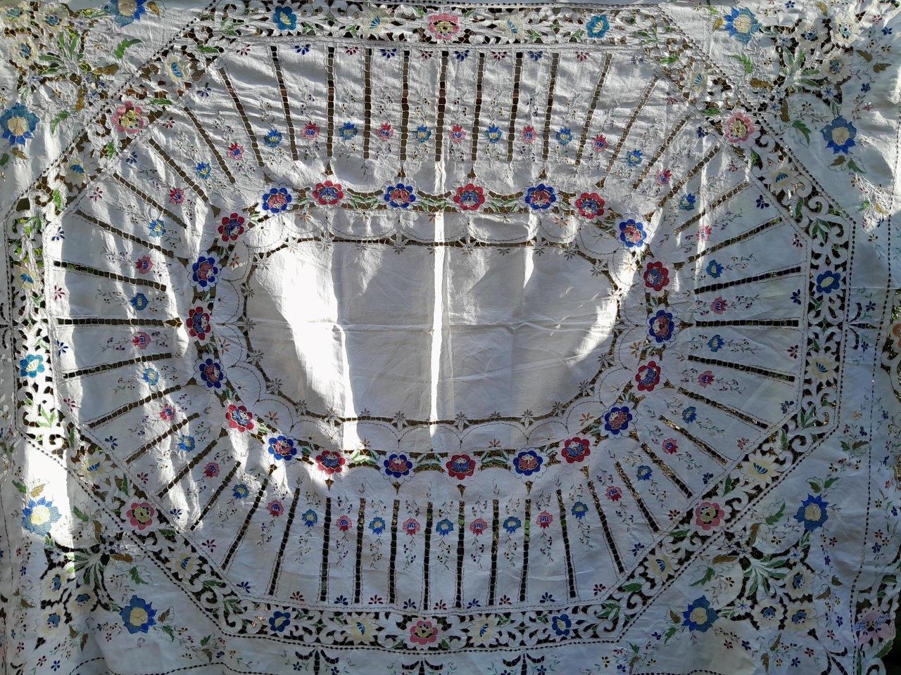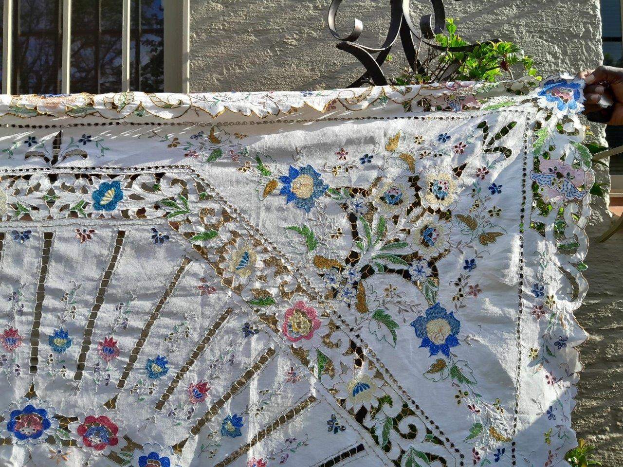 A Vintage Linen Madeira Floral Coloured And Hand Embroidered Unused Tablecloth