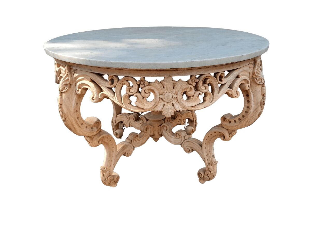 A20th Century Rococo Style Heavily Carved Teak Table with White Marble Top in a Contemporary Bleached Finish