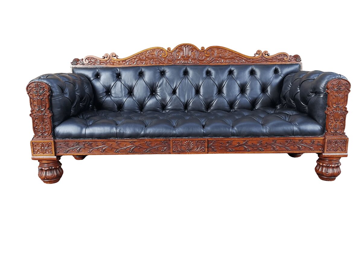An Anglo Indian Carved Rosewood and Teak settee with brass castors