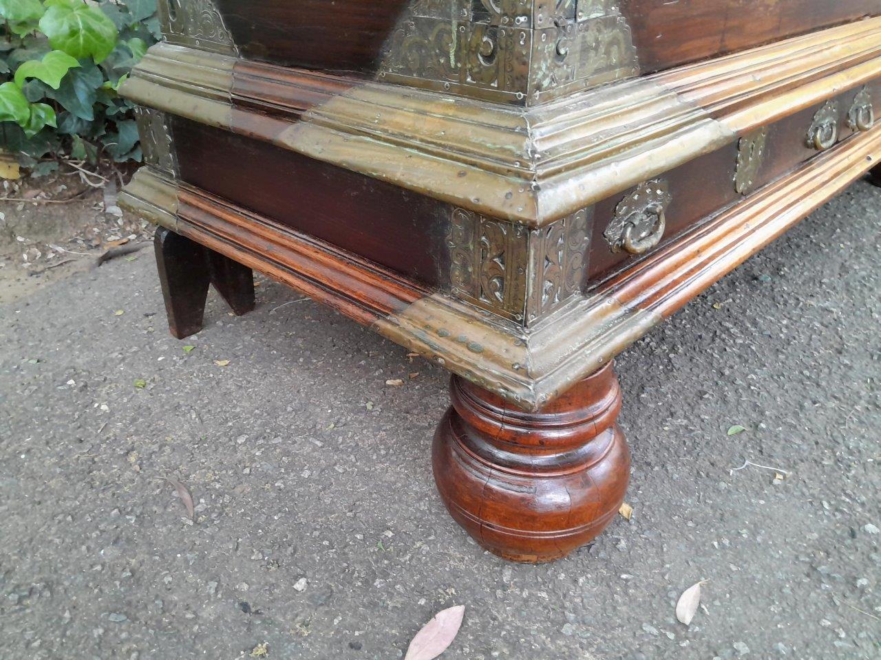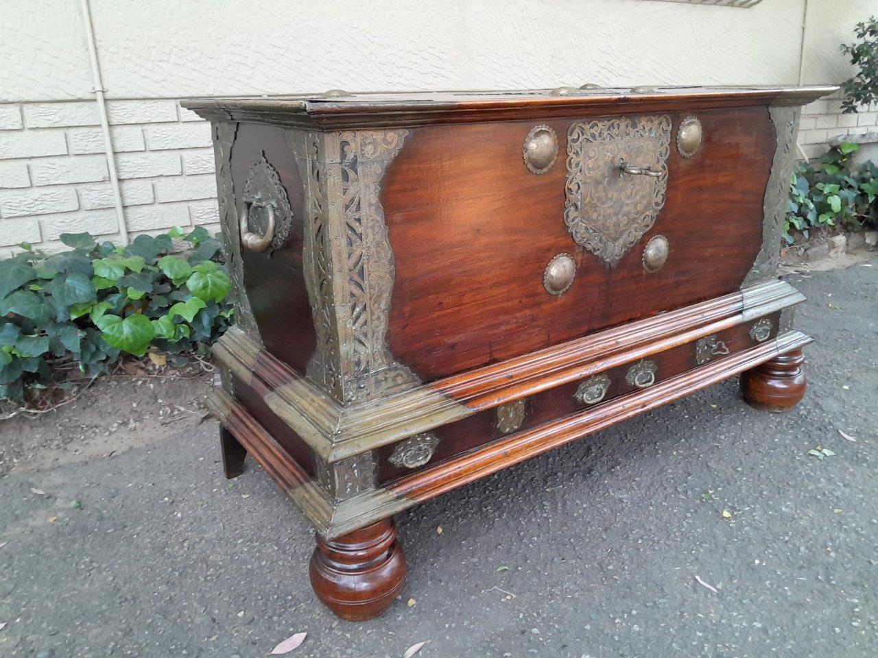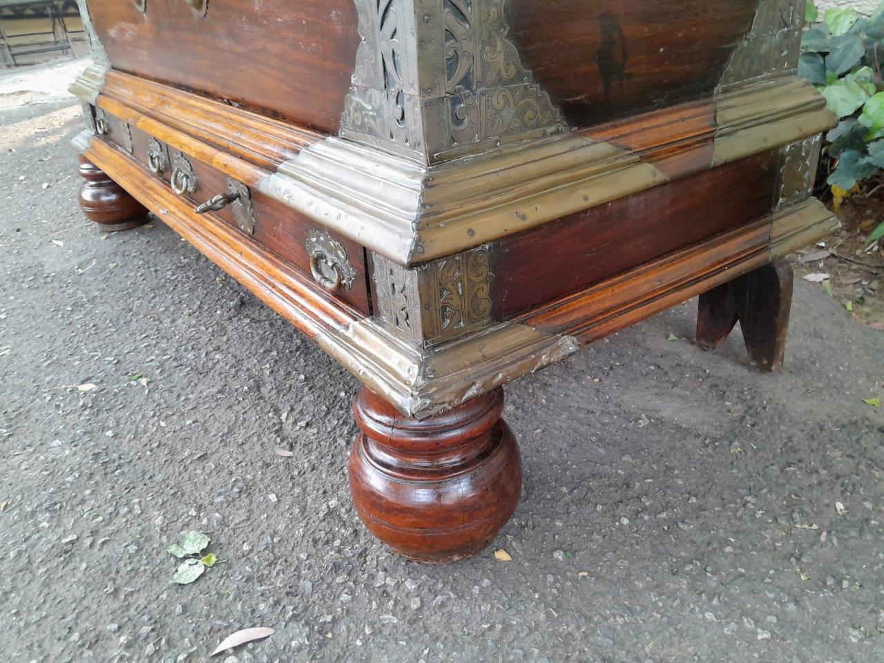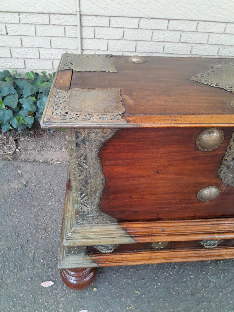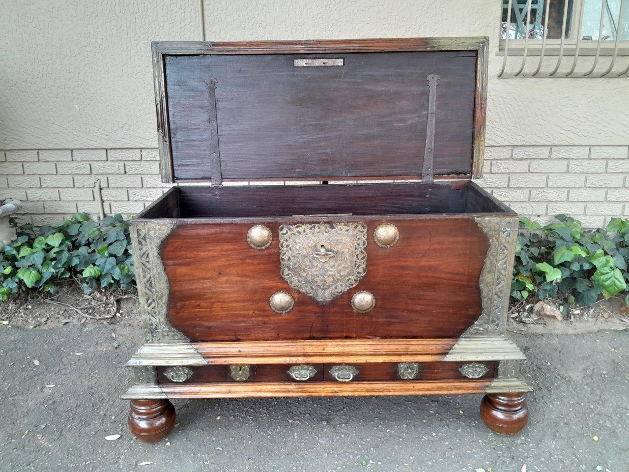 An Antique 18th Century Dutch Batavian Colonial Teak And Padouk Chest With Two Drawers,,Brass Mounts, Large Key And Handles