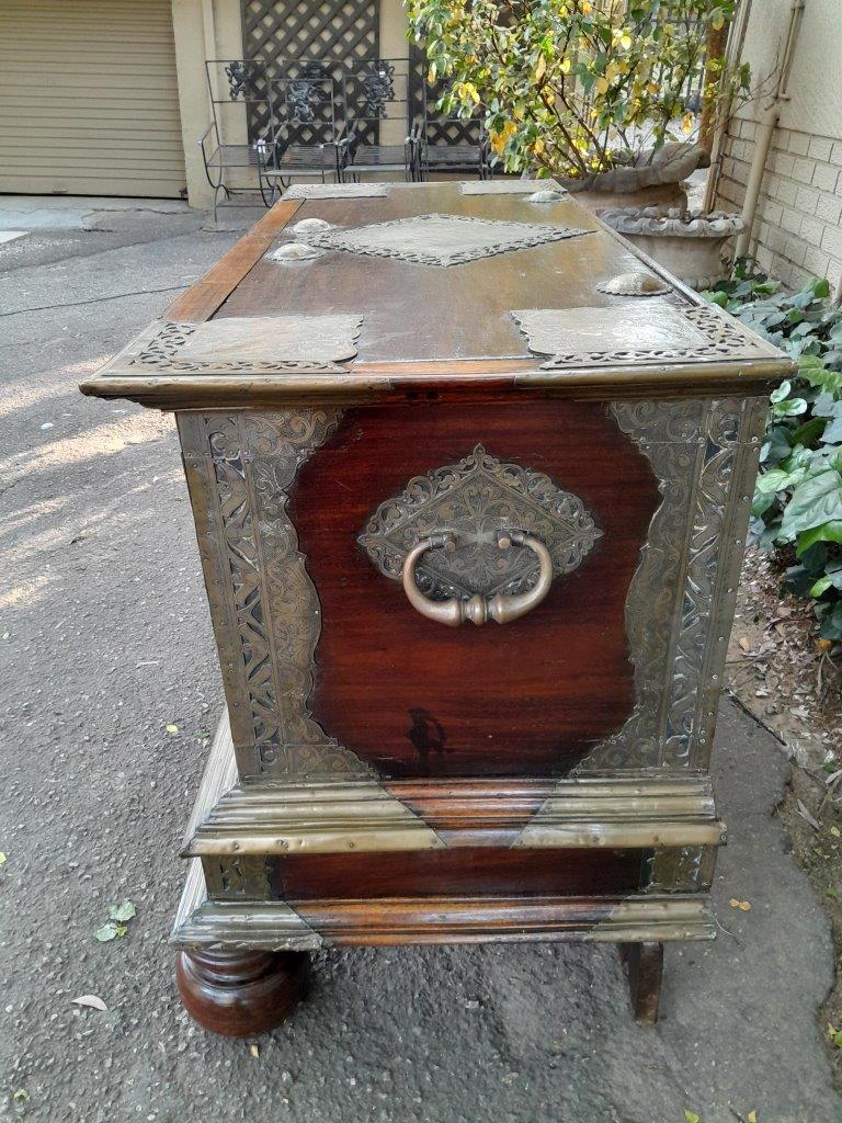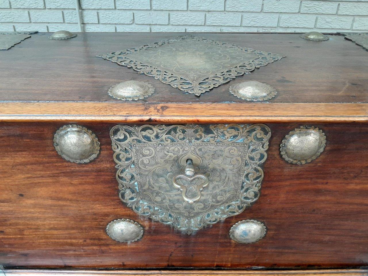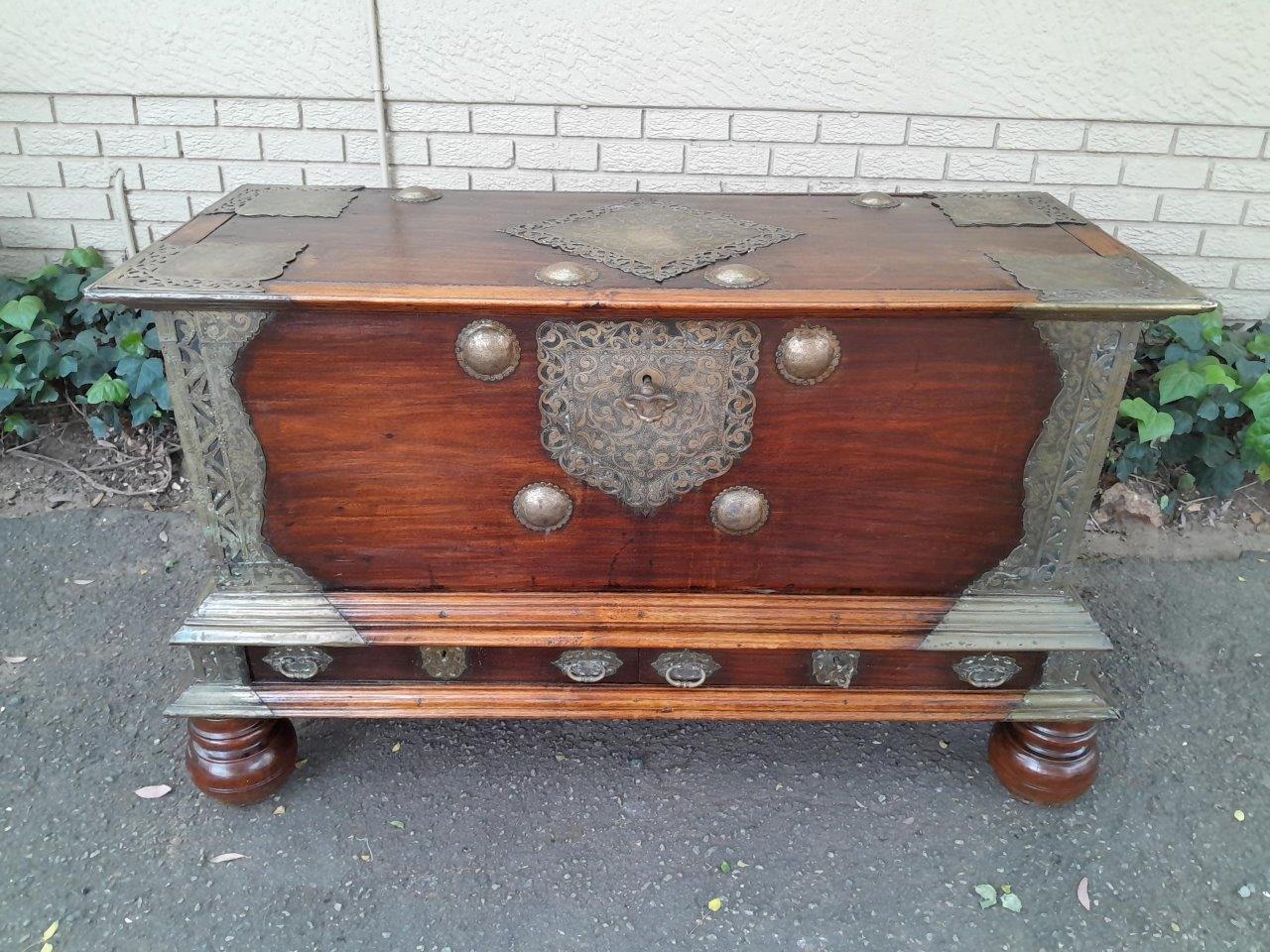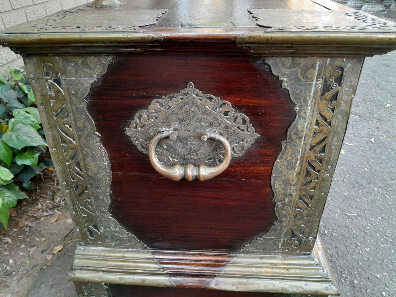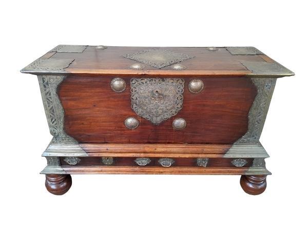 An Antique 18th Century Dutch Batavian Colonial Teak And Padouk Chest With Two Drawers,,Brass Mounts, Large Key And Handles