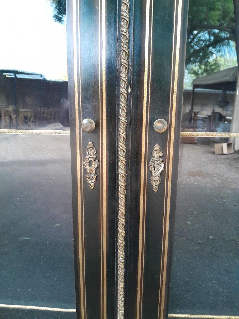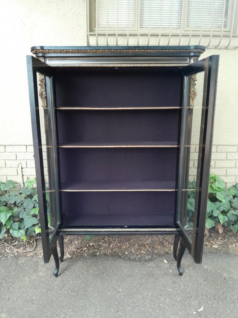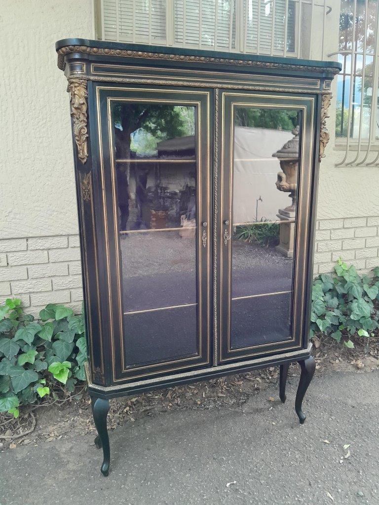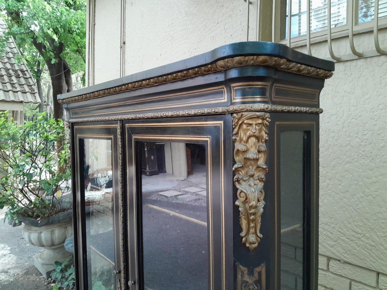 An Antique 19th Century Ebonised Cabinet With Inlay And Gilt Metal Glazed Doors