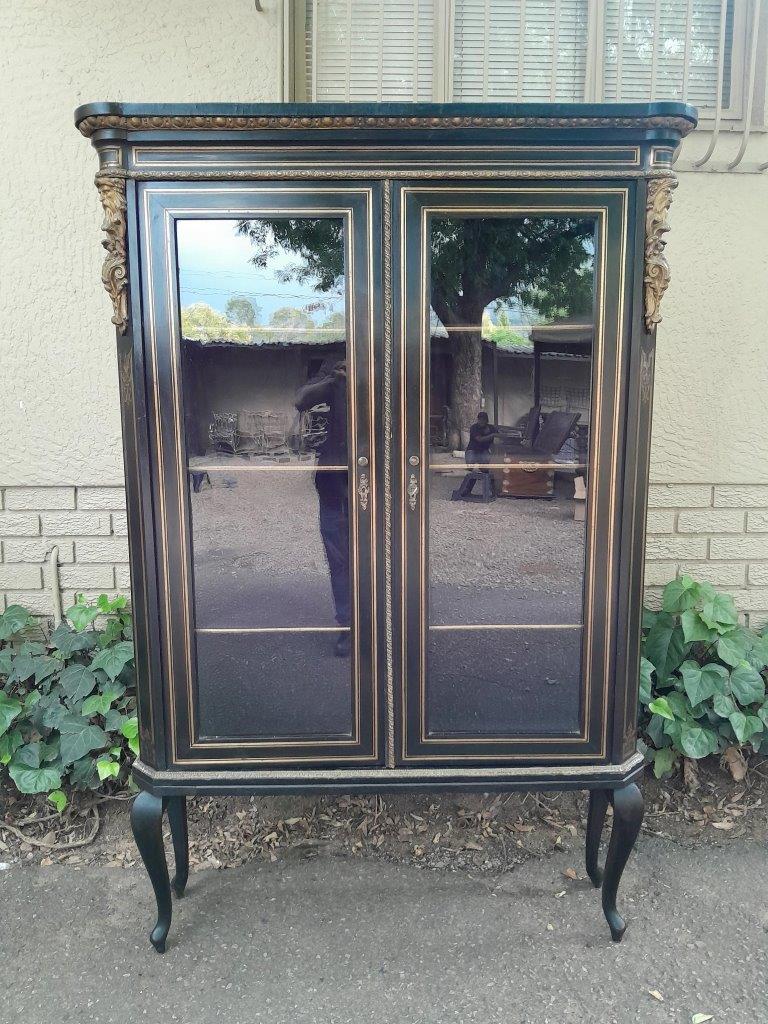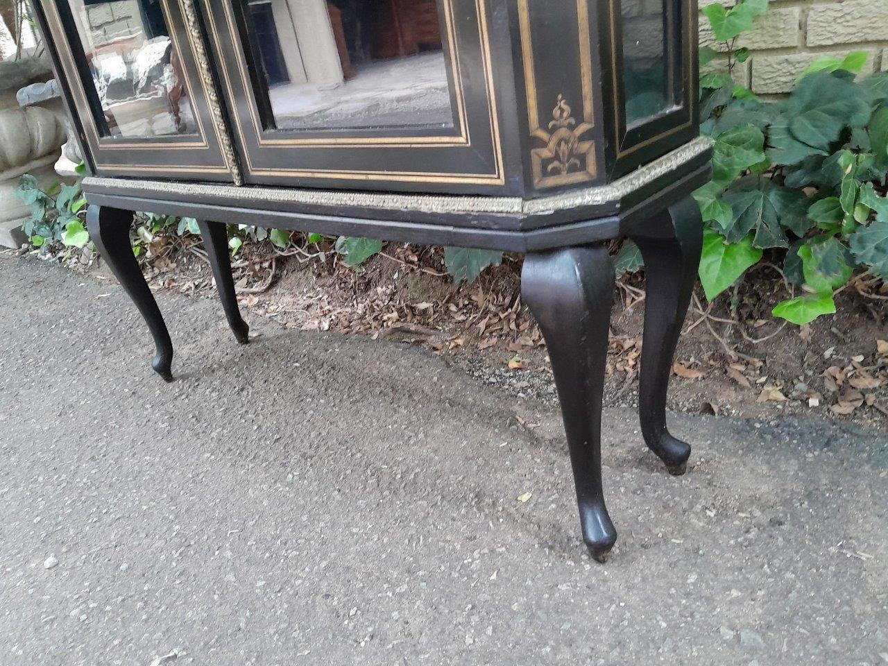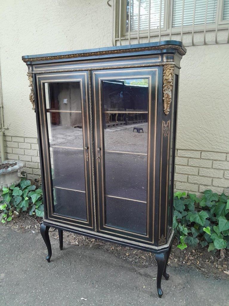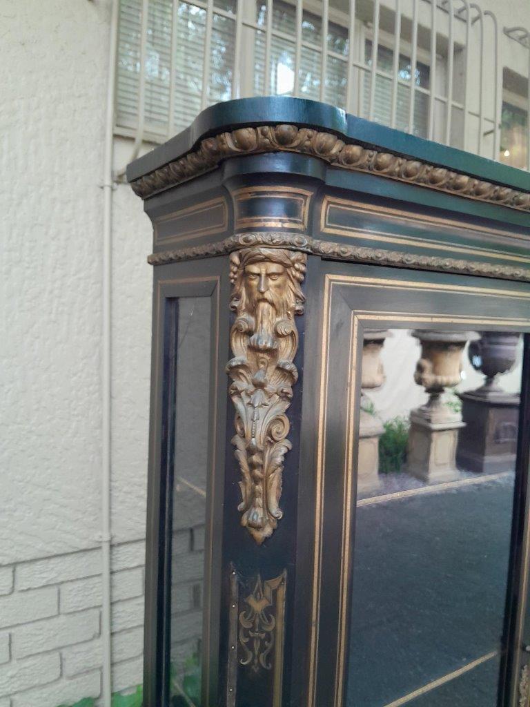 An Antique 19th Century Ebonised Cabinet With Inlay And Gilt Metal Glazed Doors