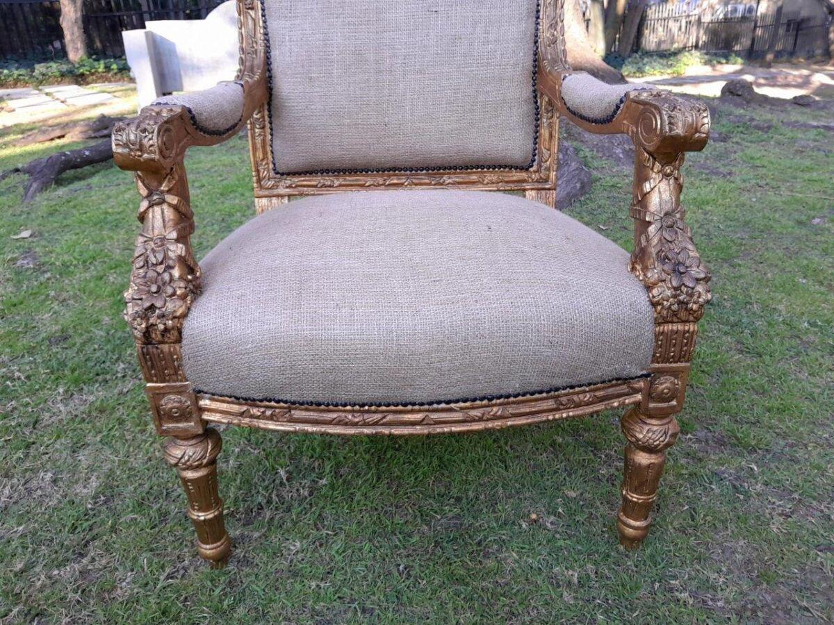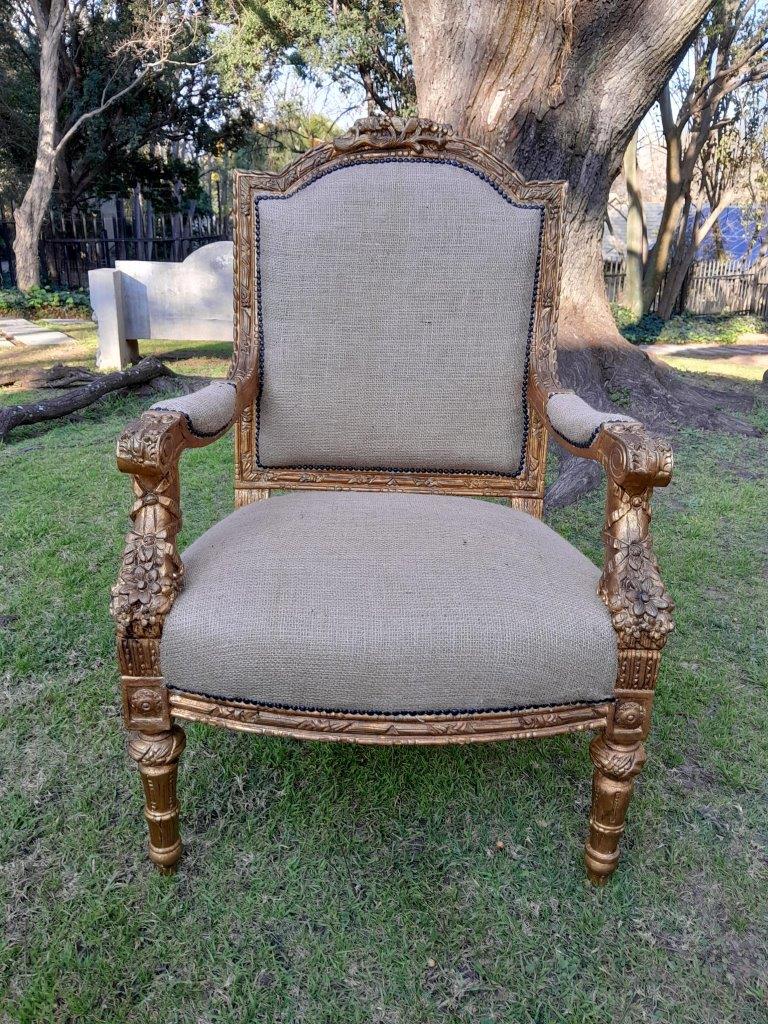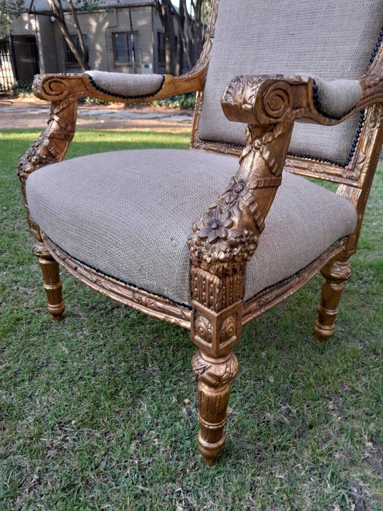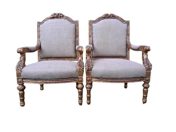 An Antique 19th Century French Pair of Louis XV Style Heavily Carved Giltwood Armchairs