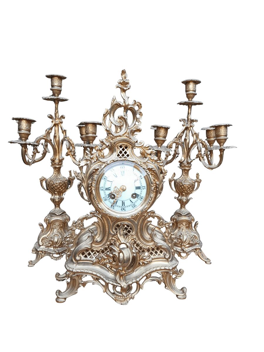 An Antique 19th Century French Rococo Gilt Ormolu Clock Garniture Set with a Pair of Matching Candelabras