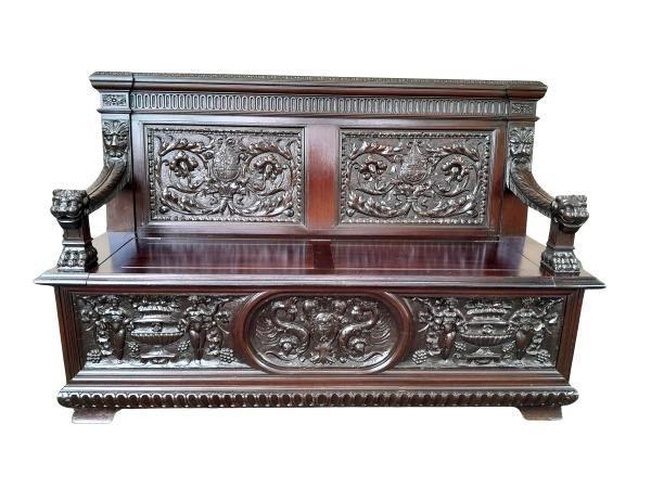 An Antique 19th Century Large And Ornately Carved Oak Bench