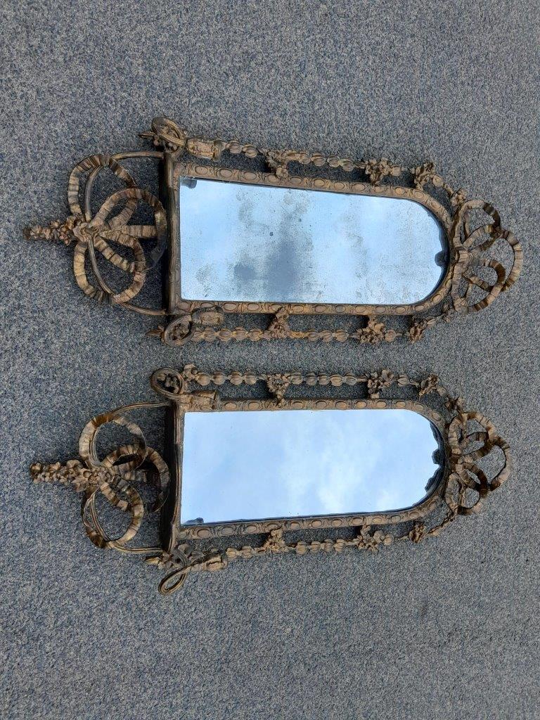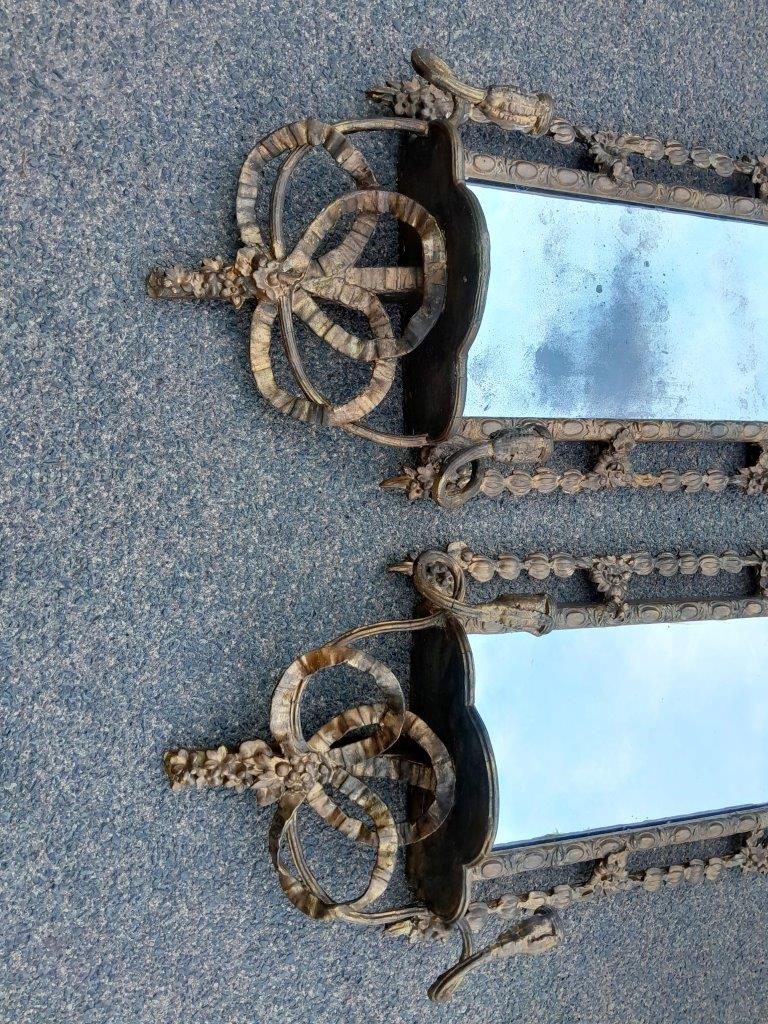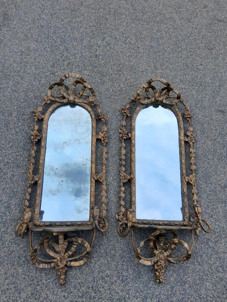 An Antique 19th Century Pair Of French Carved Giltwood Louis XV Style Mirrors With Sconces And Shelves