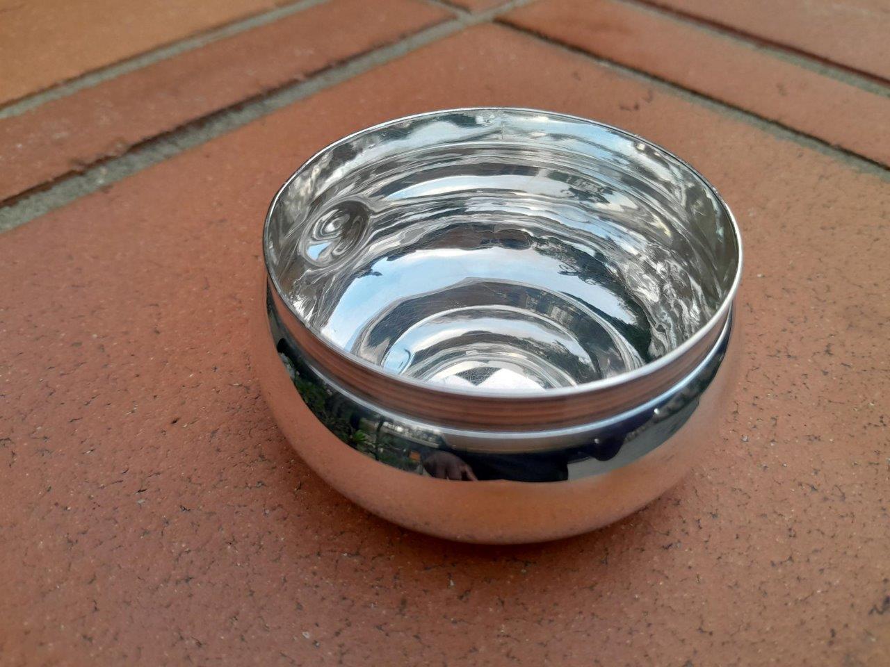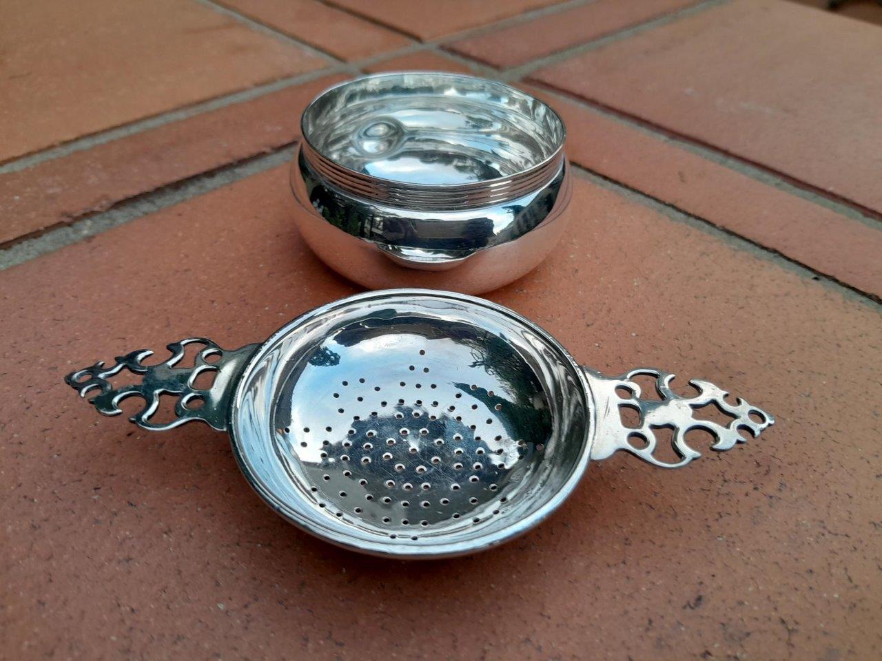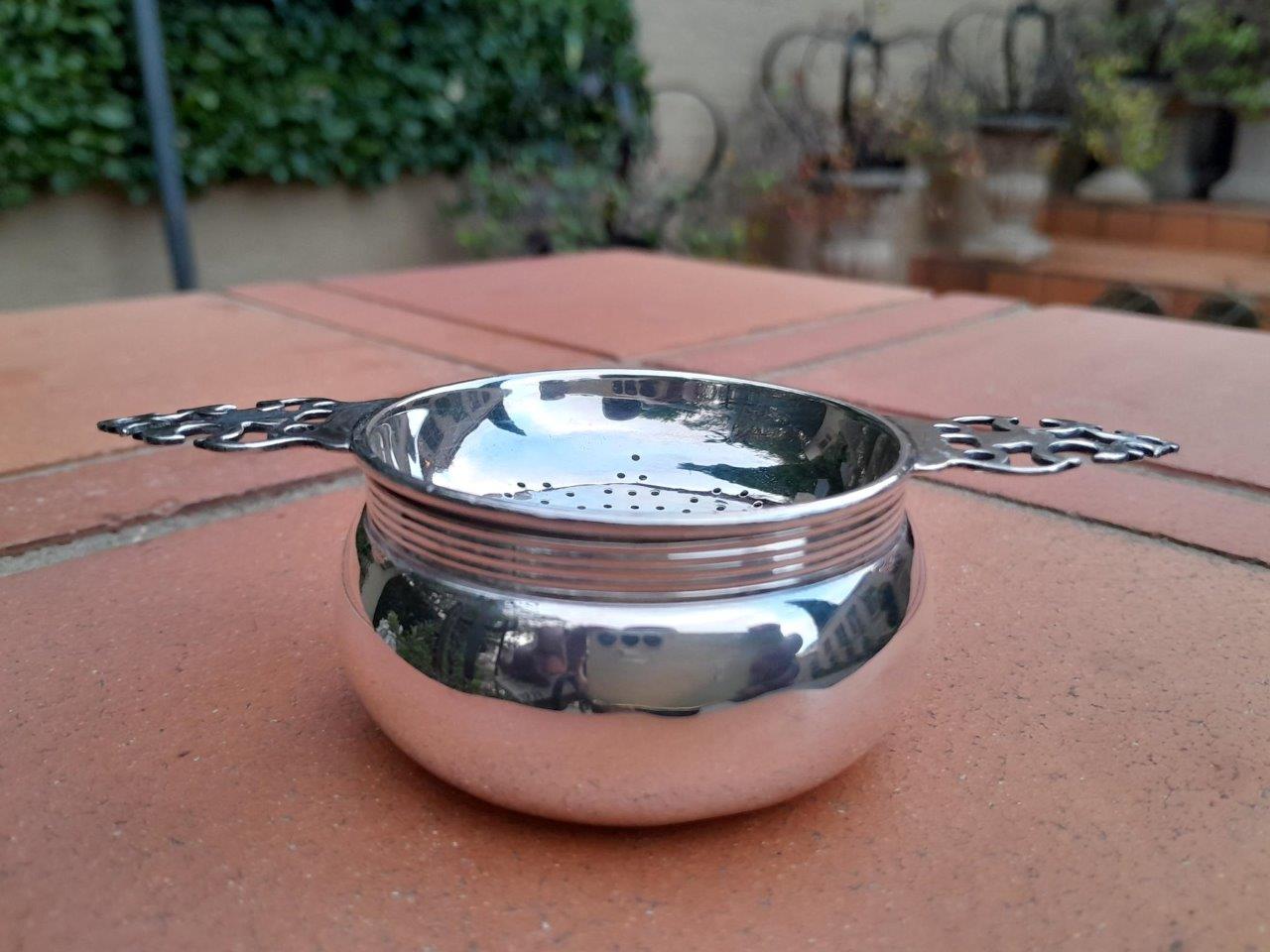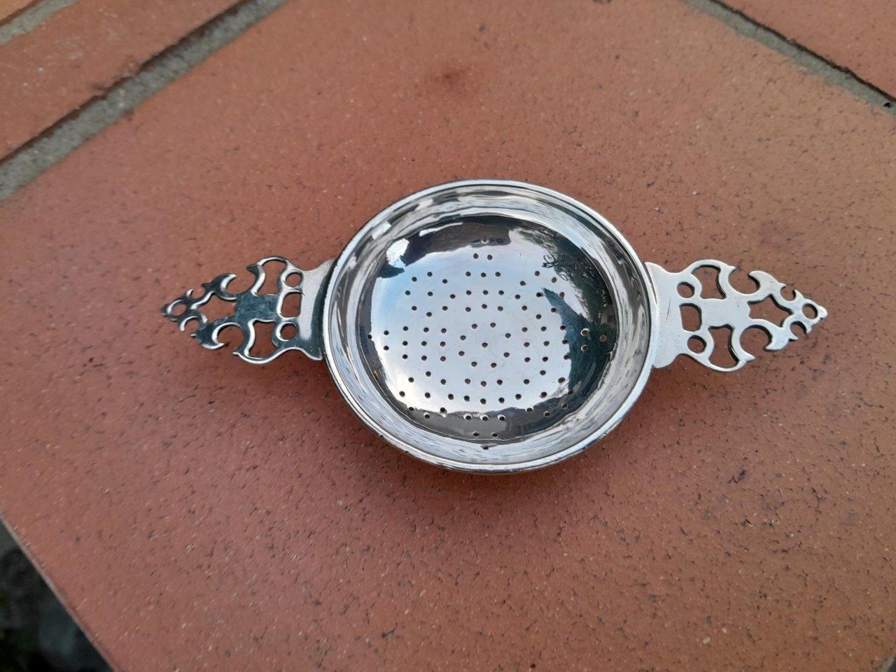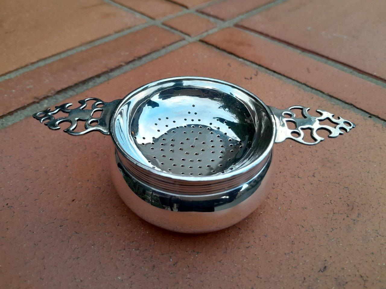 An Antique and Hallmarked Birmingham Silver Tea Strainer with Base ( weight 75g )