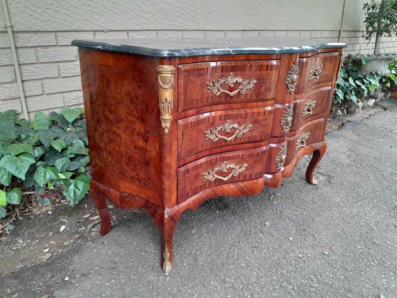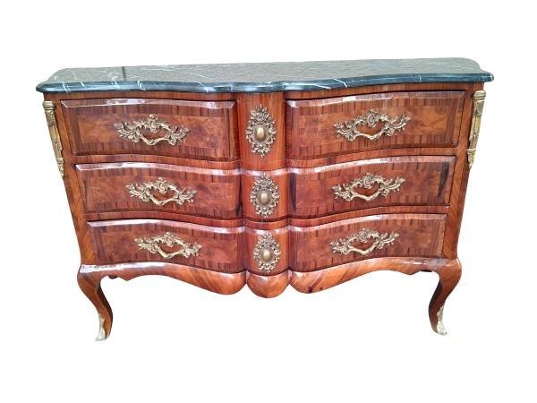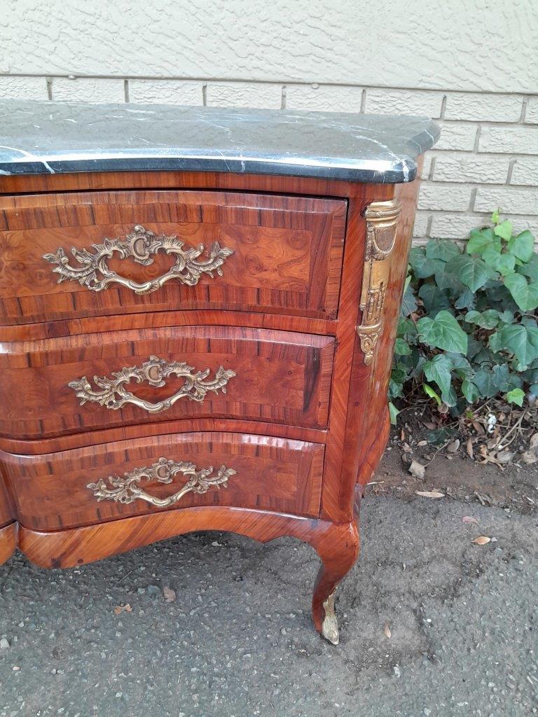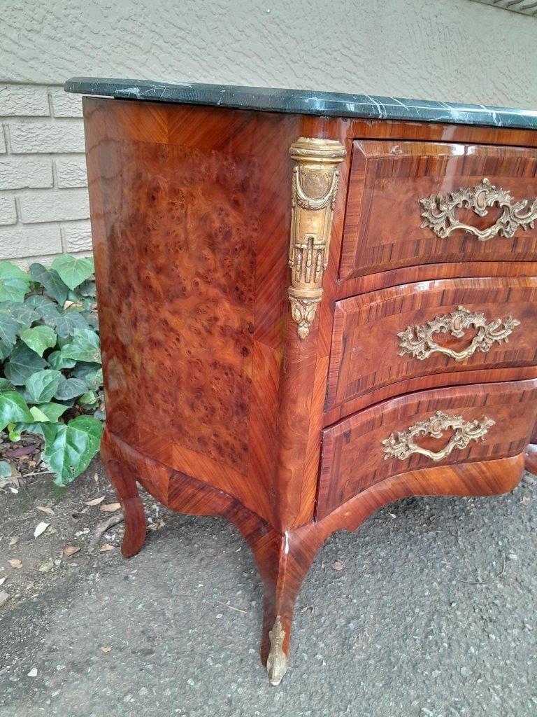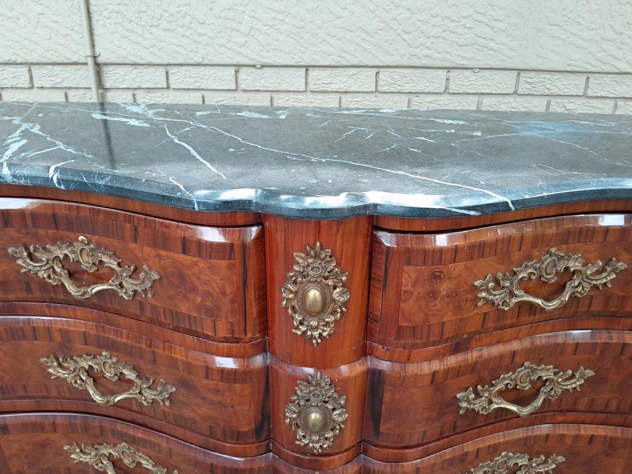 An Antique Circa 1920 French Style Louis XV Walnut Chest Of Drawers With Ormolu And Original Handles And Marble Top