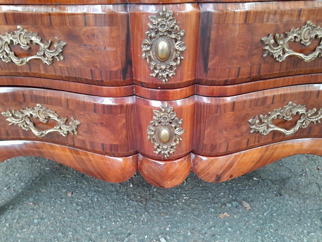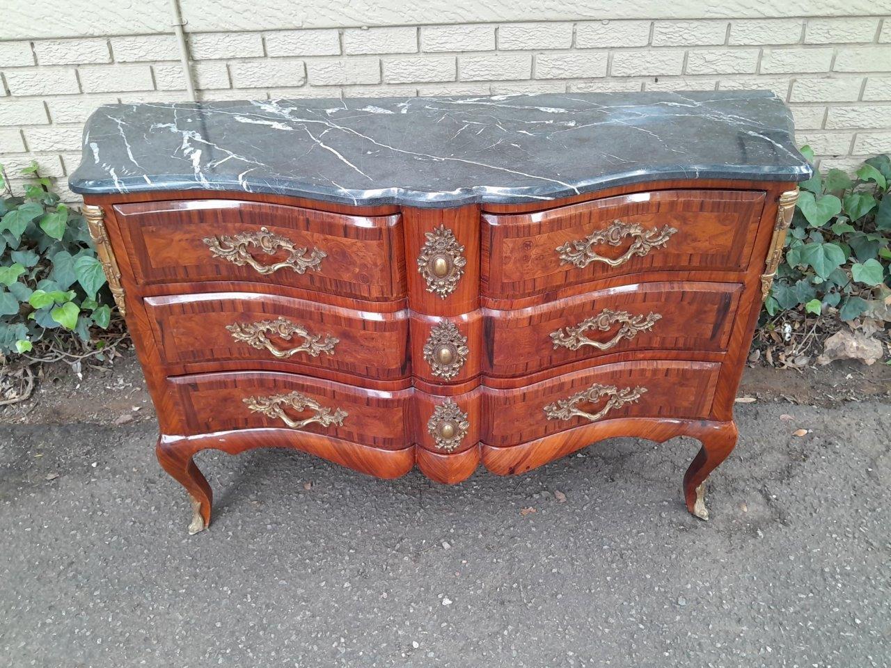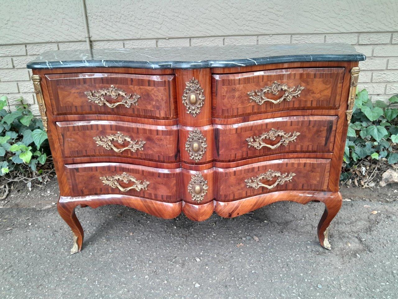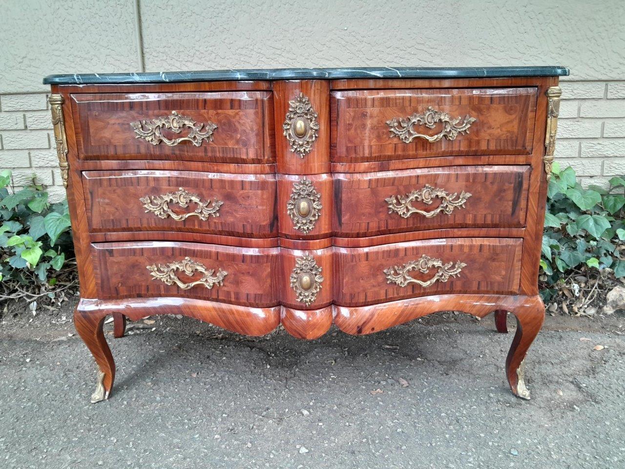 An Antique Circa 1920 French Style Louis XV Walnut Chest Of Drawers With Ormolu And Original Handles And Marble Top