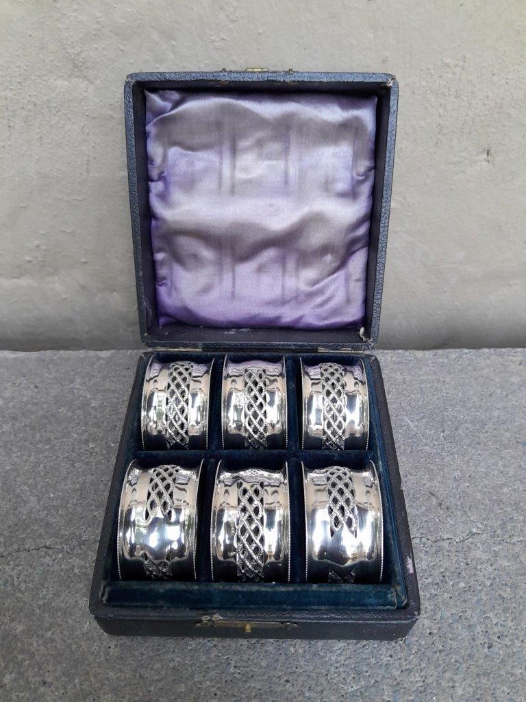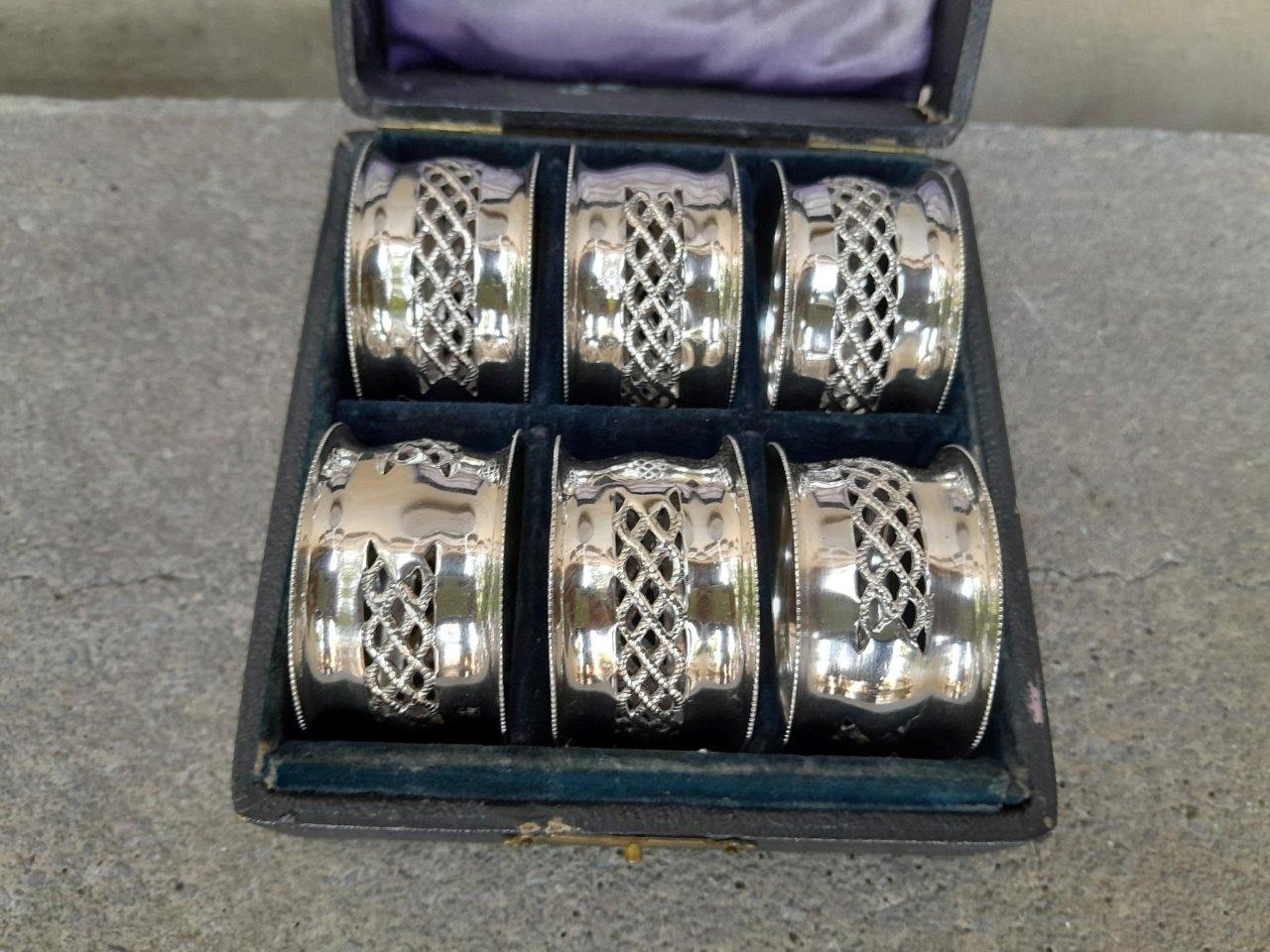 An Antique Circa Early 1900’s English Set Of Six Silver Napkin / Serviette Rings In Original Box (120 + – Grams Of Silver)