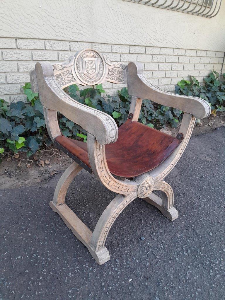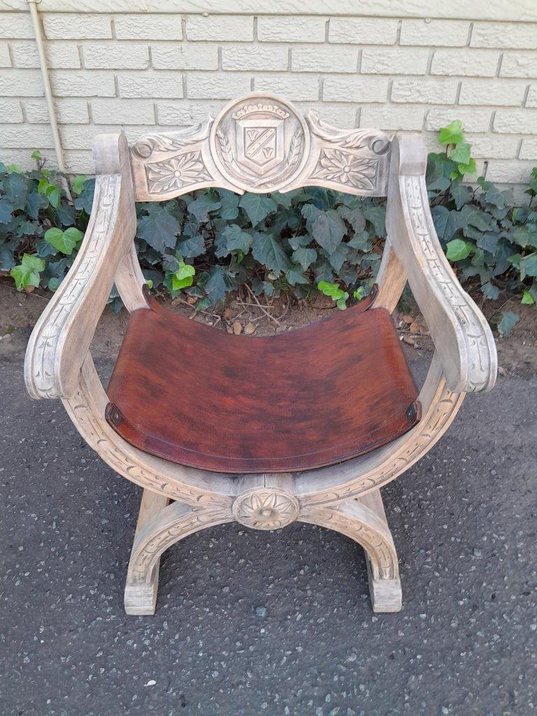 An Antique Early 20th Century Savonarola Carved Oak Chair with Leather Seat in a Contemporary Bleached Finish