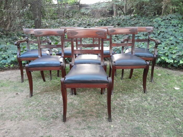 An Antique Late 18th / Early 19th Regency Set of Eight Mahogany Dining Chairs Upholstered inleather. Comprising: A pair of Carvers and Six Side Chairs
