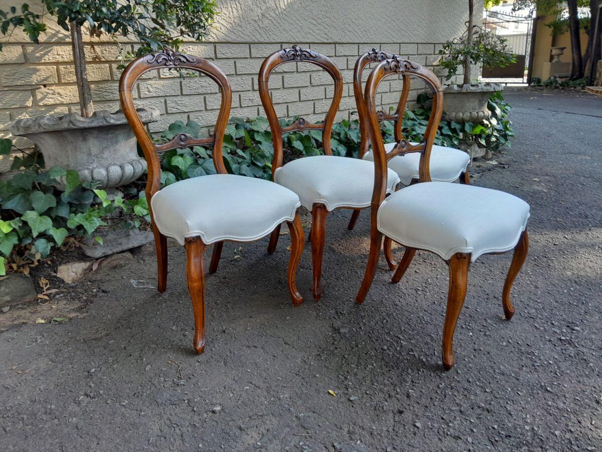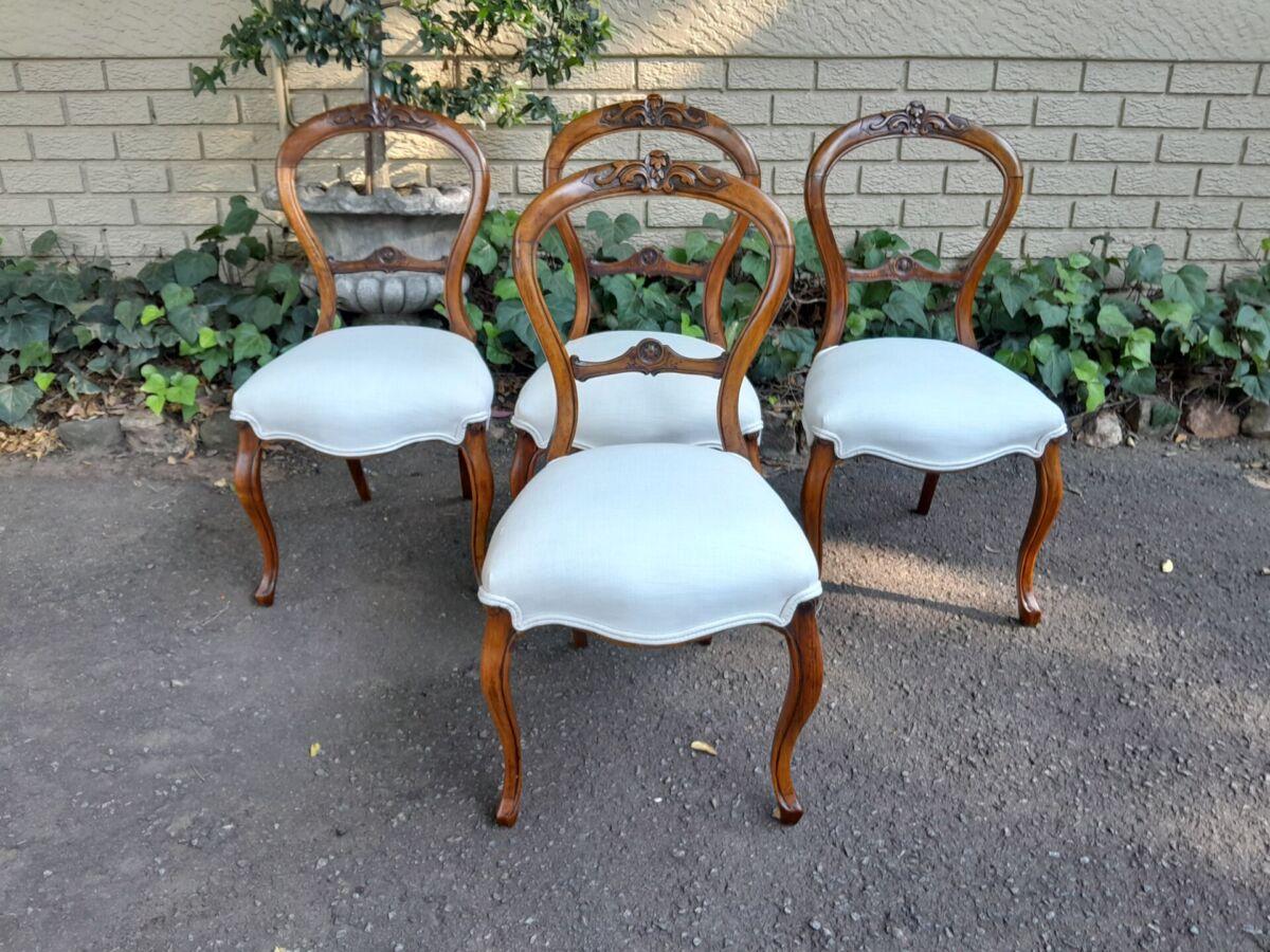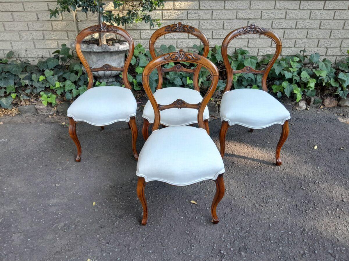 An Antique/Mid-Victorian Set Of Four Walnut Carved Balloon Back Chairs Upholstered In An Ivory Linen