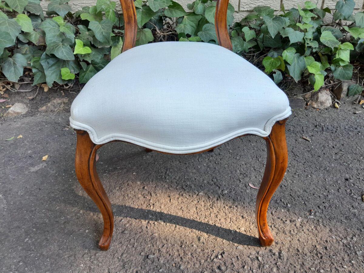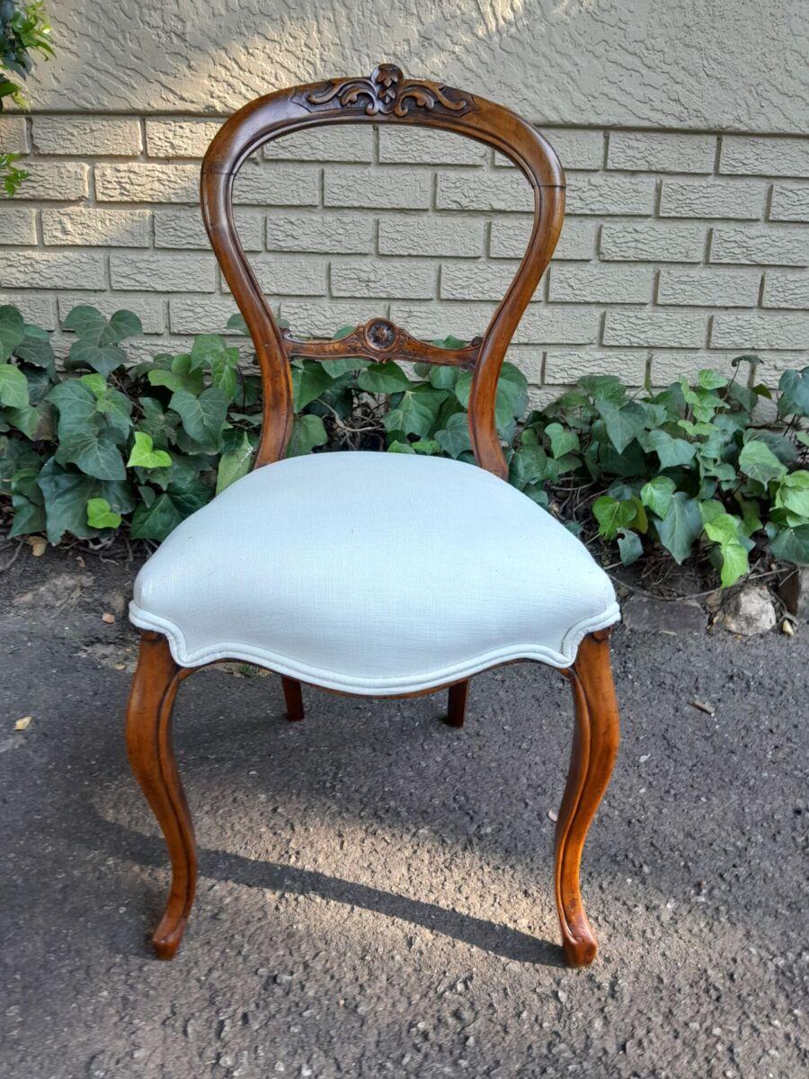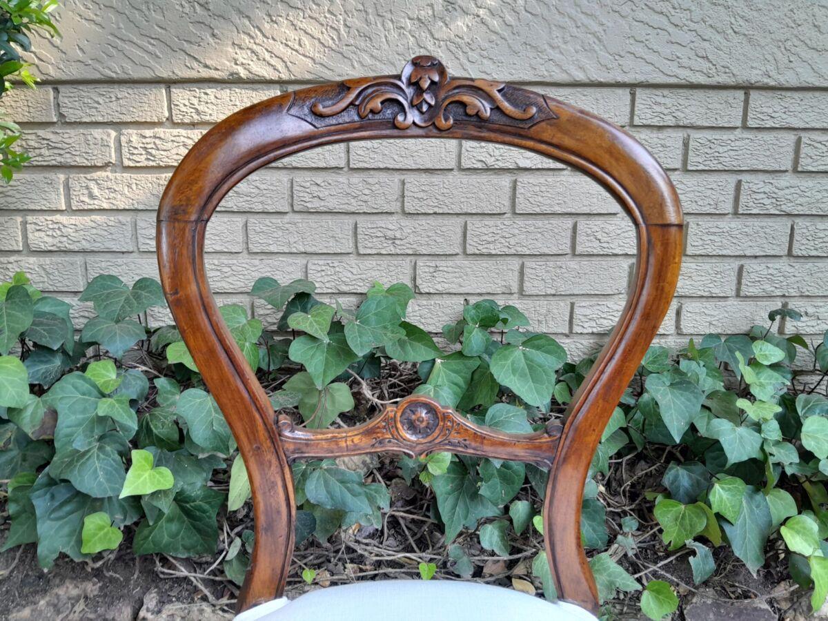 An Antique/Mid-Victorian Set Of Four Walnut Carved Balloon Back Chairs Upholstered In An Ivory Linen