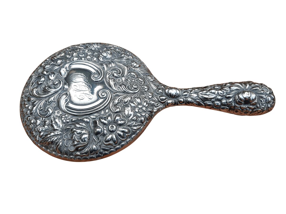 An Antique Repoussé Sterling Silver Hand Held Mirror with signed initials “HDD”
